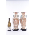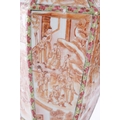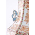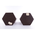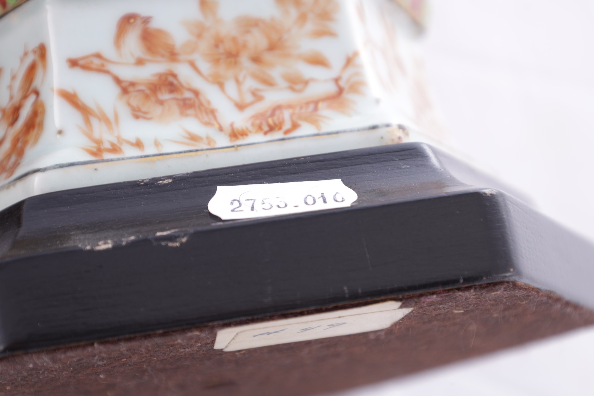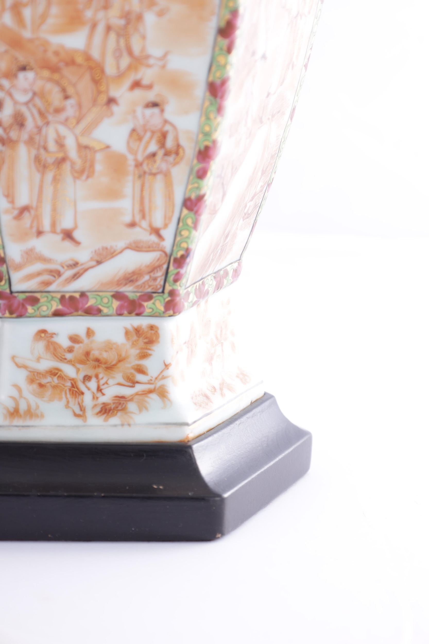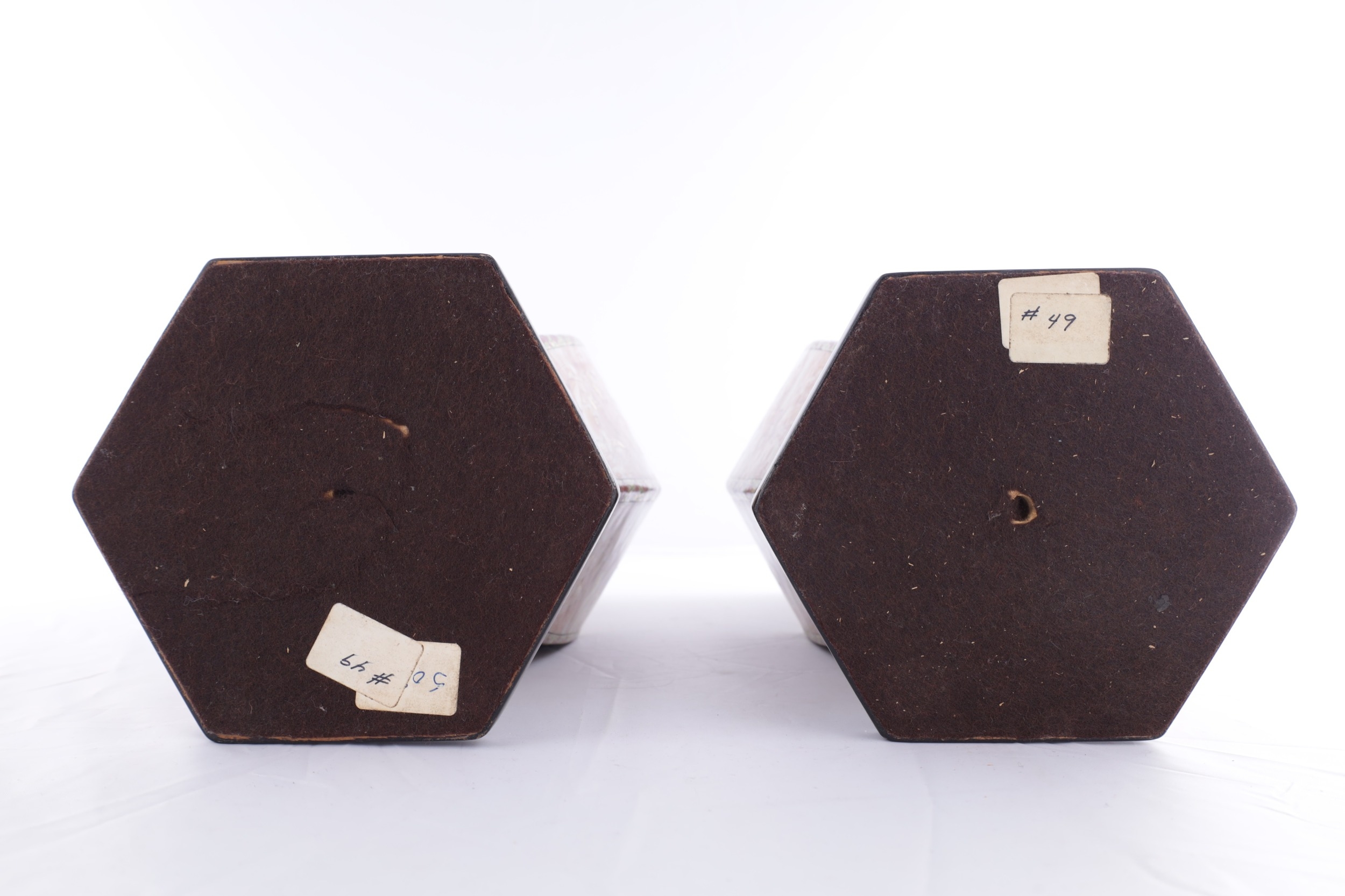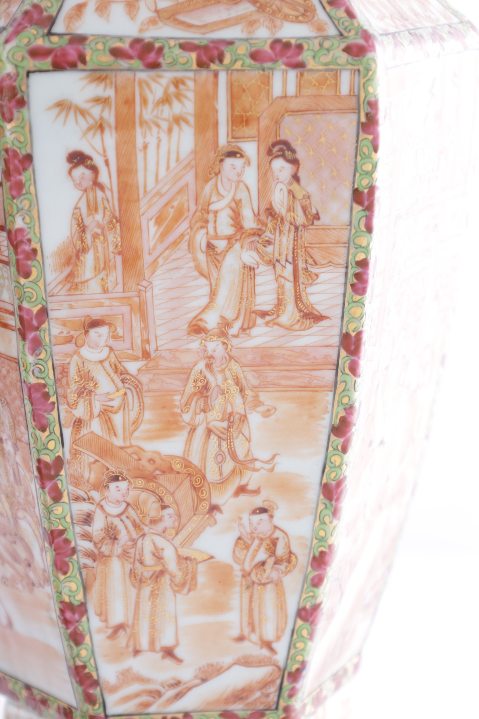 A PAIR OF 18TH CENTURY CANTONESE CHINESE VASES of hexagonal form with shaped side handles, decorated with figural garden scenes - on ebonised wooden bases (44cm high )