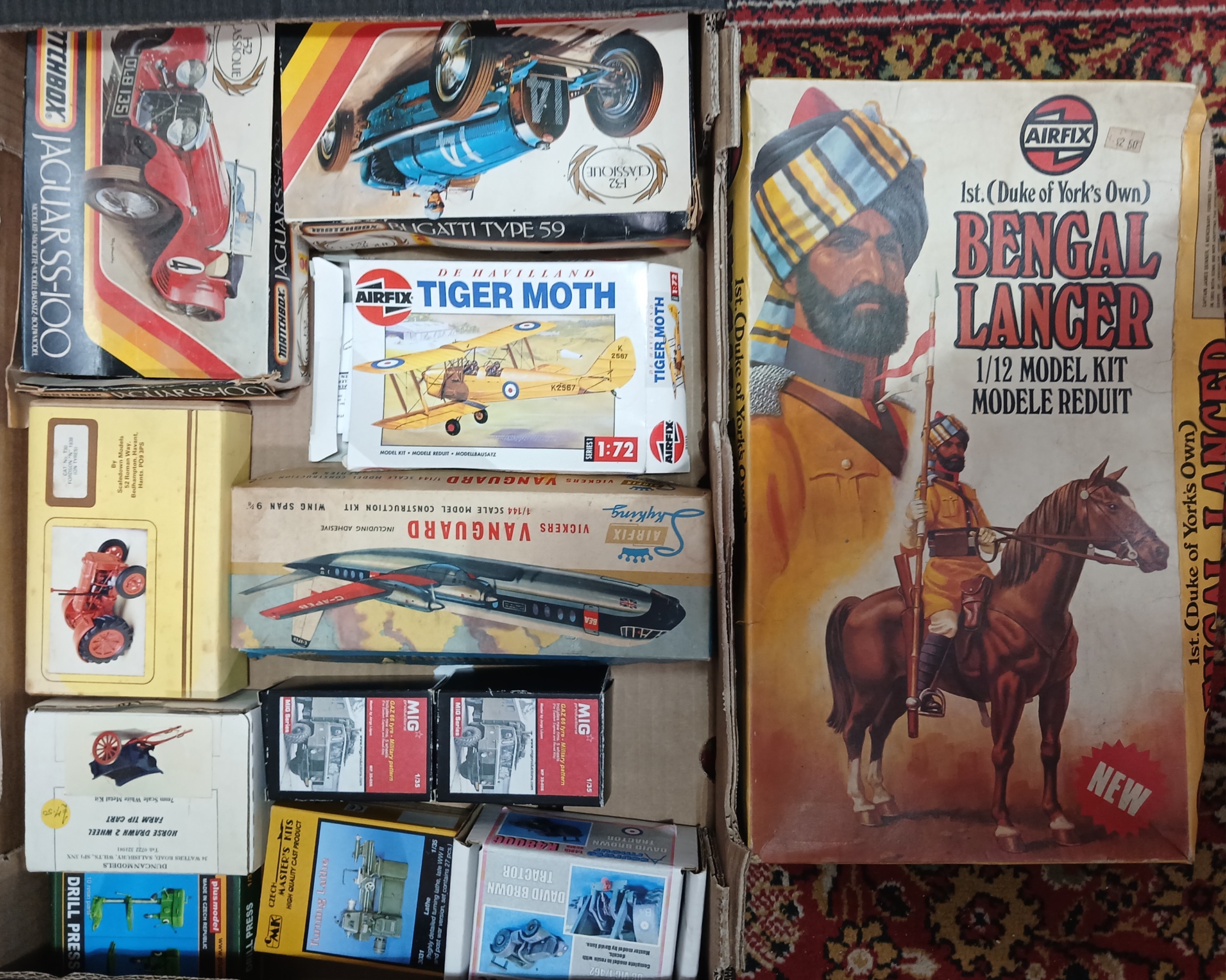 A box of unbuilt model kits including Airfix, MAtchbox, Scal...