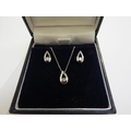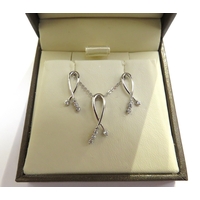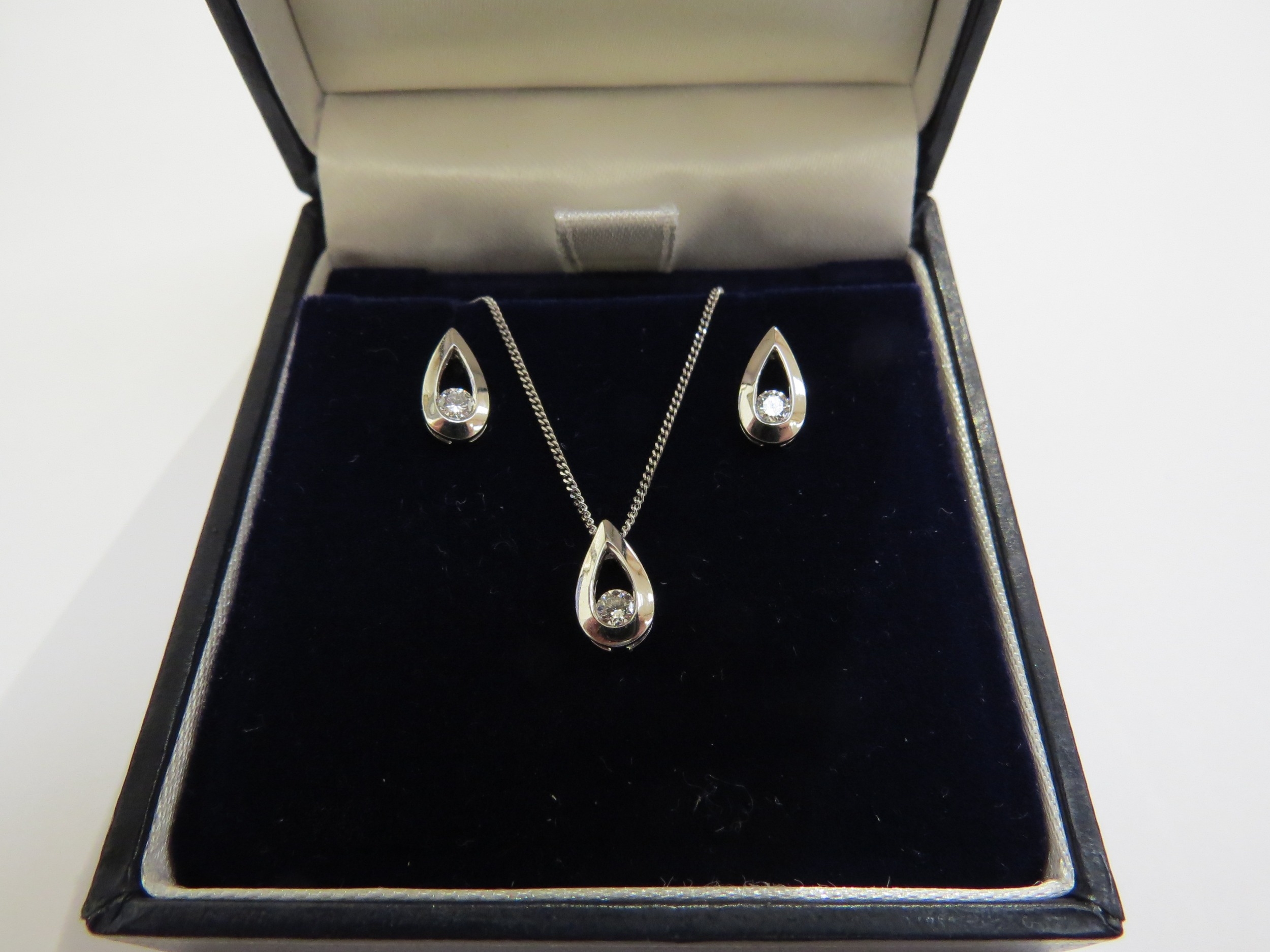 An 18ct white gold and diamond pendant hung on an 18ct gold chain, 45cm long with a pair of matching stud earrings, 3.7g total, in original Goldsmiths retail box