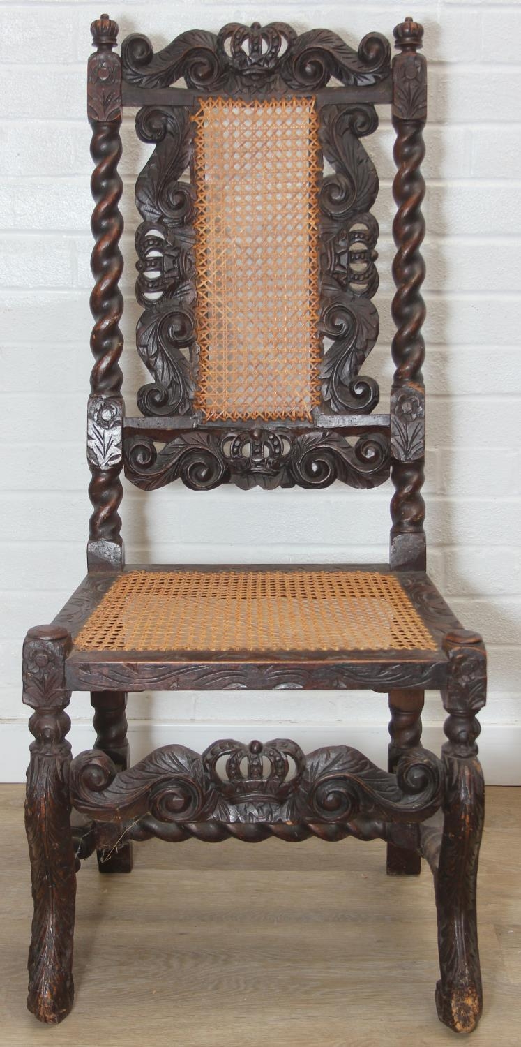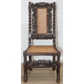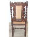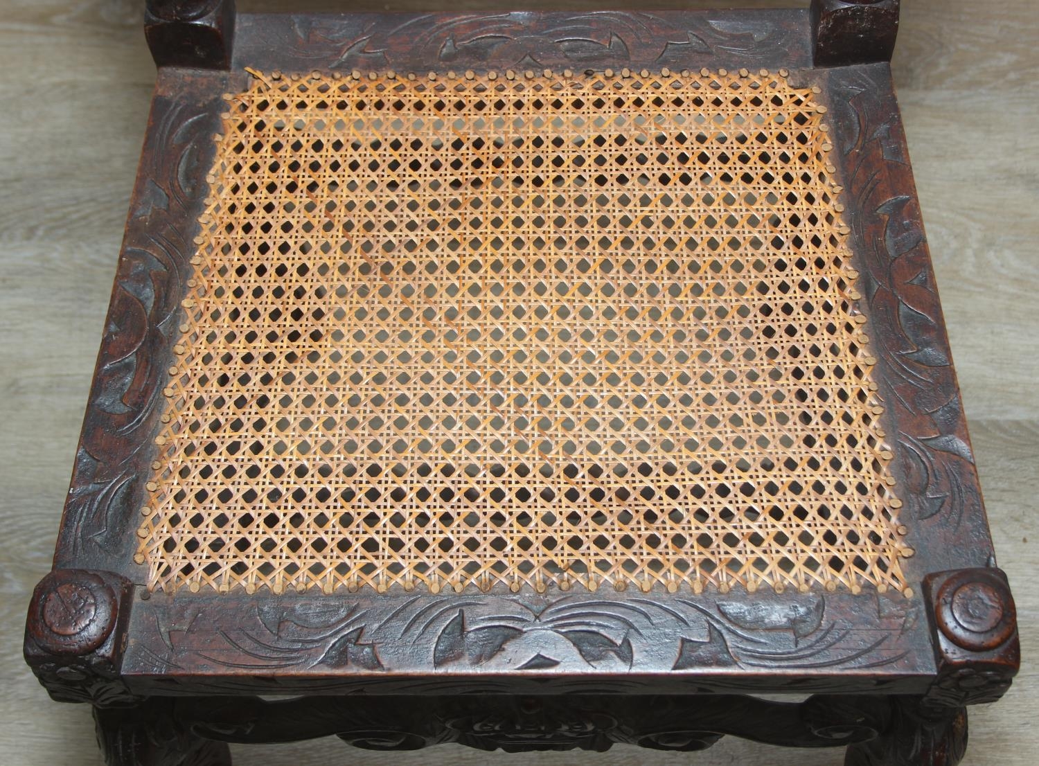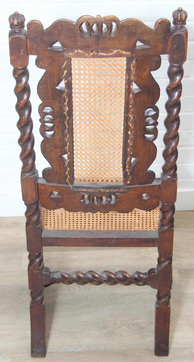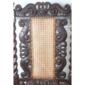 An antique Carolean style armchair with carved details and bergère seat and back, 110cm tall