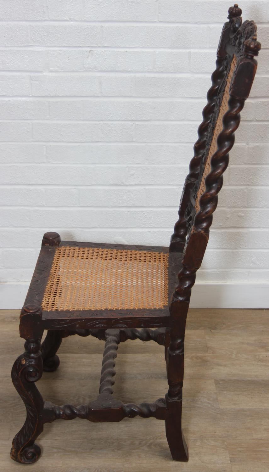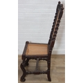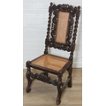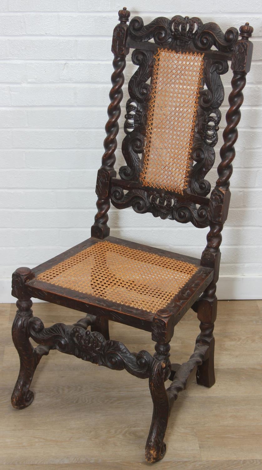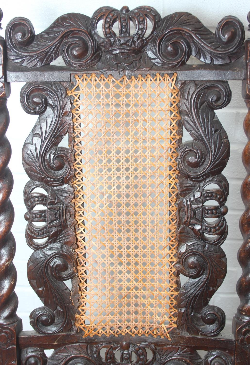 An antique Carolean style armchair with carved details and bergère seat and back, 110cm tall