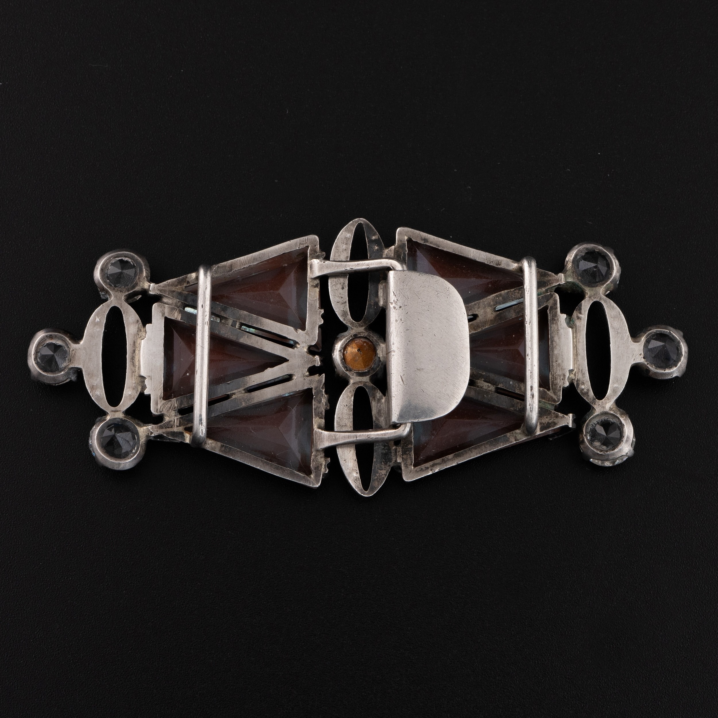 A 1920s Art Deco Saphiret buckle, decorated with triangular Saphirets mounted on a white metal frame with Marcasite and paste stones, 7.5cm width, 3.1cm height, 19.2g total weight. (LDC14767)