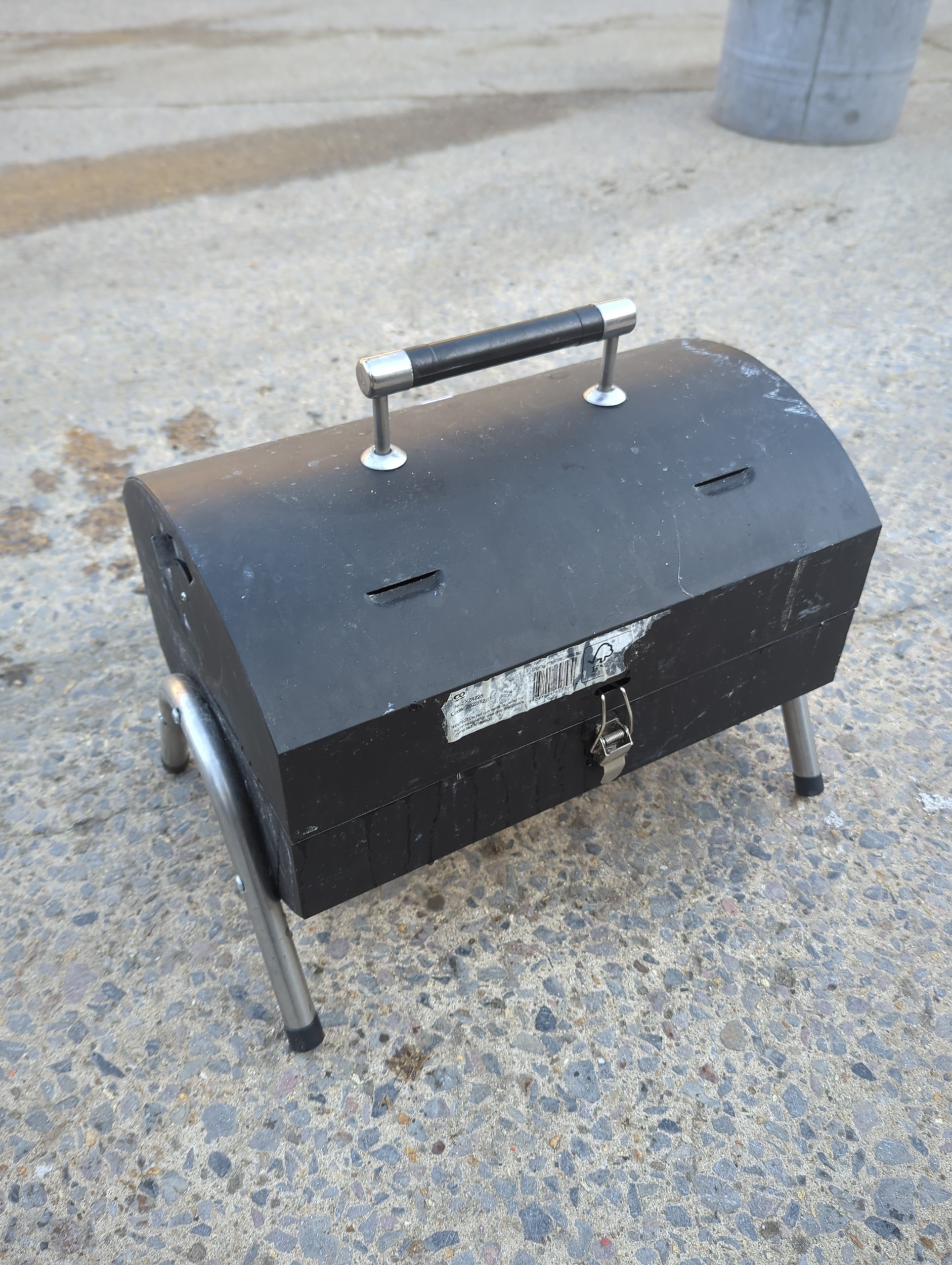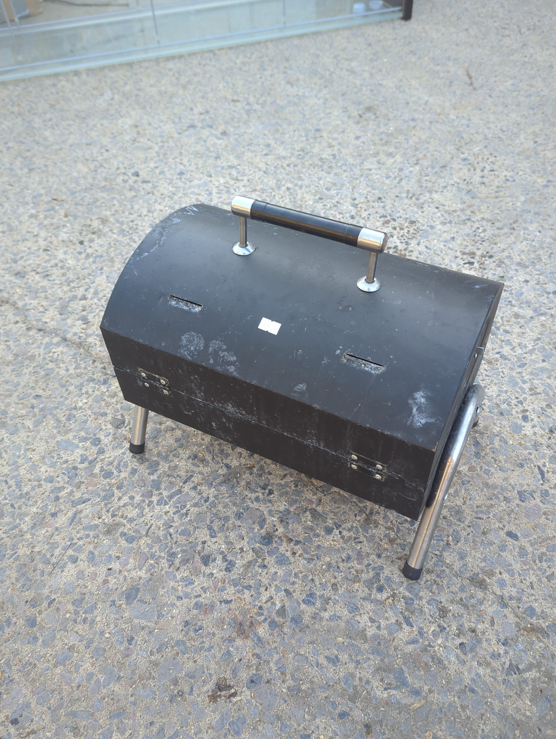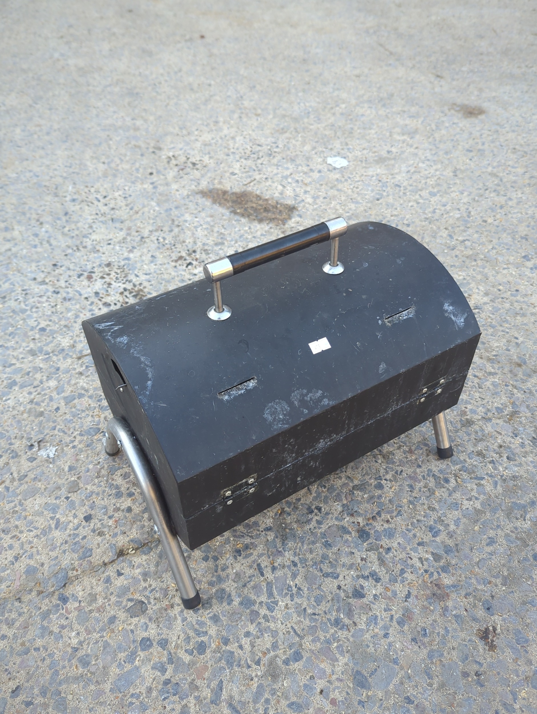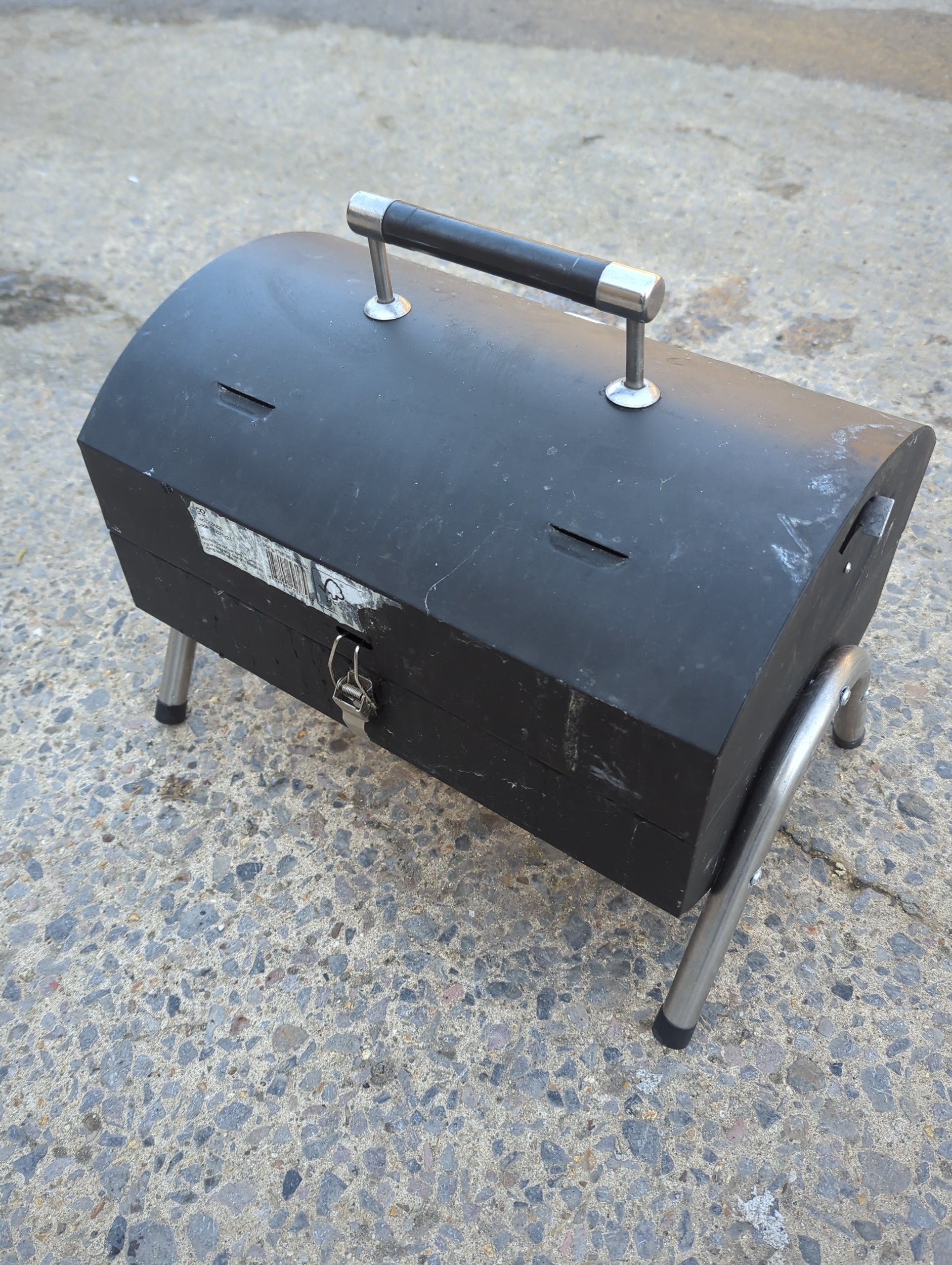 This is a compact portable charcoal BBQ grill, ideal for outdoor cooking and easy to transport. It features a foldable design and metal handles for convenience. The grill includes a removable grate and a detachable top cover for easy cleaning and maintenance.
