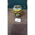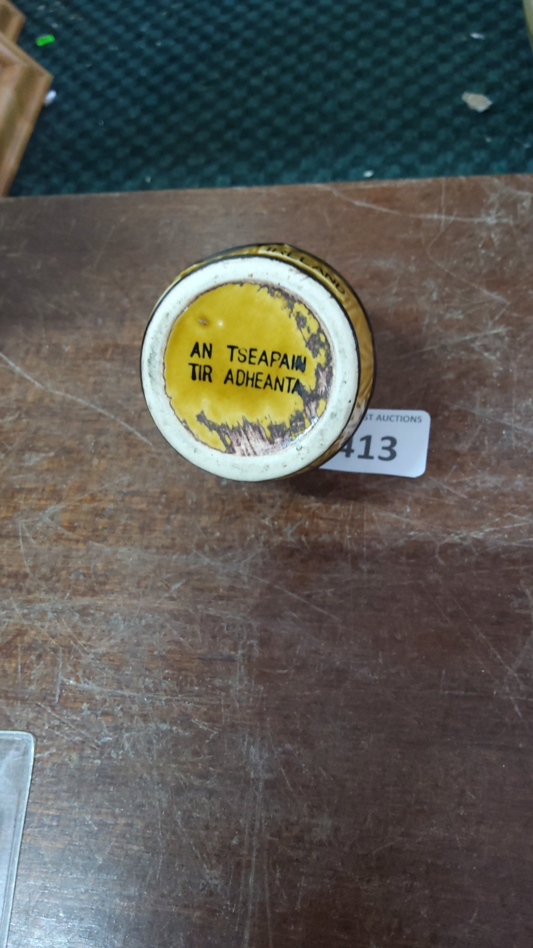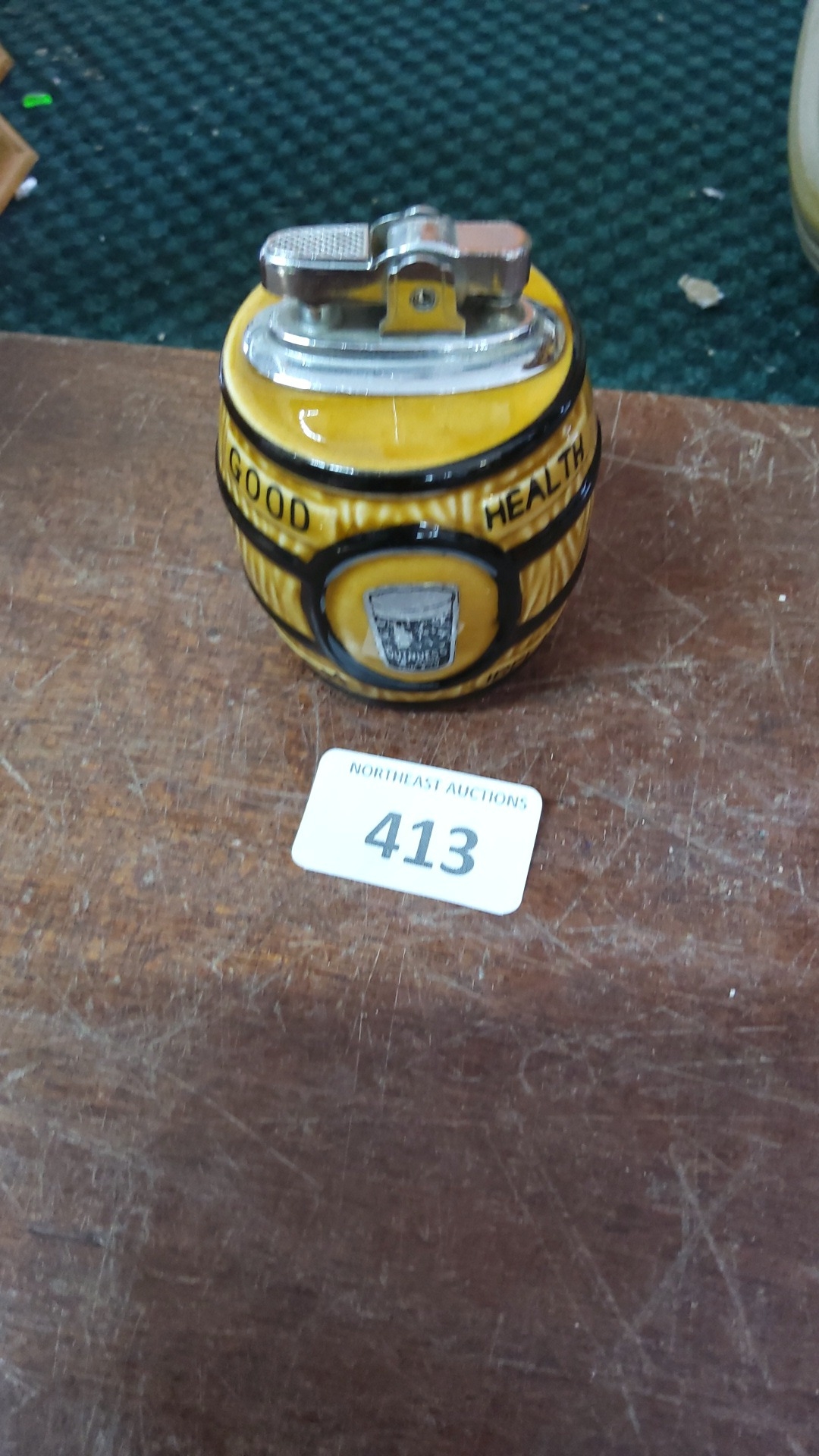 Irish sloganware ceramic table lighter, of barrel form with yellow glaze and black banded decoration, inscribed “GOOD HEALTH”; chromed metal striker mount; the base printed in Irish, “AN TSEAPÁIN TÍR ADHEANTA” .