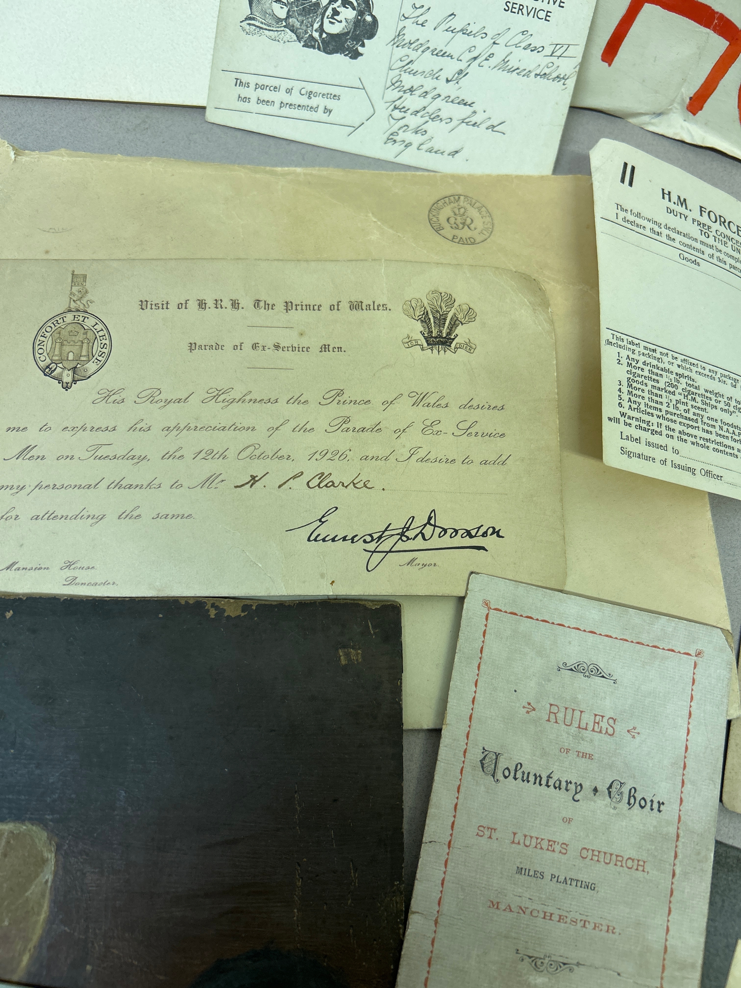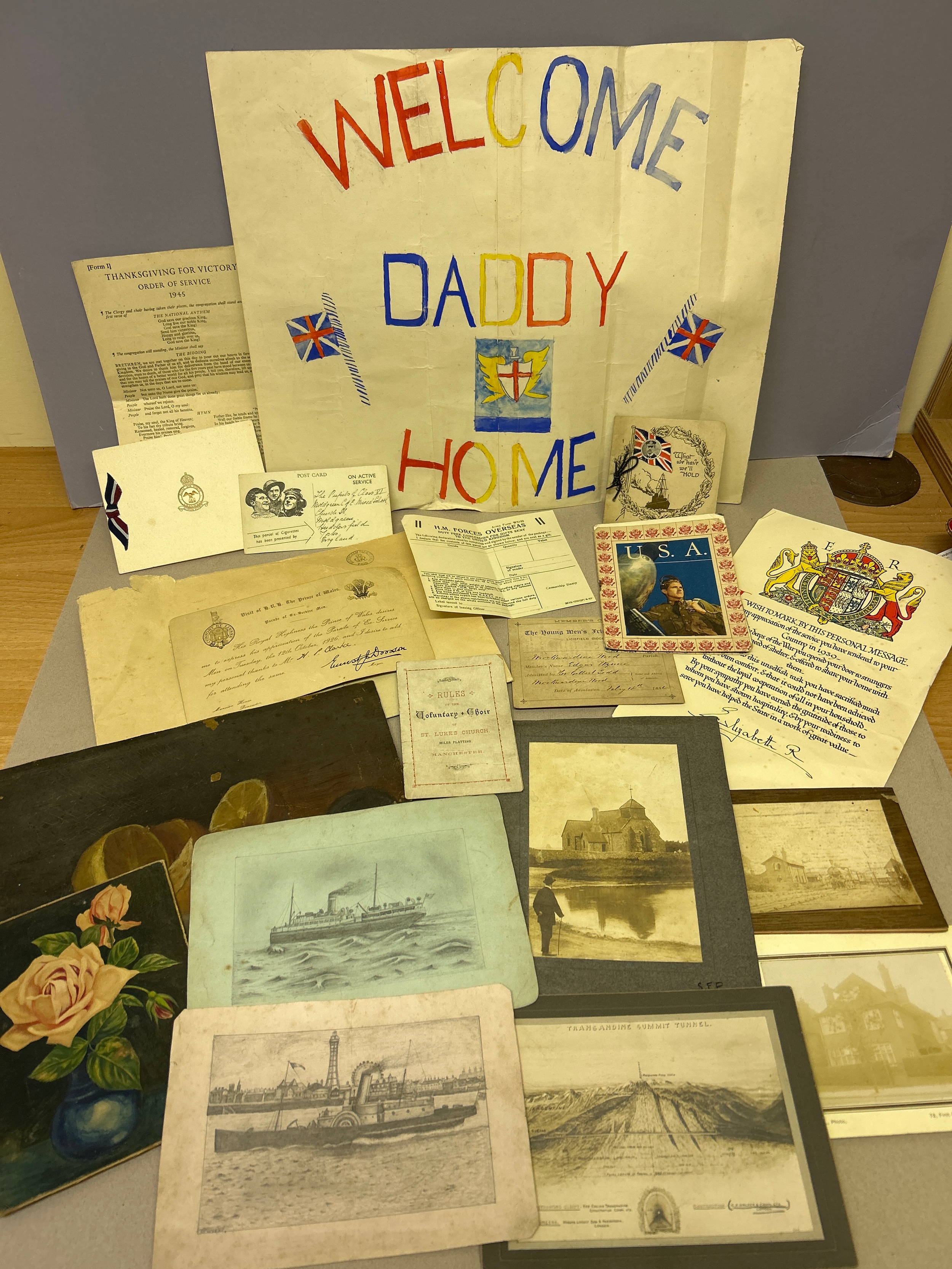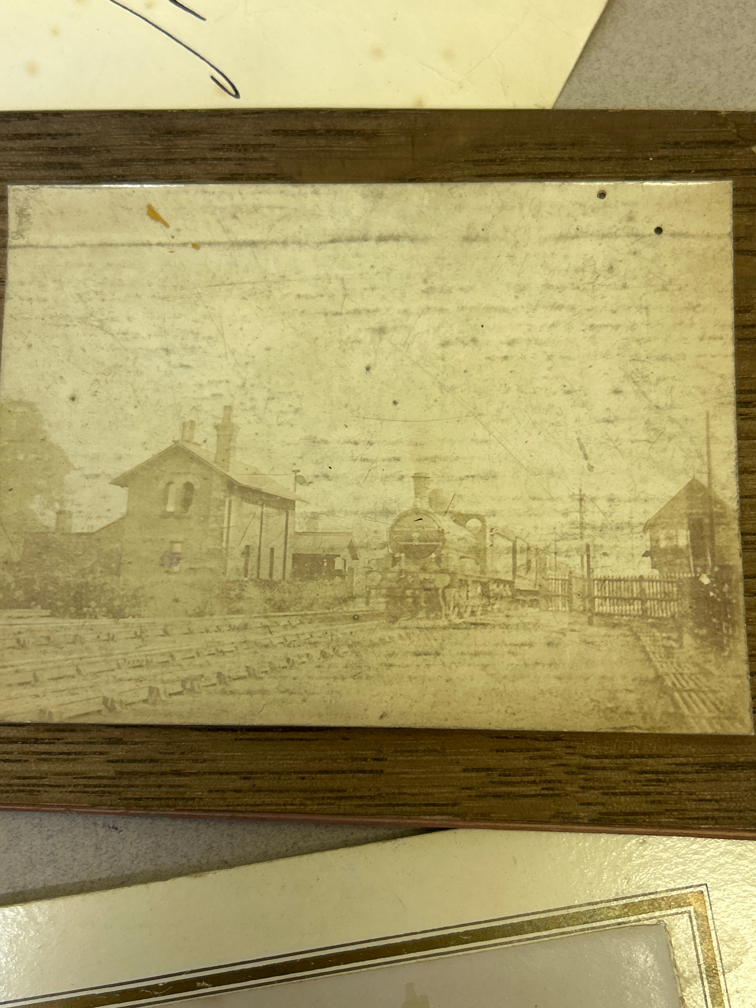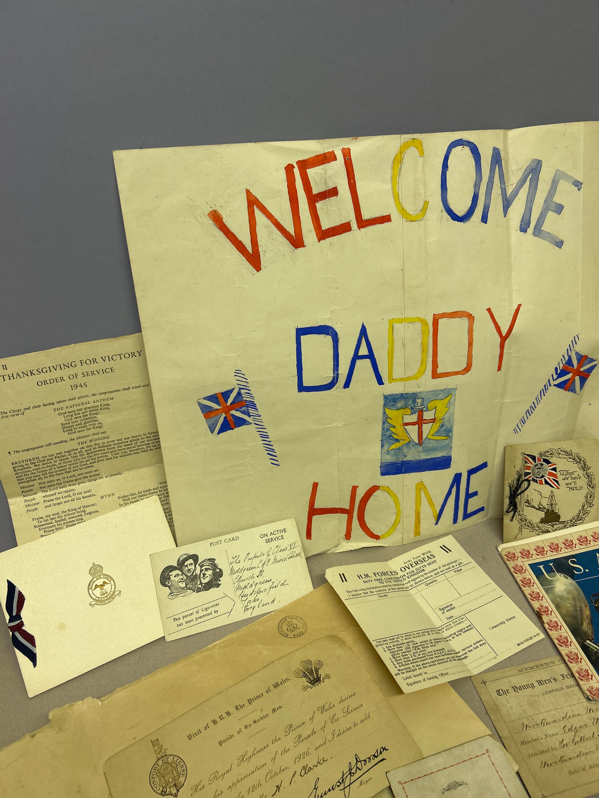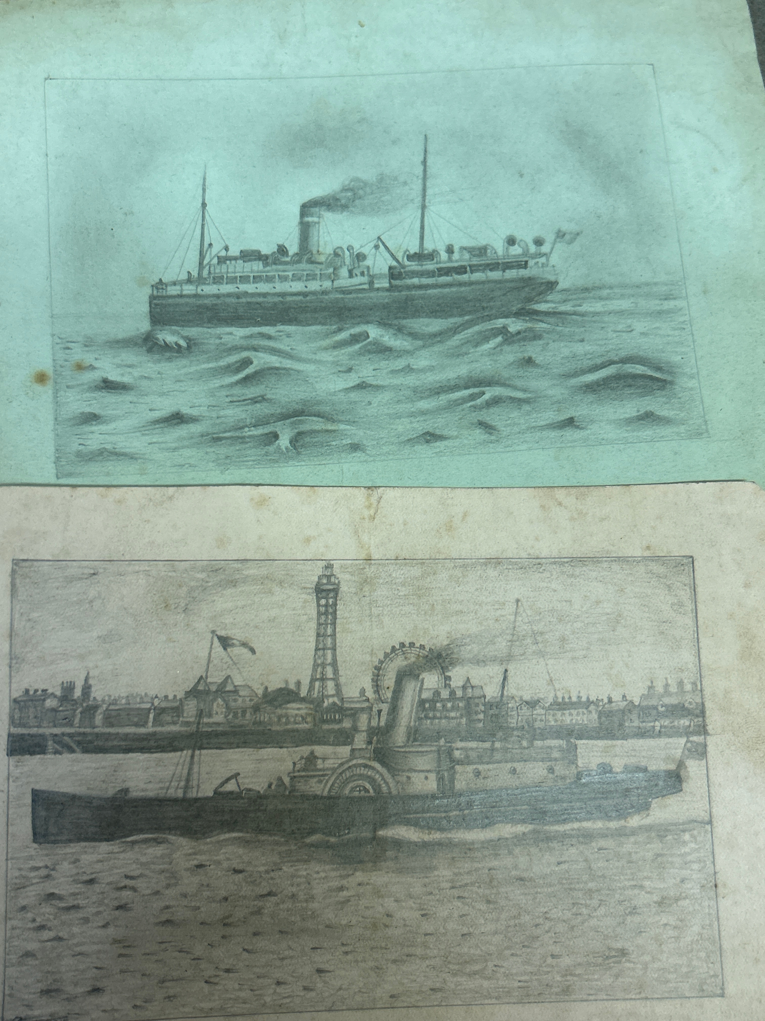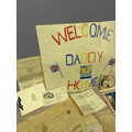 An interesting & eclectic selection of mixed ephemera & naive artwork from a local family. Includes WW2 ephemera, a child’s poster painted for his father on returning home “Welcome Daddy Home”. Photographs including early steam engine in a station, photograph of Friston Church & Pond, pencil sketch of a paddle steamer, the “Bickerstaffe Paddle Steamer” Blackpool etc