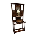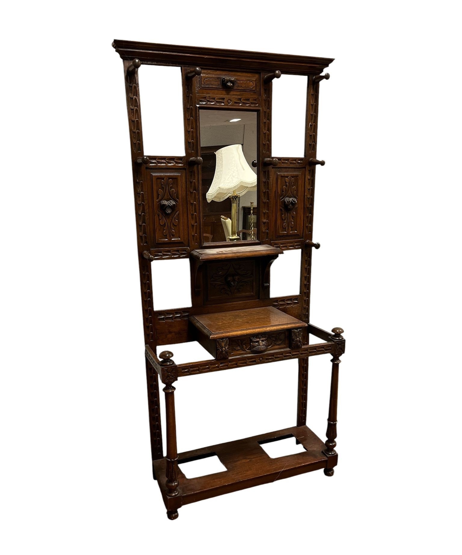 A VINTAGE JACOBEAN STYLE CARVED OAK HAT, COAT AND STICK STAND the central rectangular mirror above a moulded shelf with frieze drawer and lion mask handle flanked by stick compartments raised on cylindrical leaf capped columns on bun feet (lacking drip pans) 208cm (h) x 92cm (w) x 37cm (d)