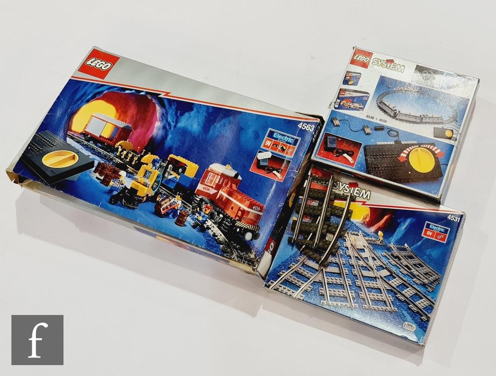 A collection of Lego, 4563 Load N' Haul Railroad, 4531 Manual Points with Track and 4548 Transformer and Speed Regulator, all boxed. (3)