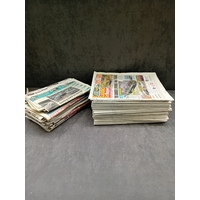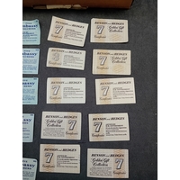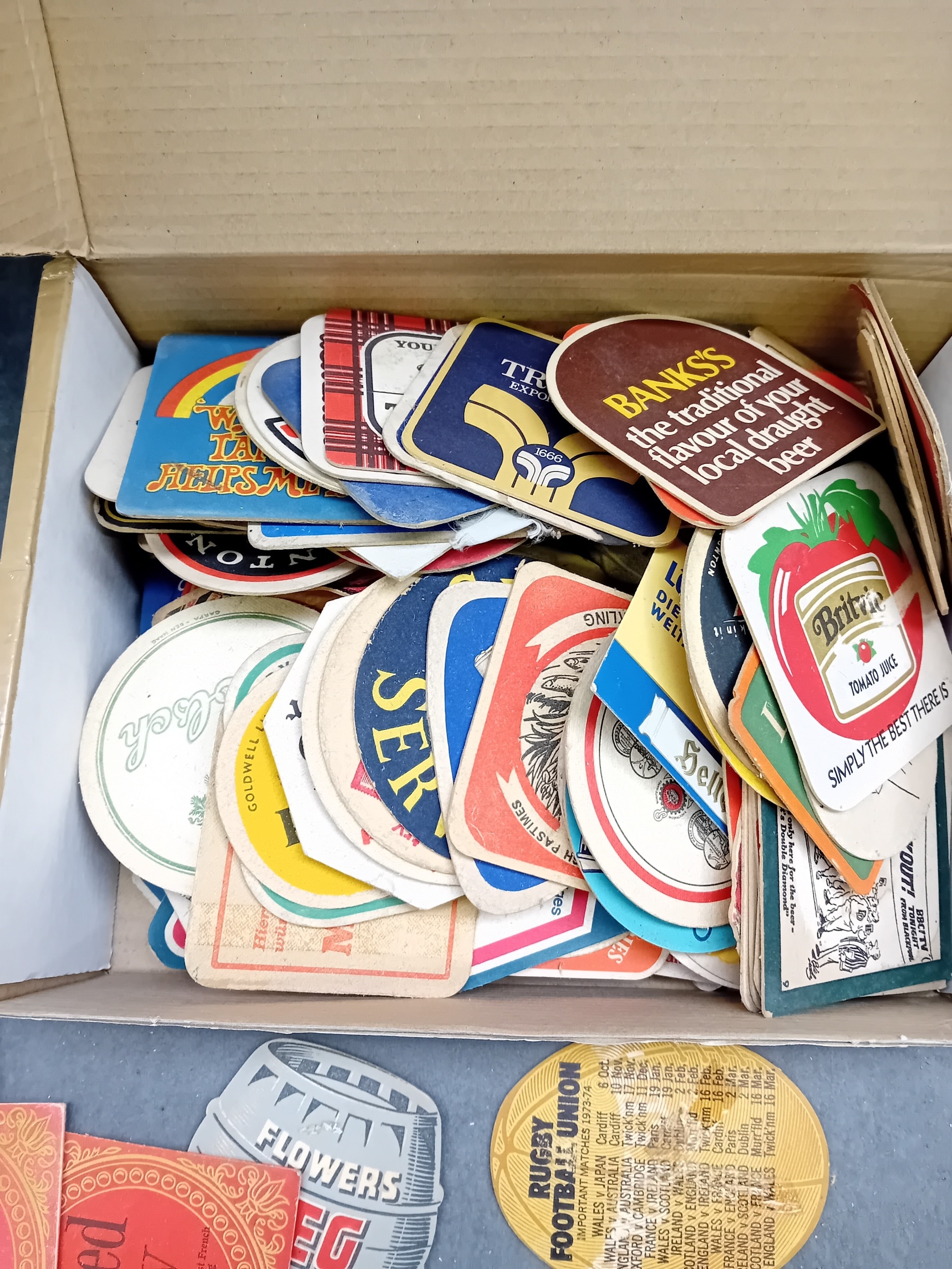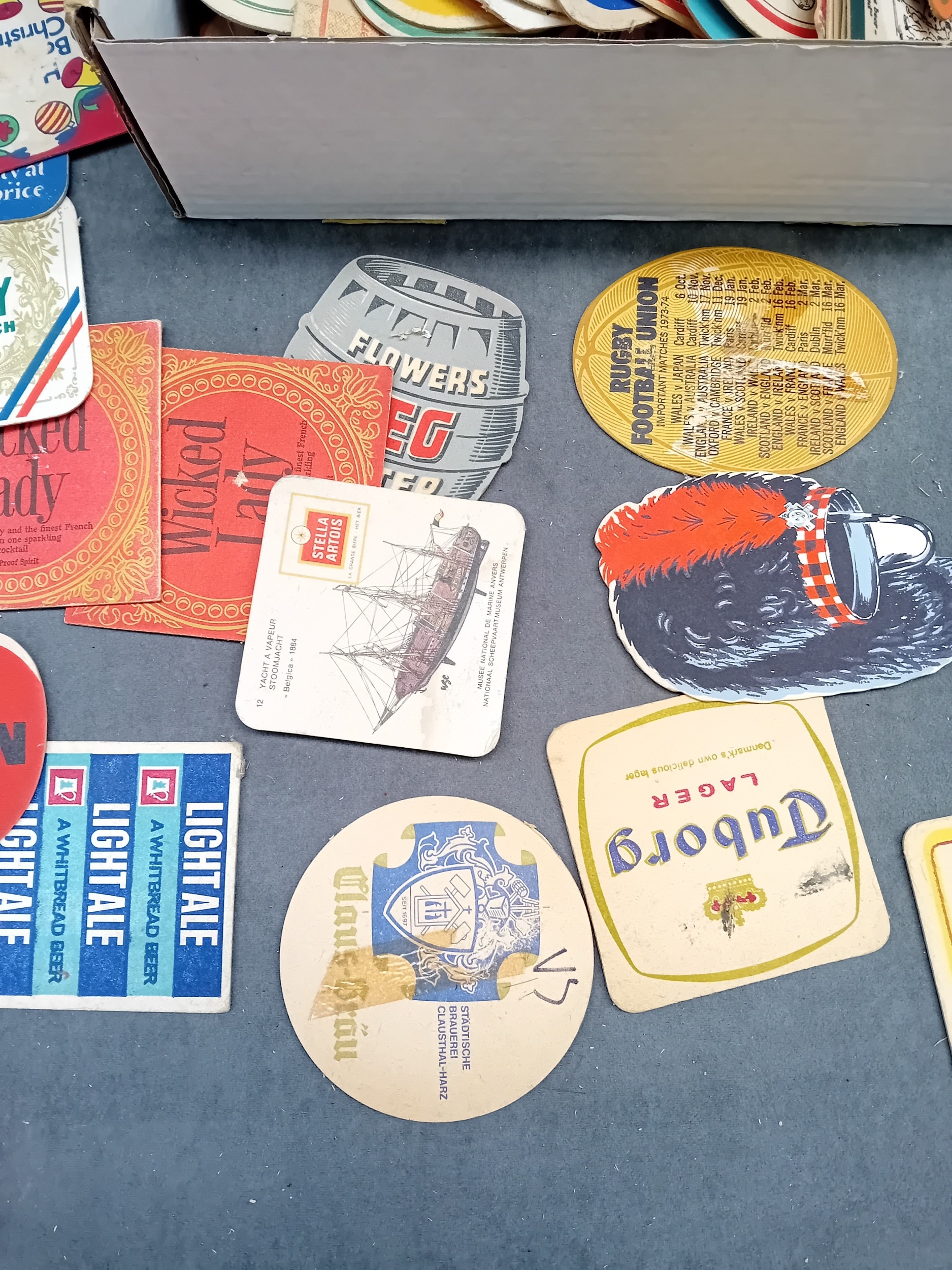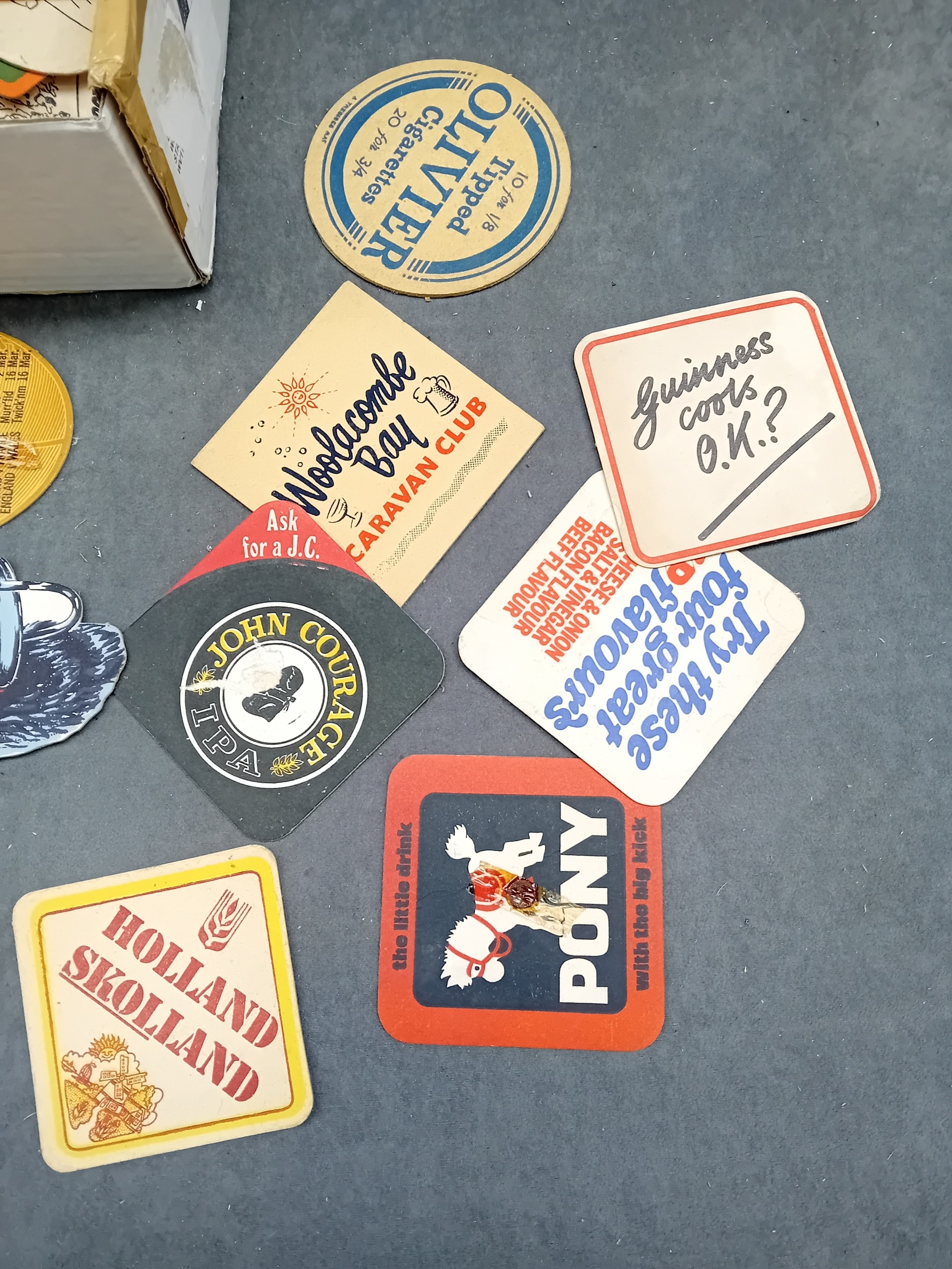 A collection of approximately 50 vintage German beer coasters, primarily crafted from pulpboard or thick cardboard. The assortment features various shapes, including round, square, diamond, and irregular cuts, and appears to date primarily from the mid to late 20th century. The collection advertises a diverse range of products and brands, with notable visible text and brand names including "Guinness" (e.g., "Guinness cooks O.K.?"), "John Courage IPA, " "Tuborg Lager" (with the slogan "Denmark's own delicious lager"), "Stella Artois" (bearing French text "Belgique - 1888" and "Brasserie Nationale de Louvain"), "Taunton Cider, " "Whitbread Light Ale, " "Pony" ("the little drink with the big kick"), "Olivier Tipped Cigarettes, " "Banks's, " "Britvic Tomato Juice, " "Woolscombe Bay Caravan Club, " "Flowers EG, " and "Rugby Football Union" (mentioning "Important Matches 1973-74"). The collection is predominantly in English, with some French and implied Danish text.