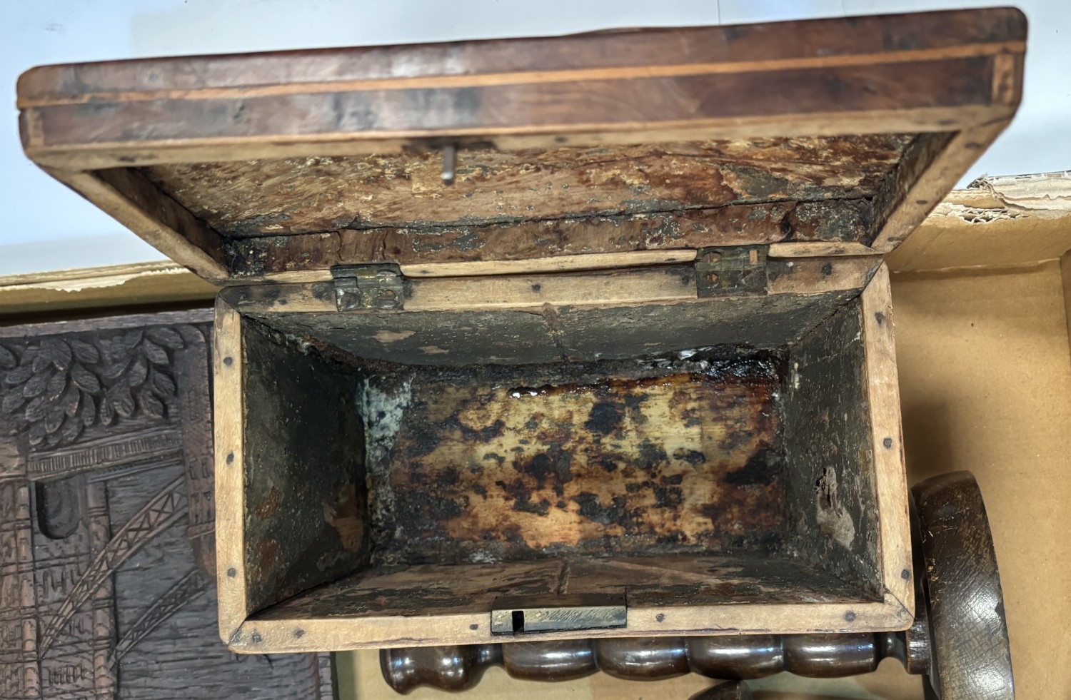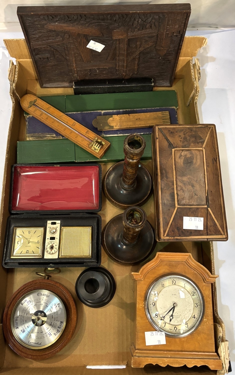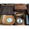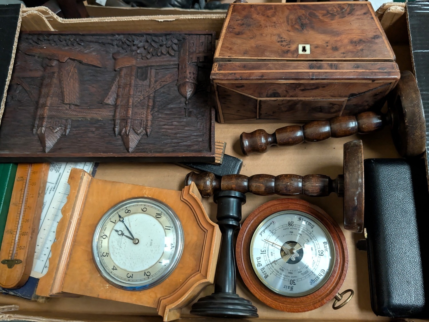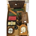 A 19th century tea caddy, eight day clock, barometer and other collectables