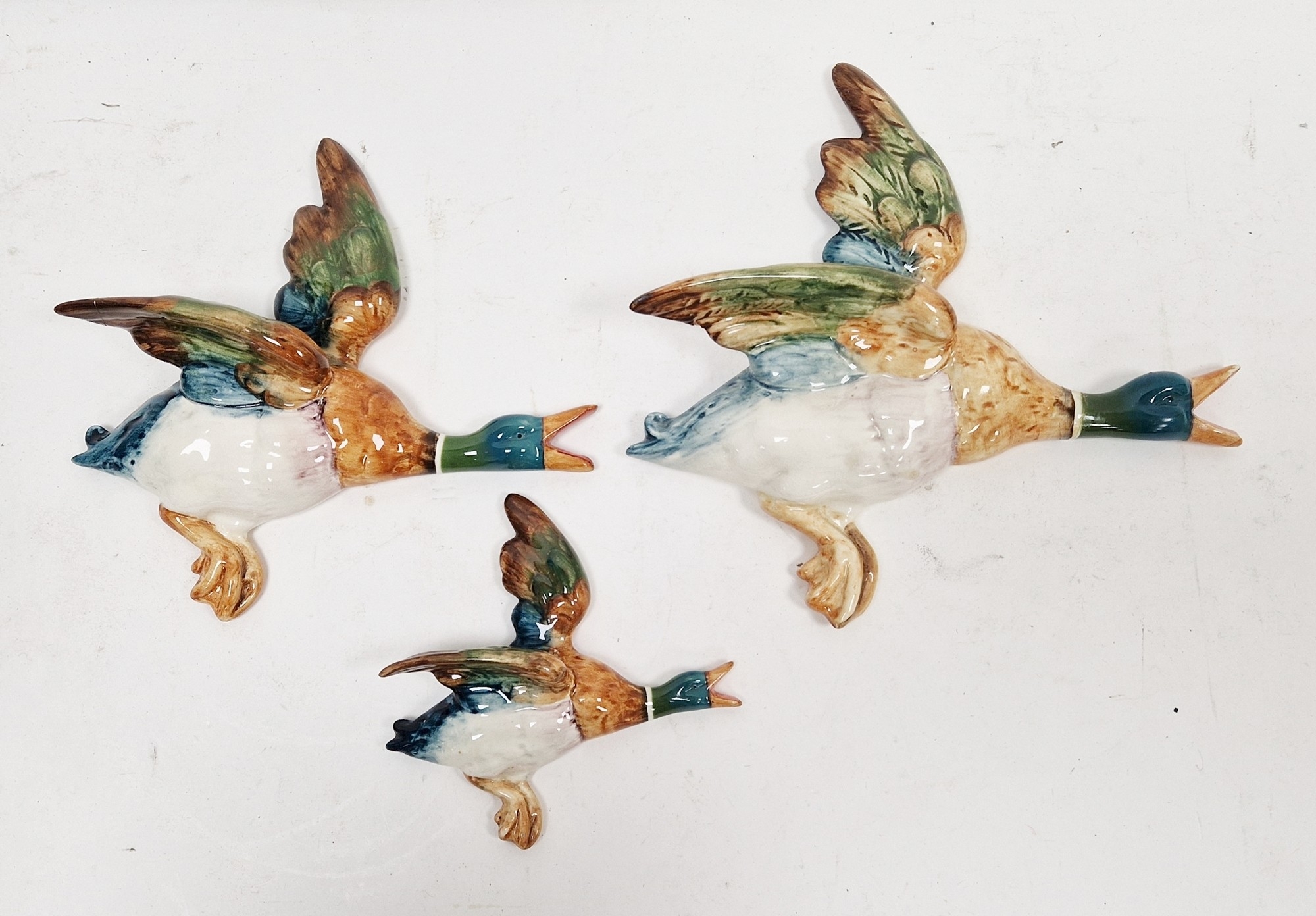 Set of three Beswick pottery duck wall plaques in sizes, printed and impressed marks (damages and repairs) 26 cm wide max. (3) (please note VAT will be payable on the hammer)