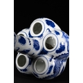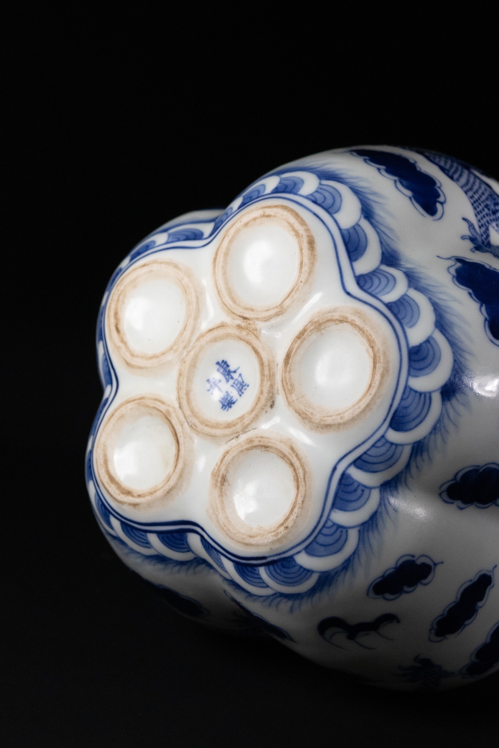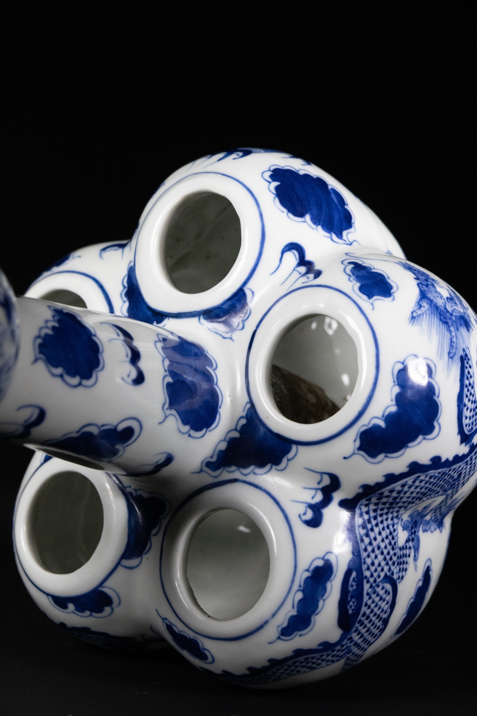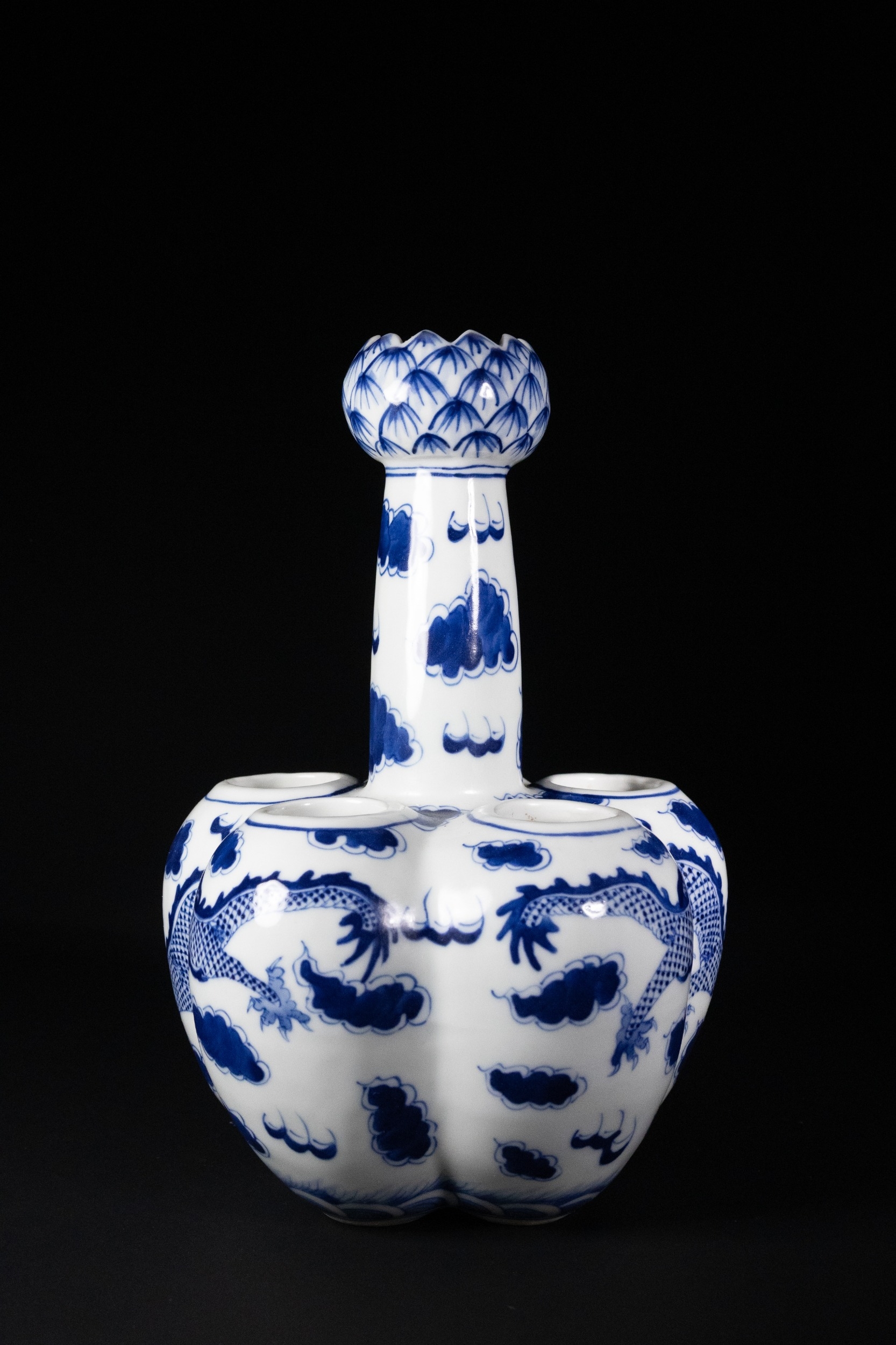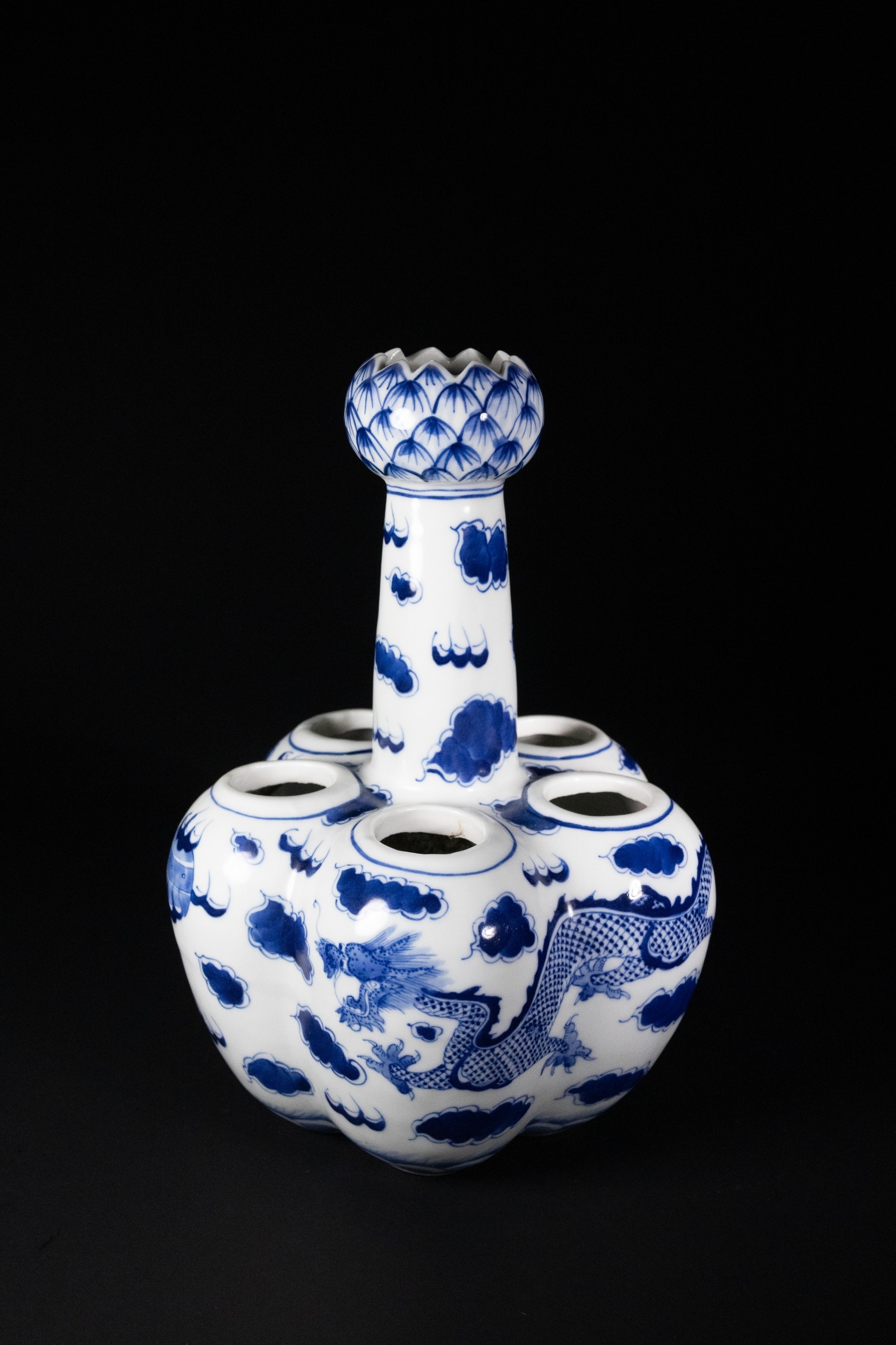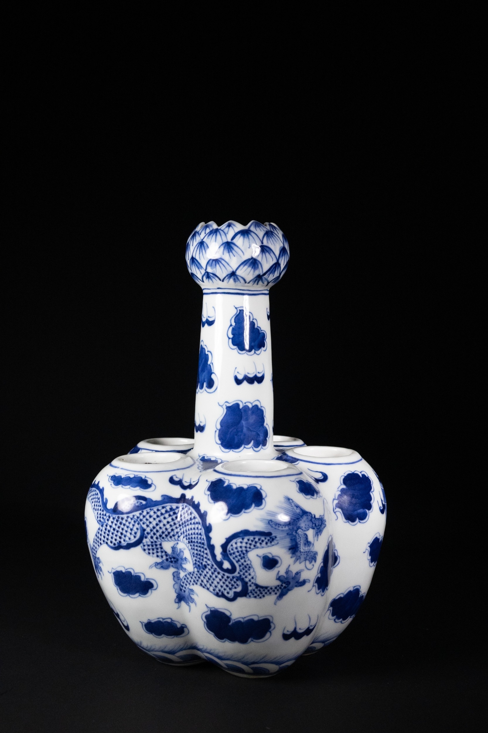 This tulip vase features a globular base with five trumpet-shaped necks encircling a central elongated neck, all culminating in a lotus-form rim. The smooth white porcelain is adorned with vivid cobalt blue designs, including a powerful five-clawed dragon winding through clusters of stylised cloud scrolls. The base displays five recessed footrings surrounding a central six-character mark, possibly indicating the period or origin of the piece.