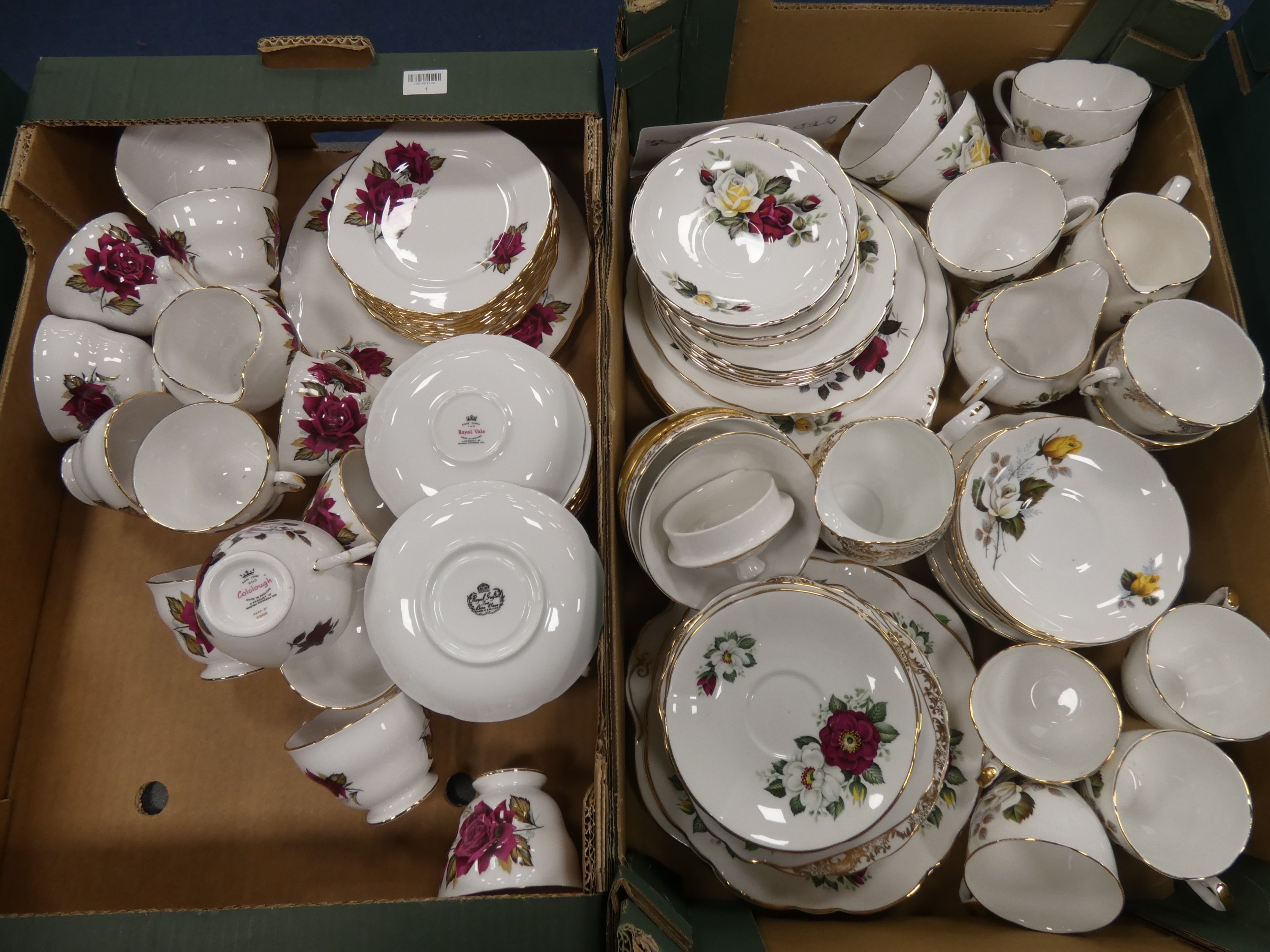 Two cartons containing floral china tea and dinnerwares to include Colclough, Royal Vale and Royal Grafton etc.