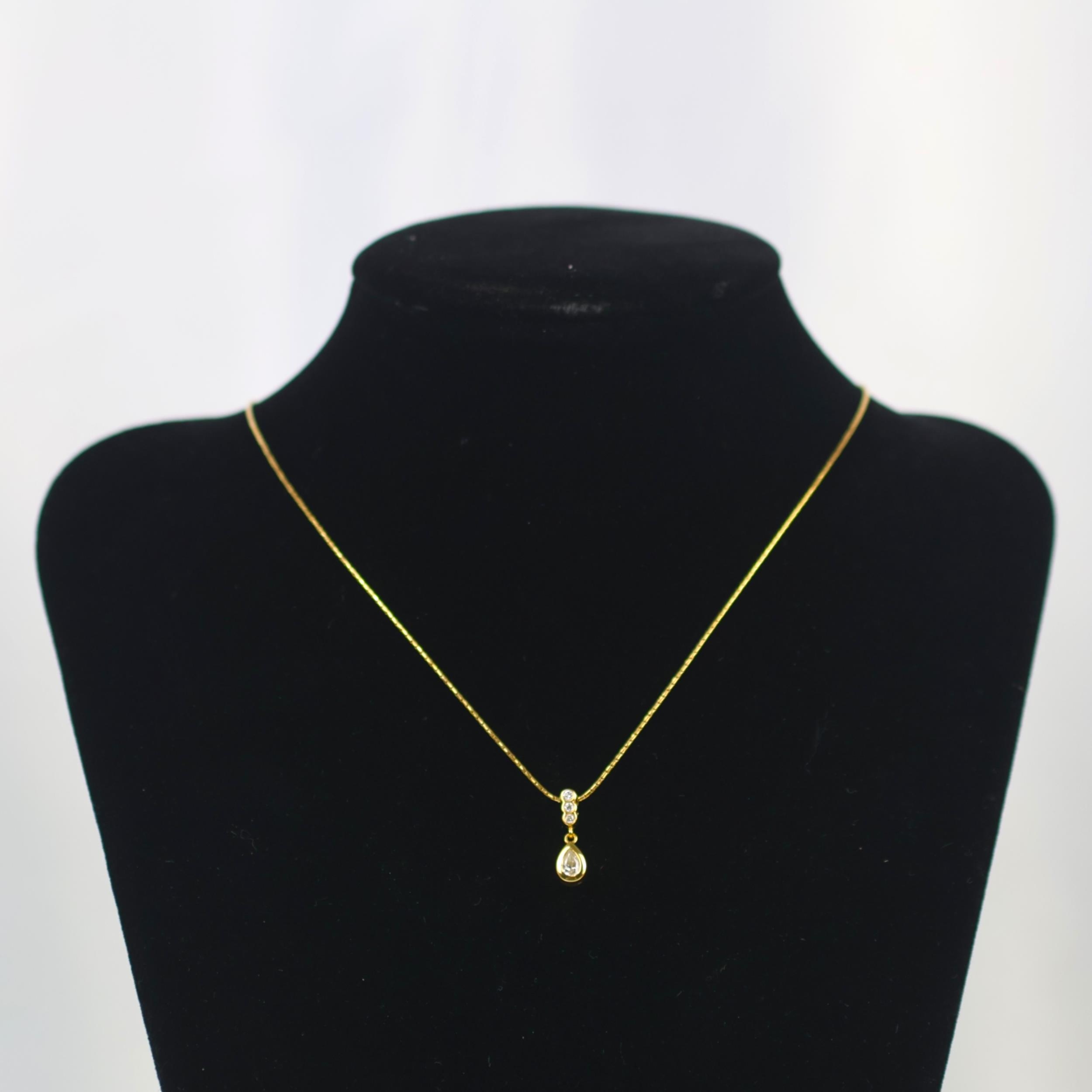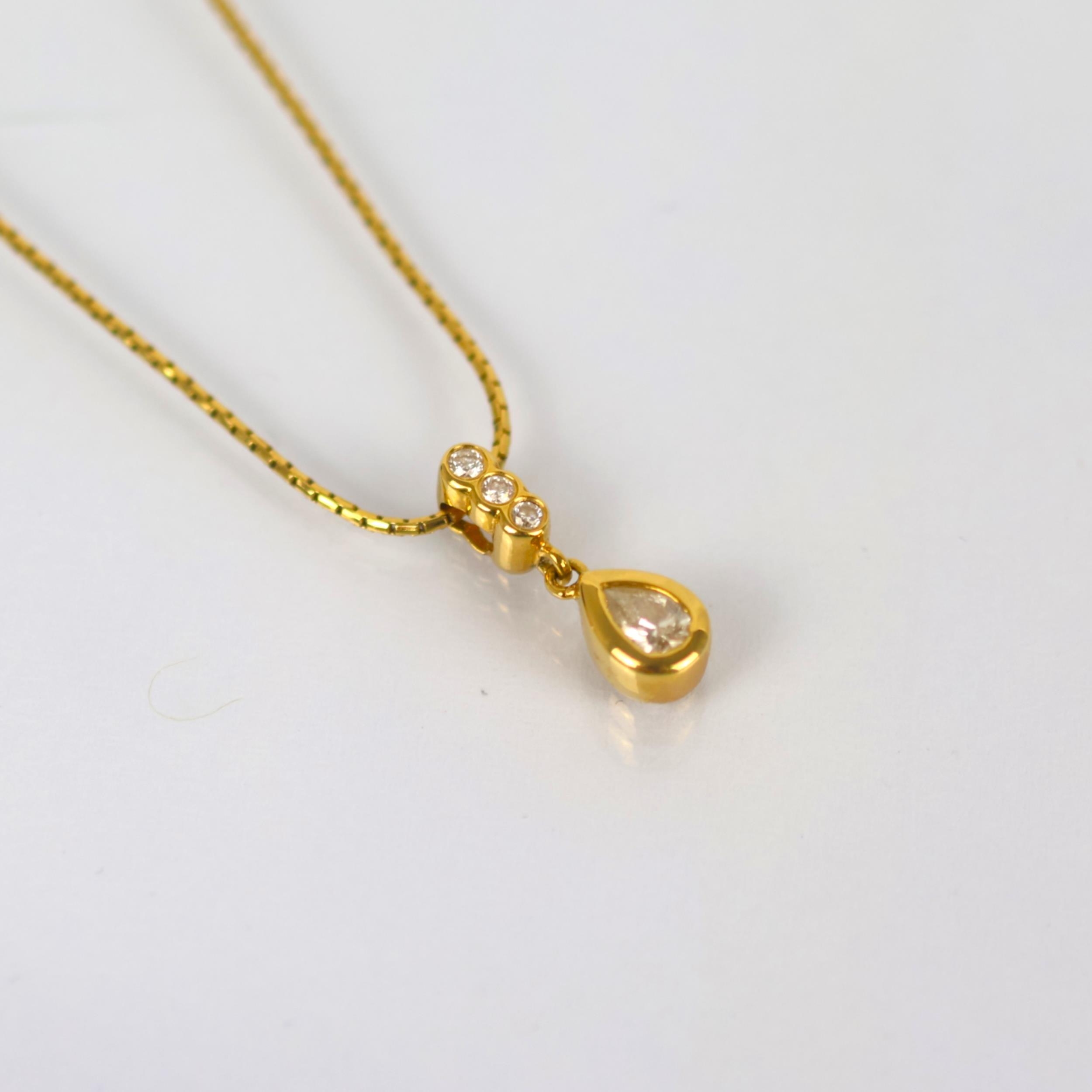 A late 20th century 18ct yellow gold diamond pendant, the central pear cut diamond within rub over mount, surmounted by trio of round cut diamonds set to bale, 1.5cm long, upon a fancy link chain with hallmarked lobster fastener, 40cm long, gross weight 4gms