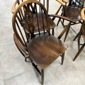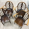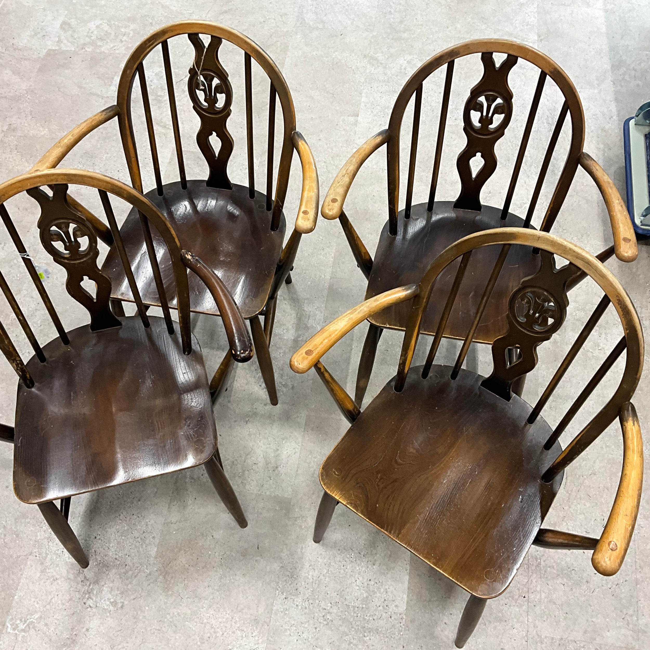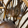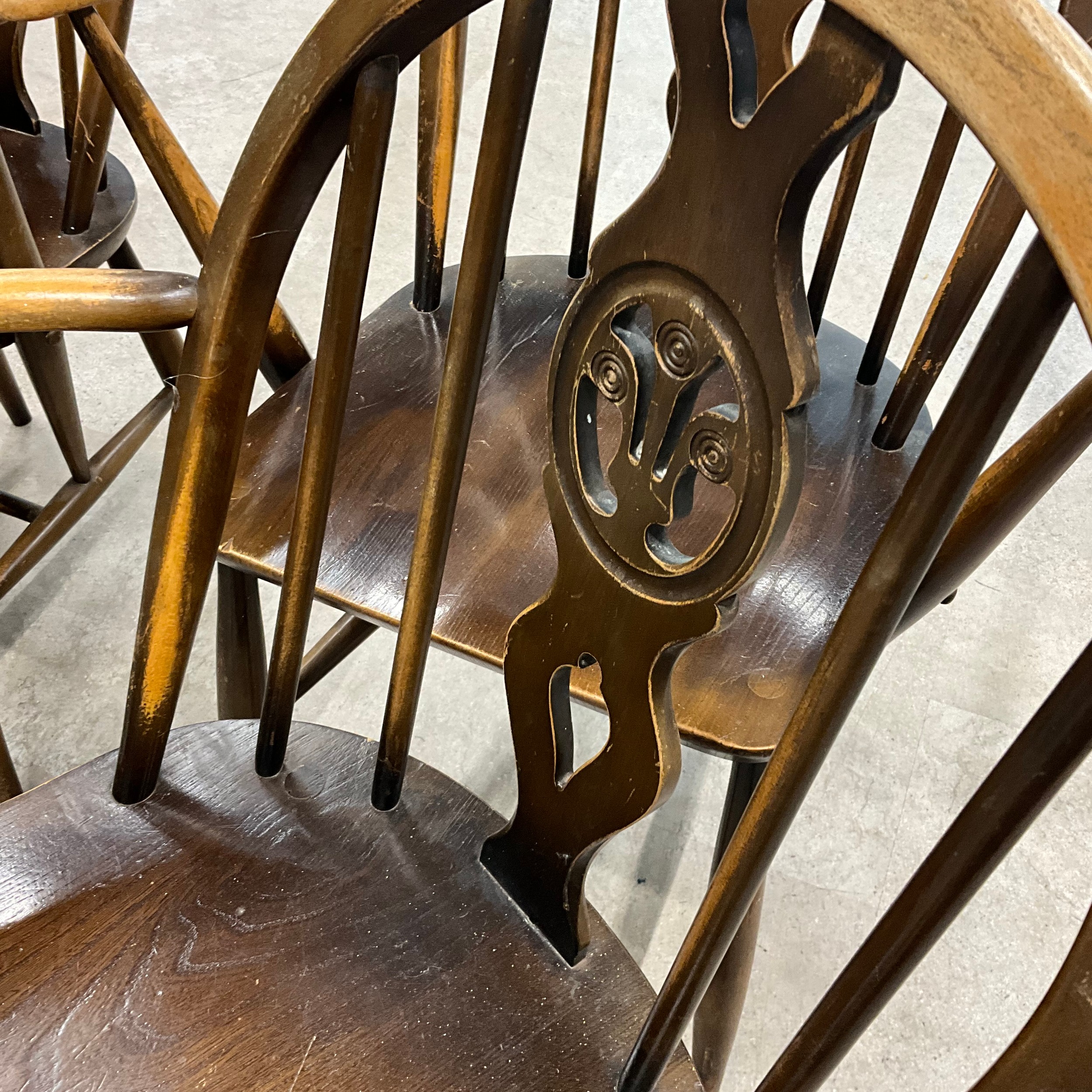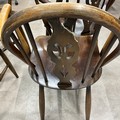 Four Ercol chairs with hoop and spindle backs with a central fleur-de-lis carved motif. Seat height 43cm, seat depth 38cm, seat width 39cm.