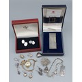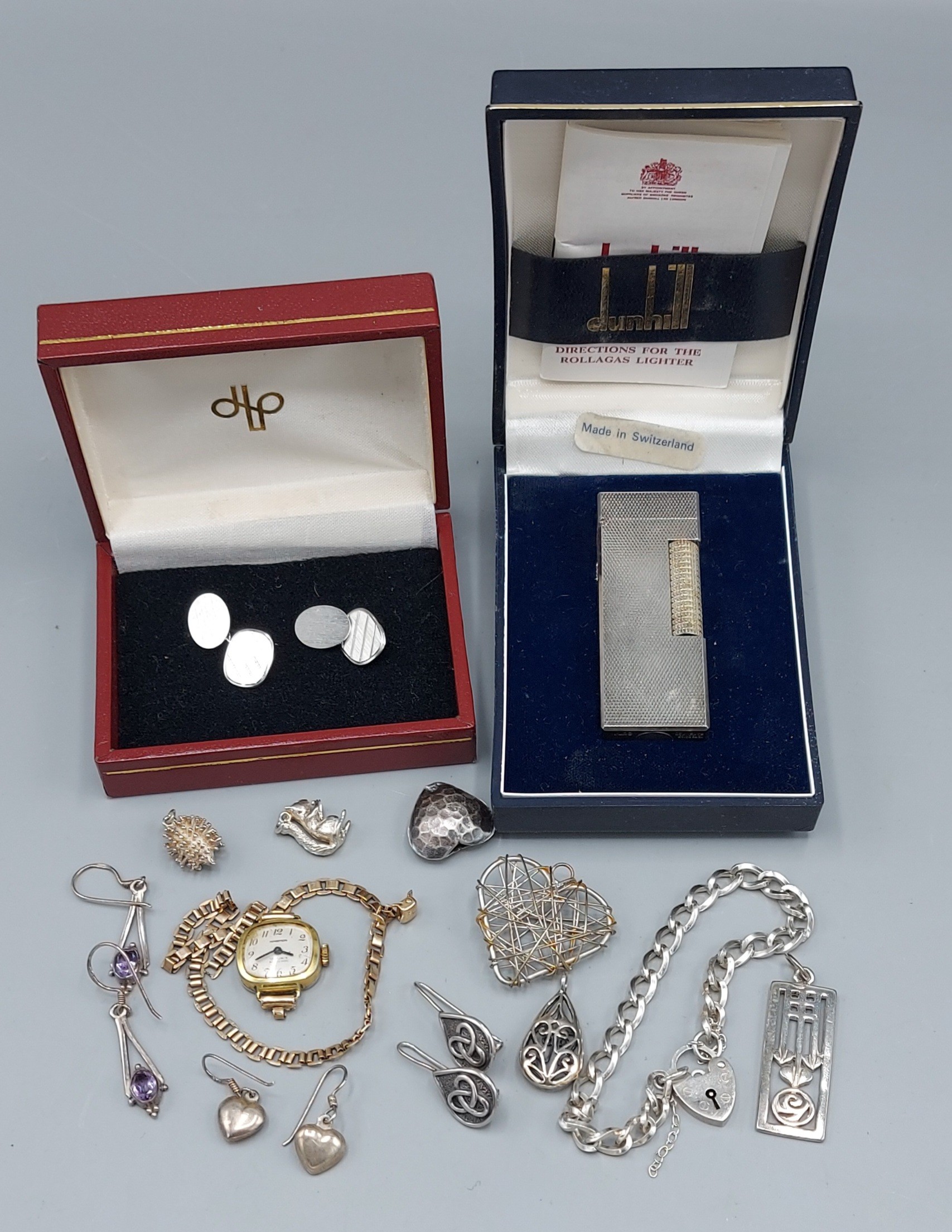 A ladies wristwatch with 9ct gold strap, 4.5gms strap only together with a small collection of silver jewellery, a Dunhill lighter, and other jewellery