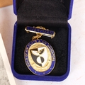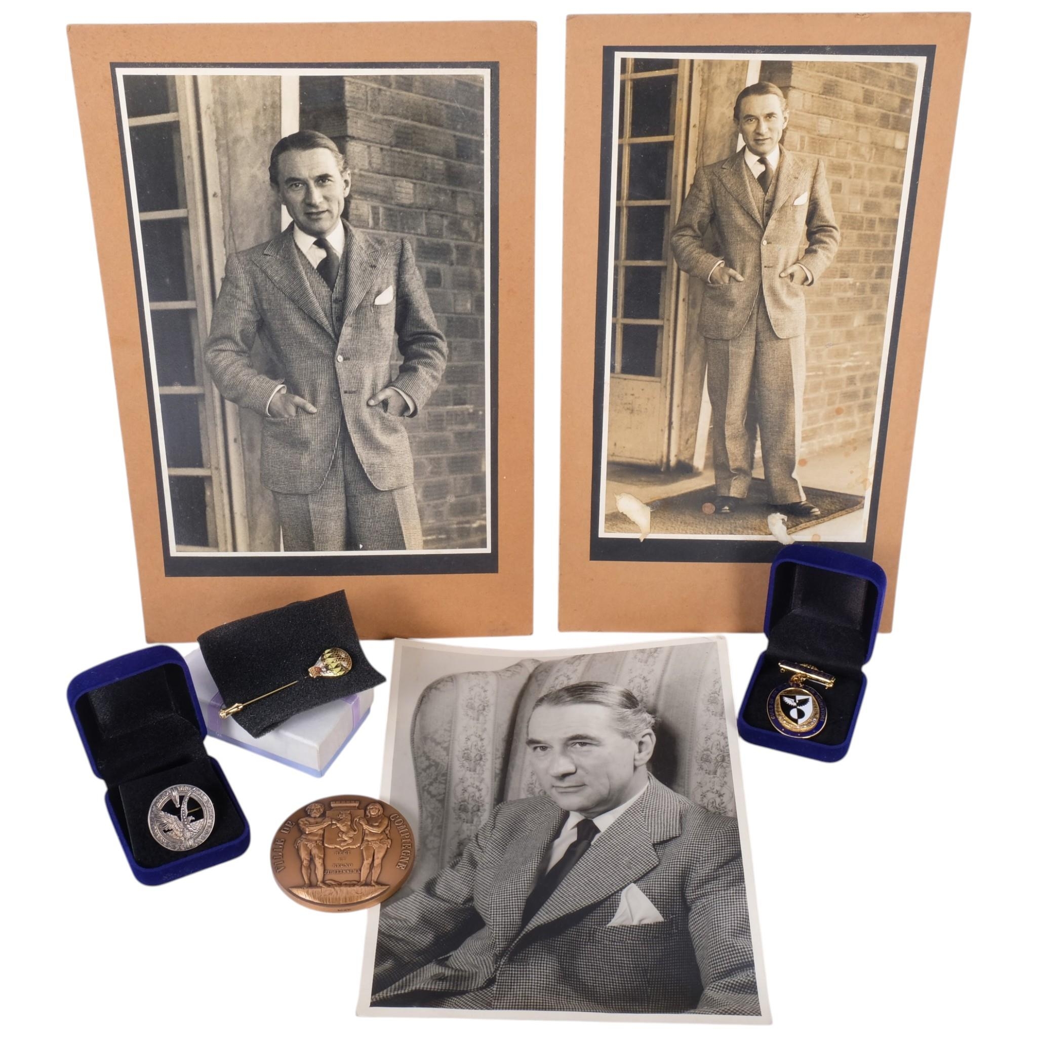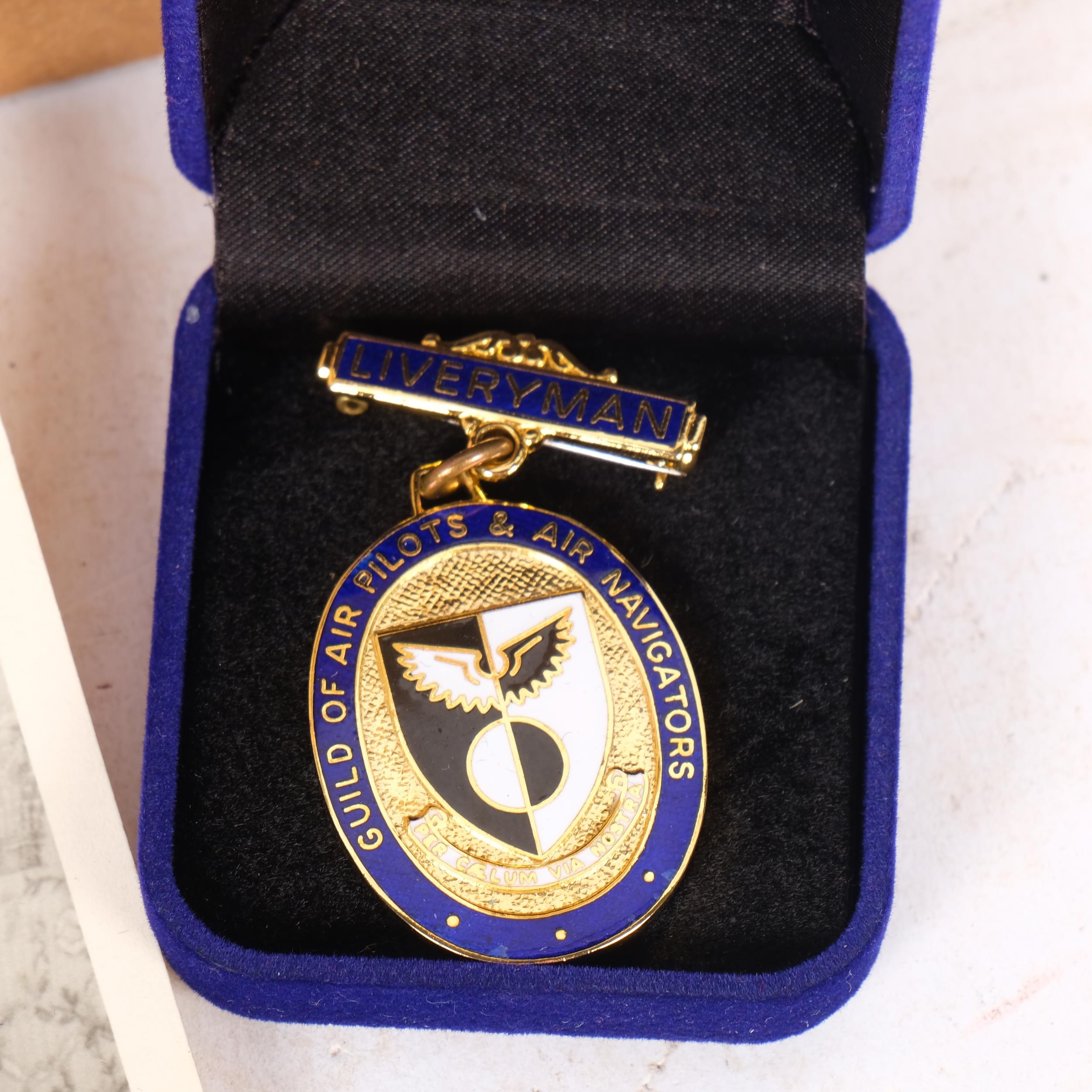 A sterling silver Royal Aeronautical Society badge, Vaughton & Sons, Birmingham 1984, a livery badge for the Honourable Company Of Air Pilots, motto "Per Cælum Via Nostra", a gold tone stick/lapel pin depicting an enamelled hot air balloon, a Ville de Compiegne Tenth Anniversary medal in association with Cranfield University, stamped Bronze, with a collection of contemporary photos