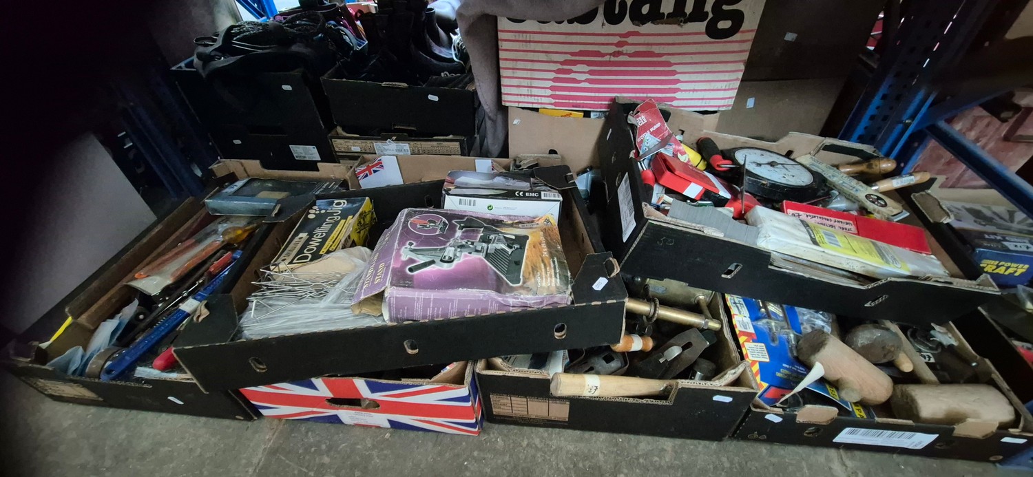 6 boxes of tools including hammers, blow lamps, planes mallet, hand riveter, mole grips, wall ties, stand for an angle grinder, dowelling jig, etc