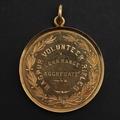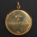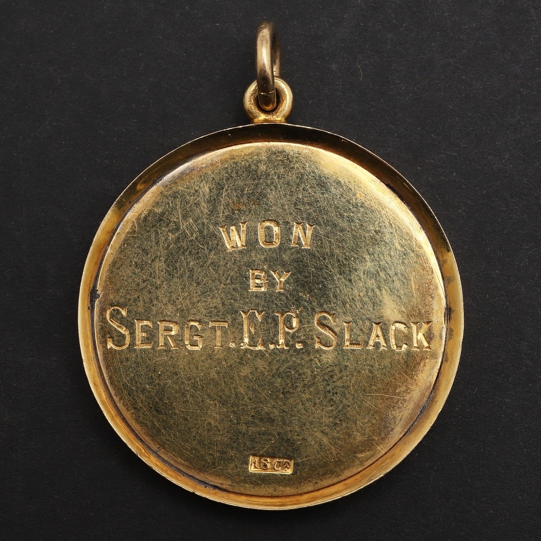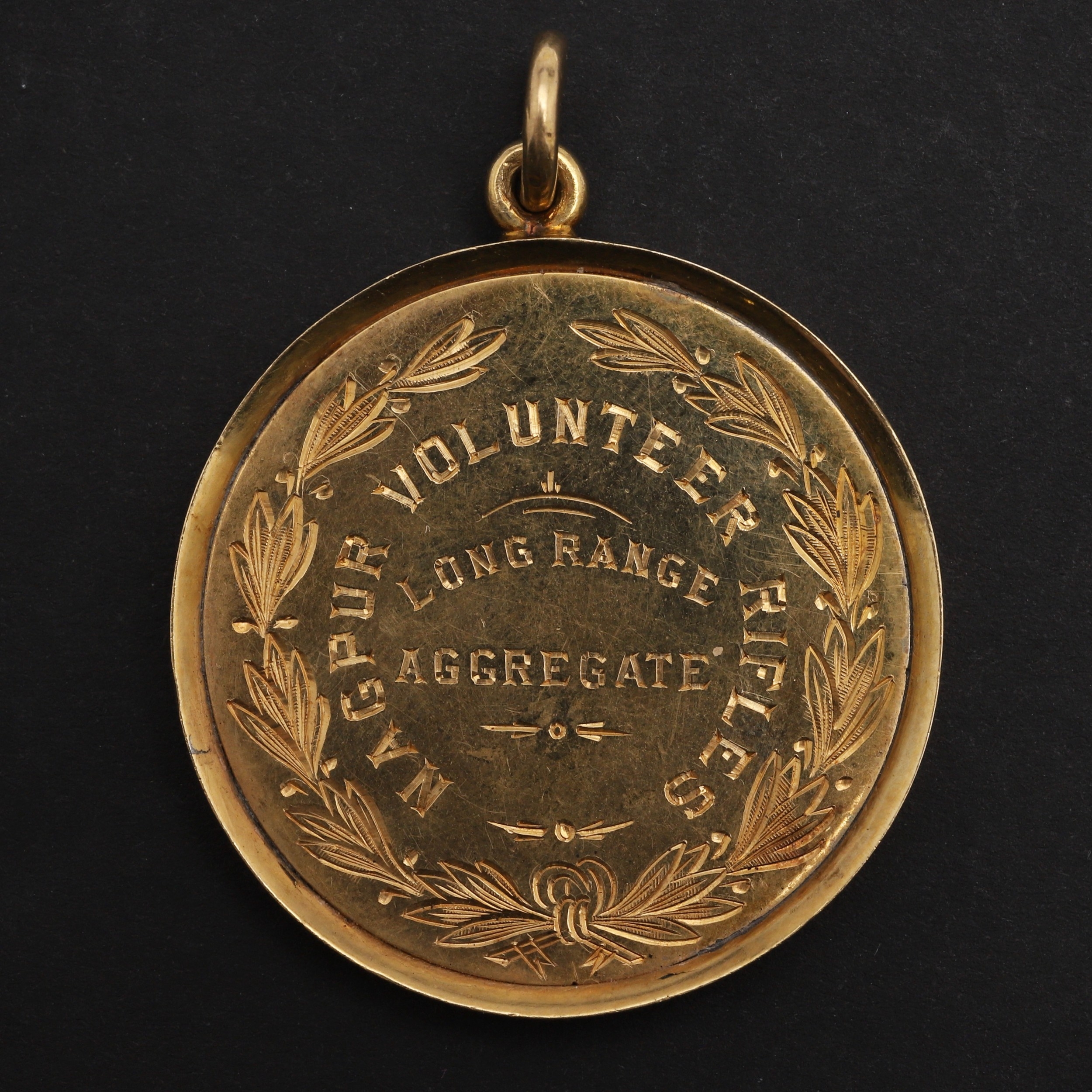 A VICTORIAN GOLD NAGPUR RIFLES SHOOTING MEDAL. A gold medal engraved 'Nagpur Volunteer Rifles Long Range Aggregate', and to the reverse ' Won by Sergt. E.P. Slack'. Marked 18ct. 33mm, c. 14.80g.