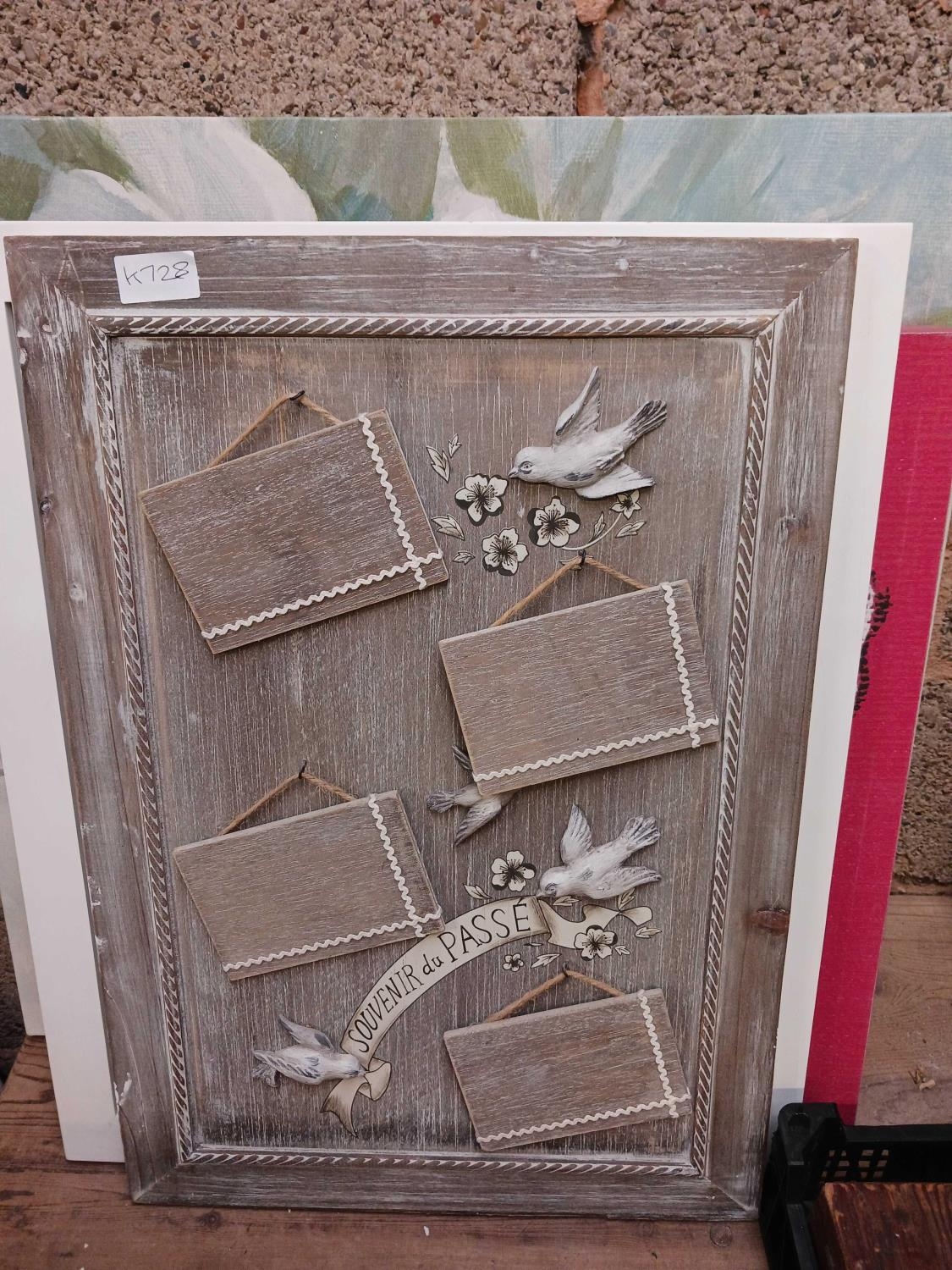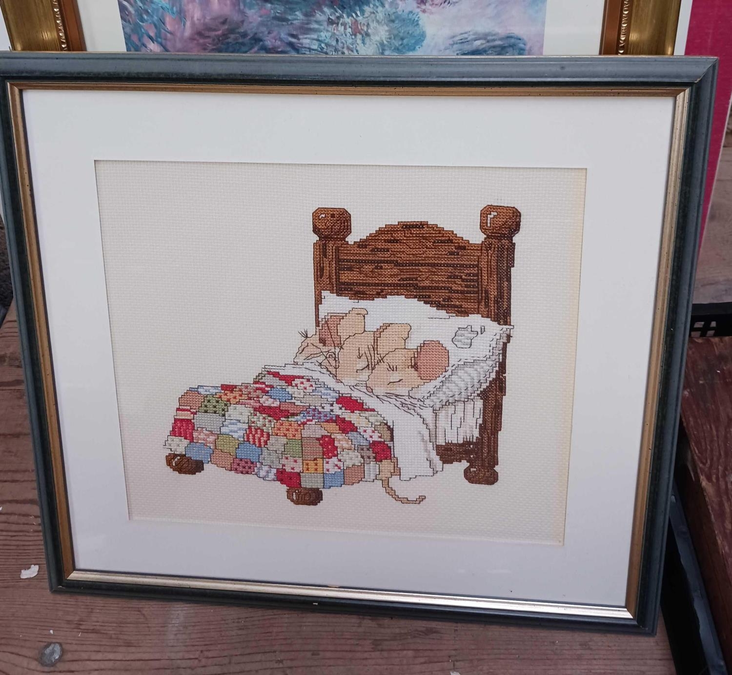 QTY OF EMBROIDERED PICTURES, A WOODEN NOTE BOARD & OTHER MISC PICTURES