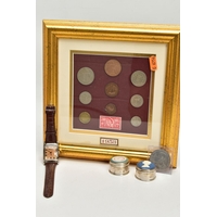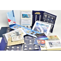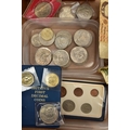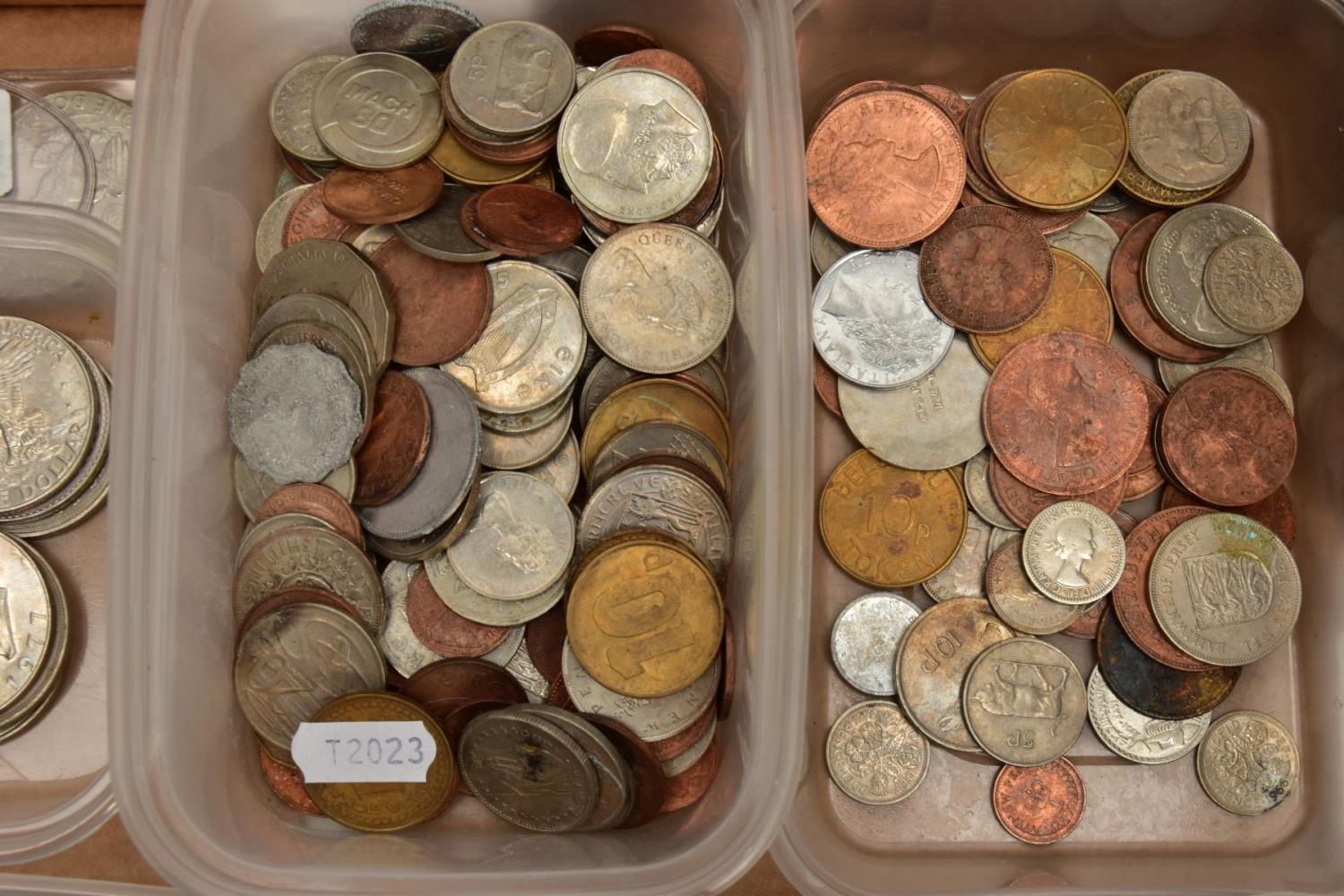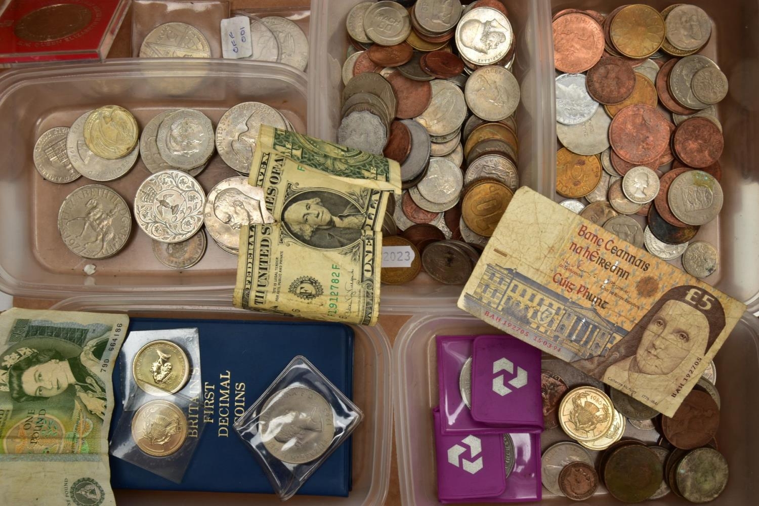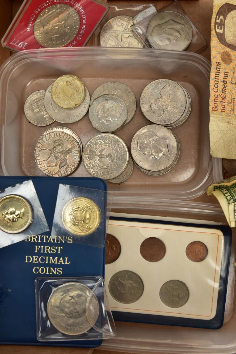 A BOX CONTAINING PLASTIC TRAYS OF MIXED WORLD COINS AND COMMEMORATIVES A 2001 £5 COIN ETC