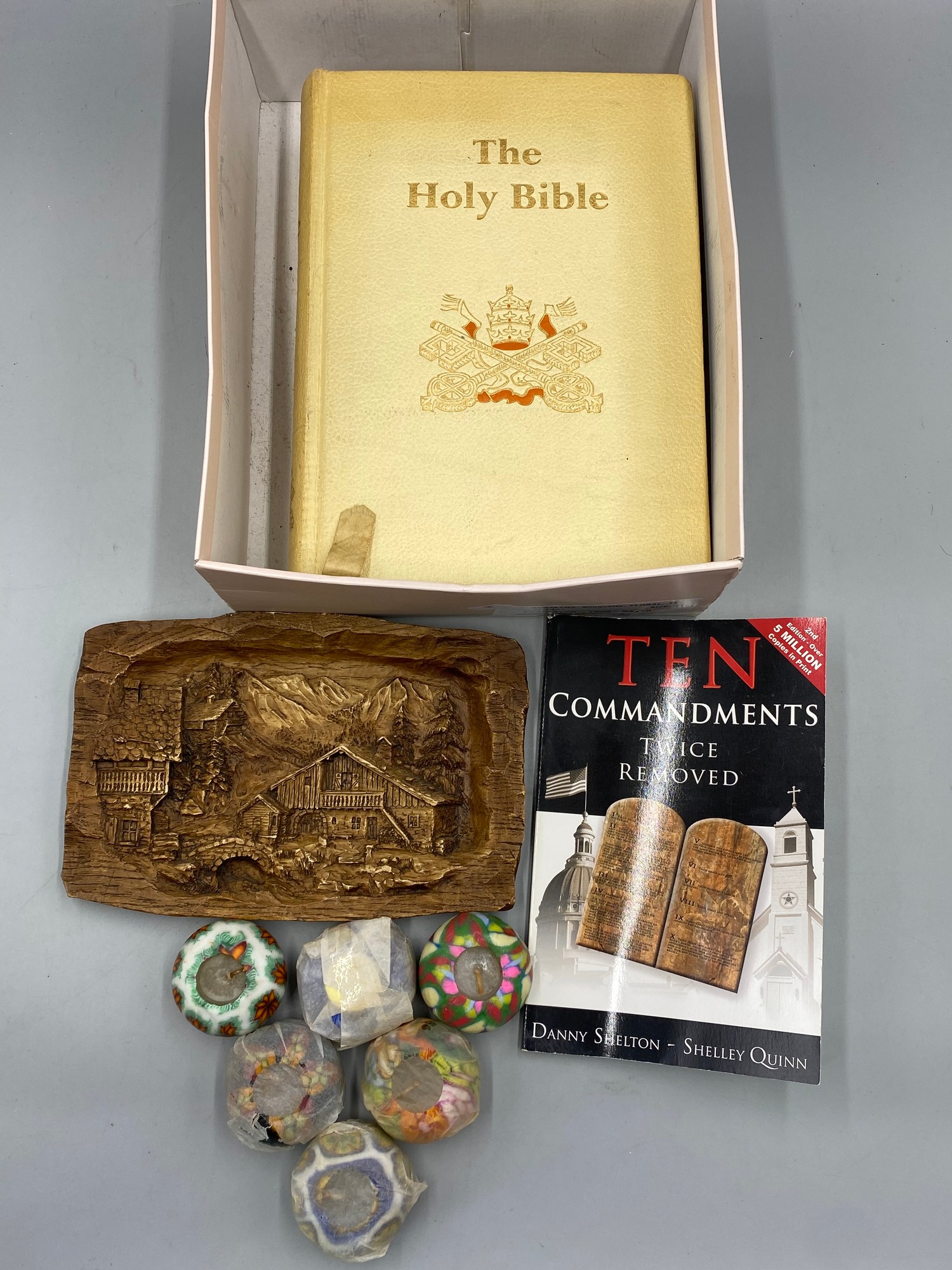 Six Colourful Tealights, The Holy Bible, Ten Commandments and a Wooden Plaque