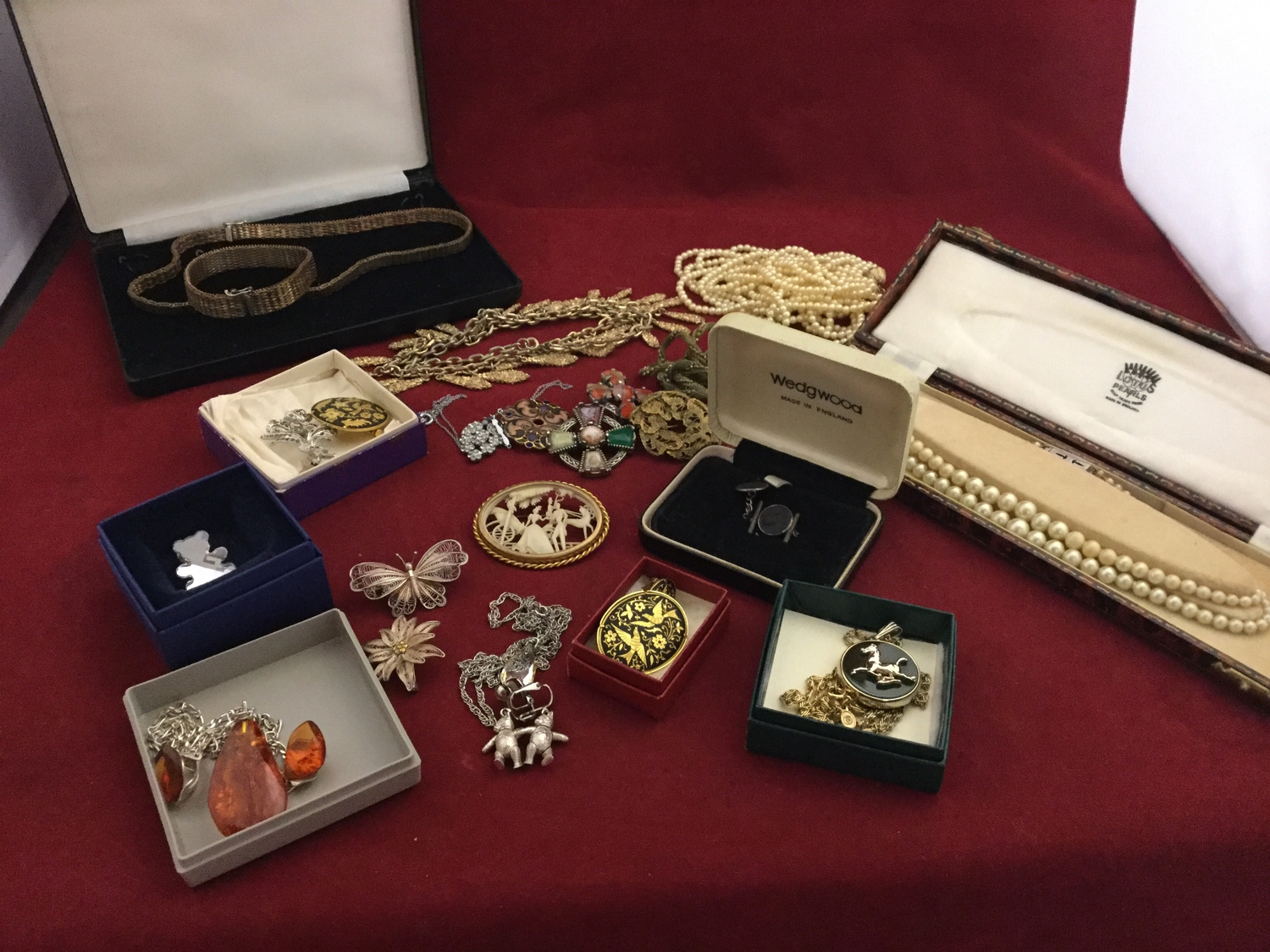 A selection of costume jewellery, including silver and amber pendant on chain and matching ear-clips, Wedgwood basalt cufflinks, silver articulated teddy bear ear-clips etc -