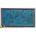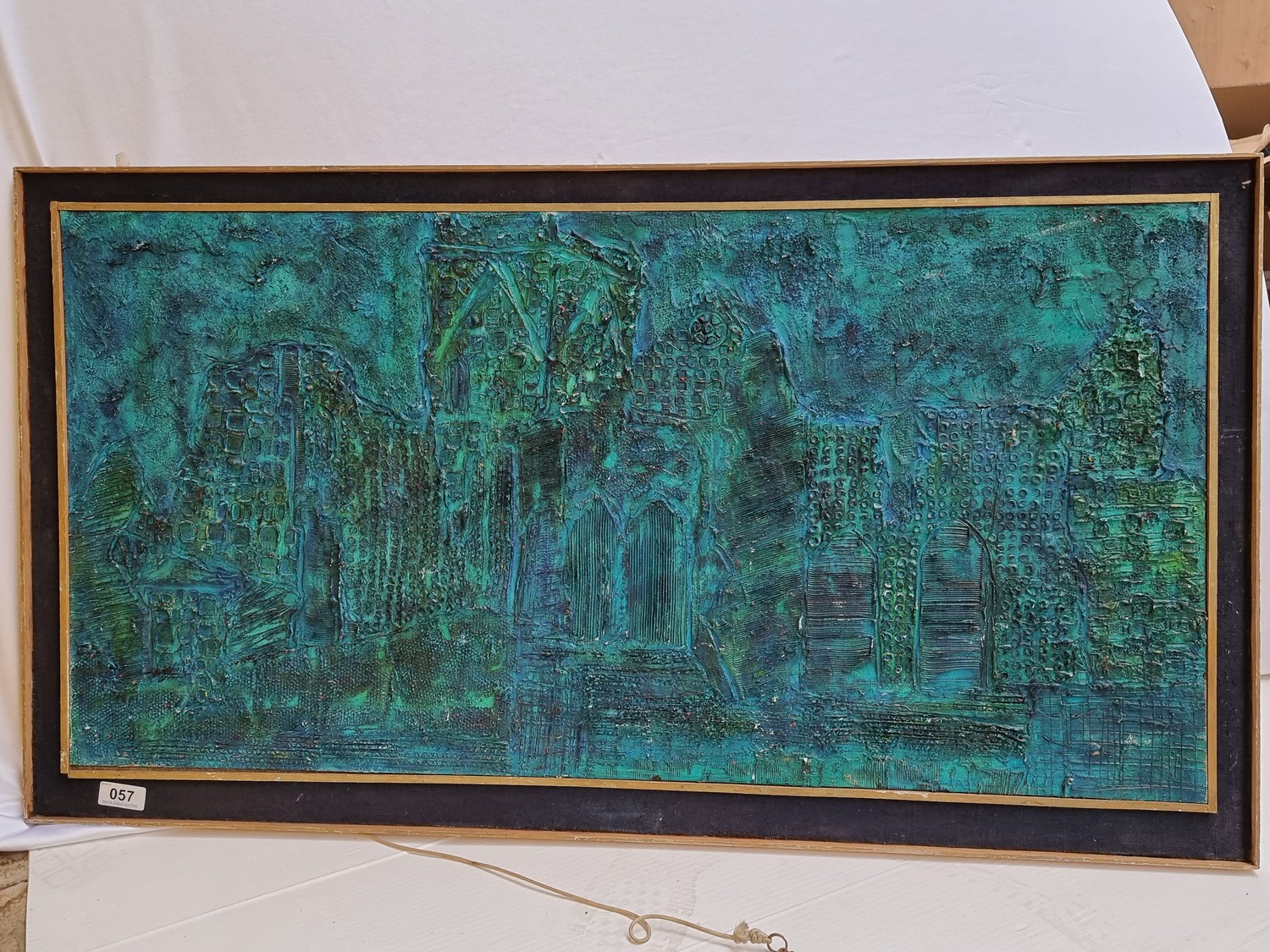 Very large, Painted Gesso abstract depiction of Hore Abbey, near Cashel, Co. Tippery. By Alison Lowe, 1969. Rendered in atmospheric blues and greens. Very tactile Has a great mid century look, a very interesting piece.