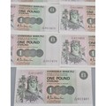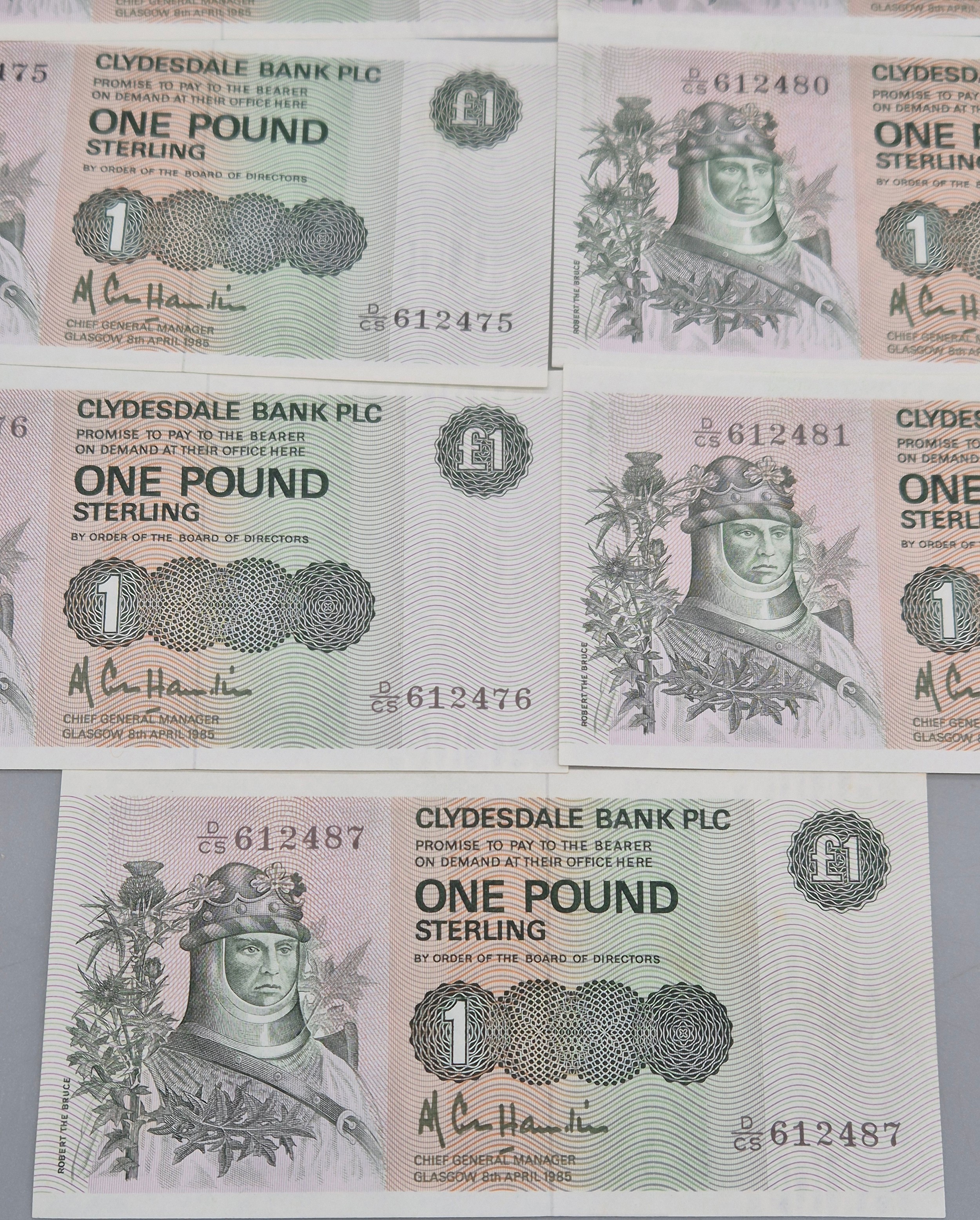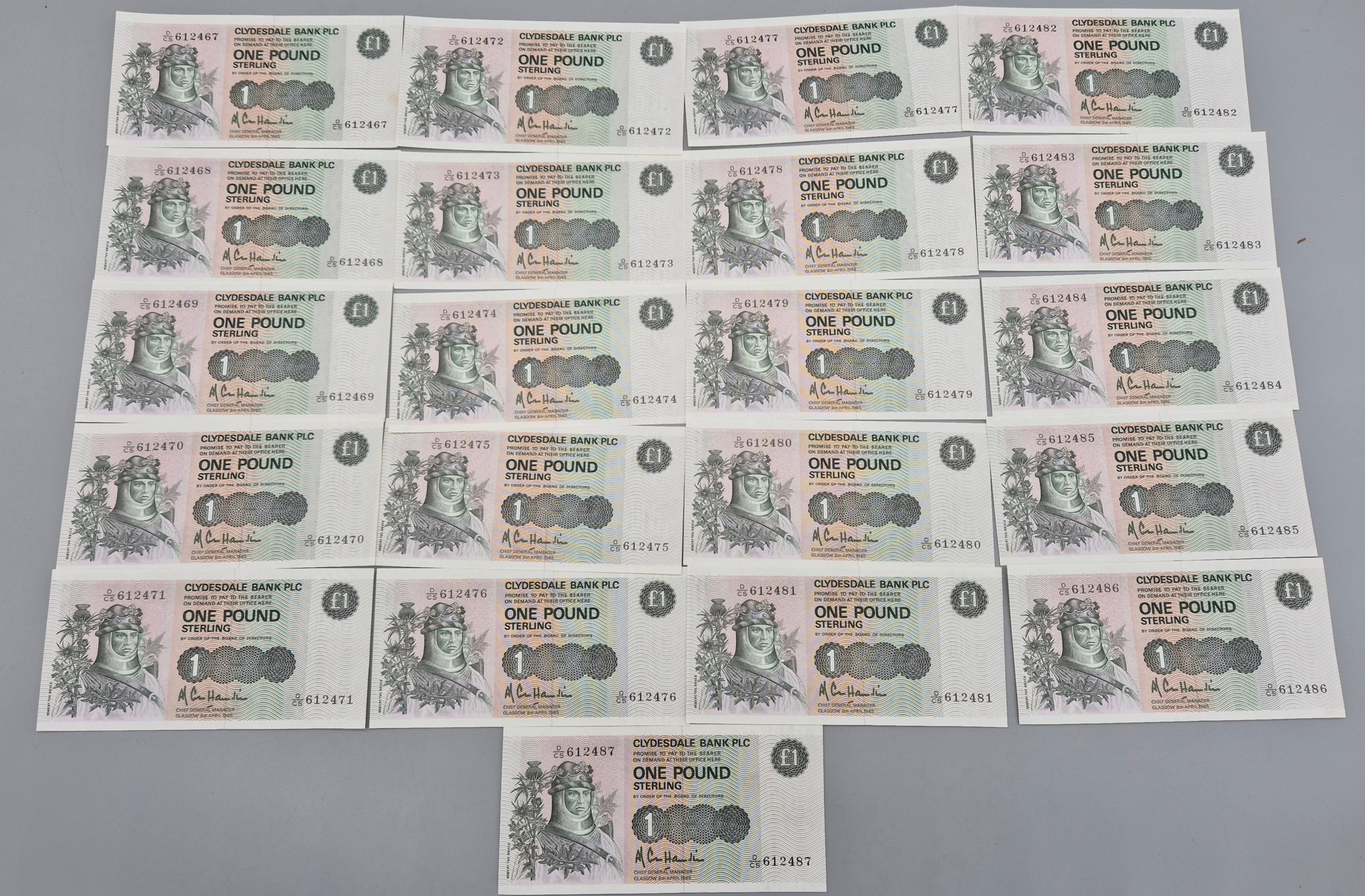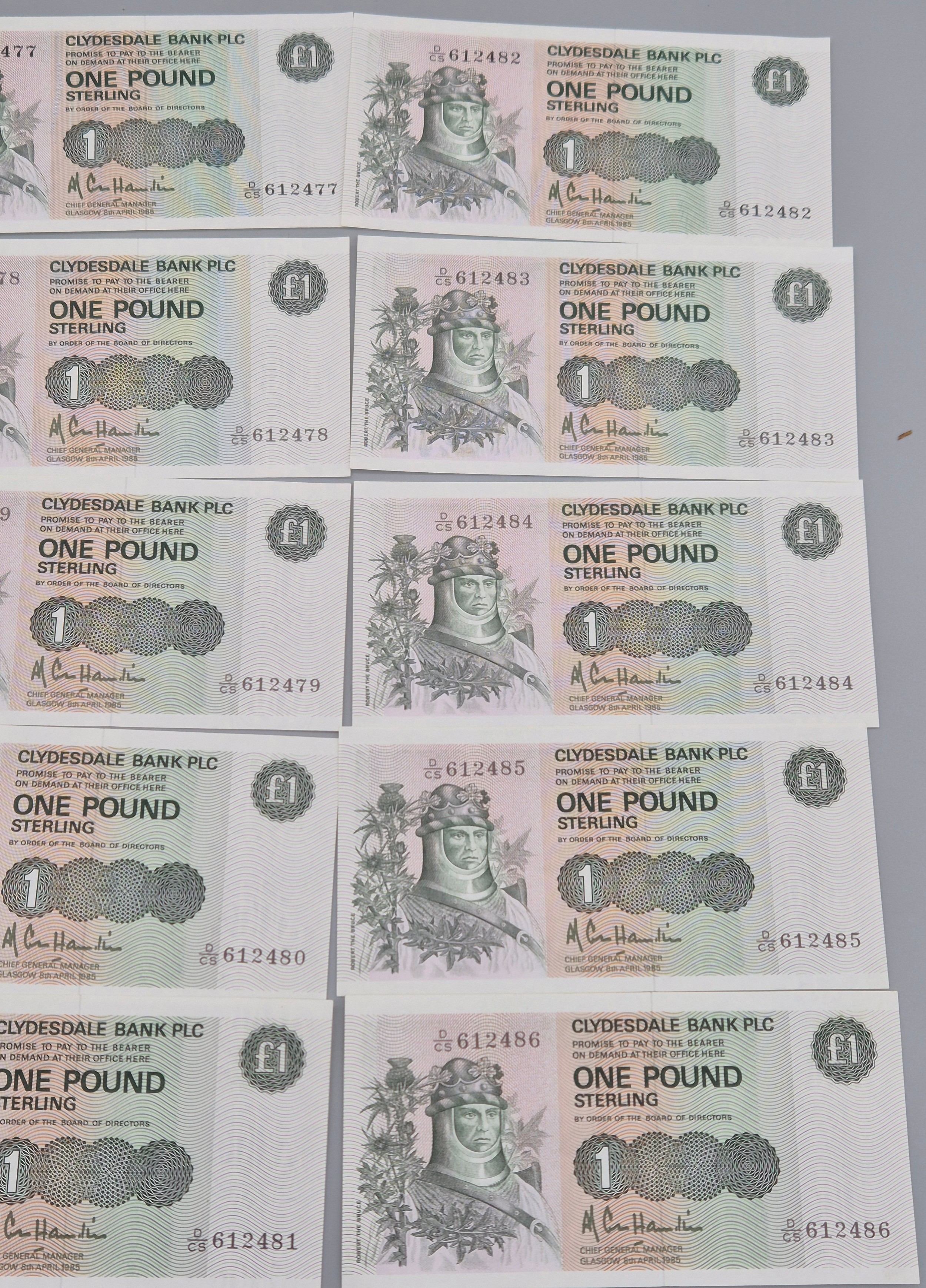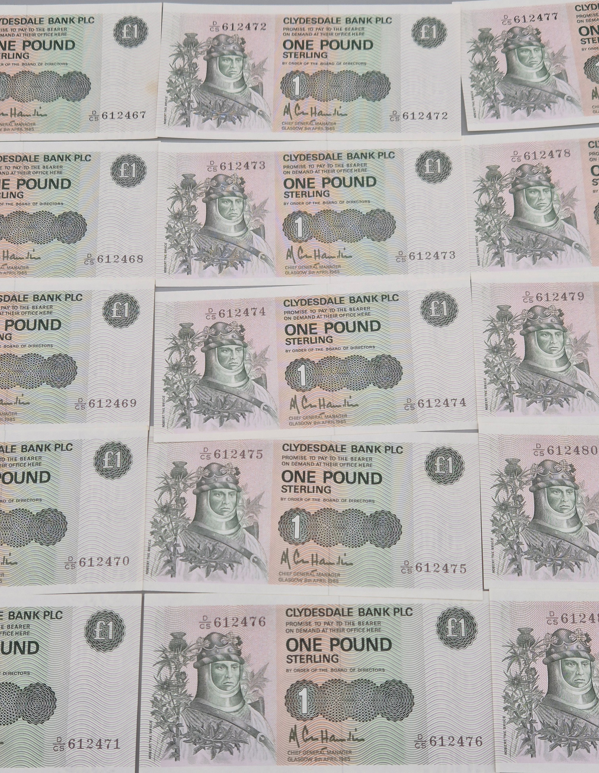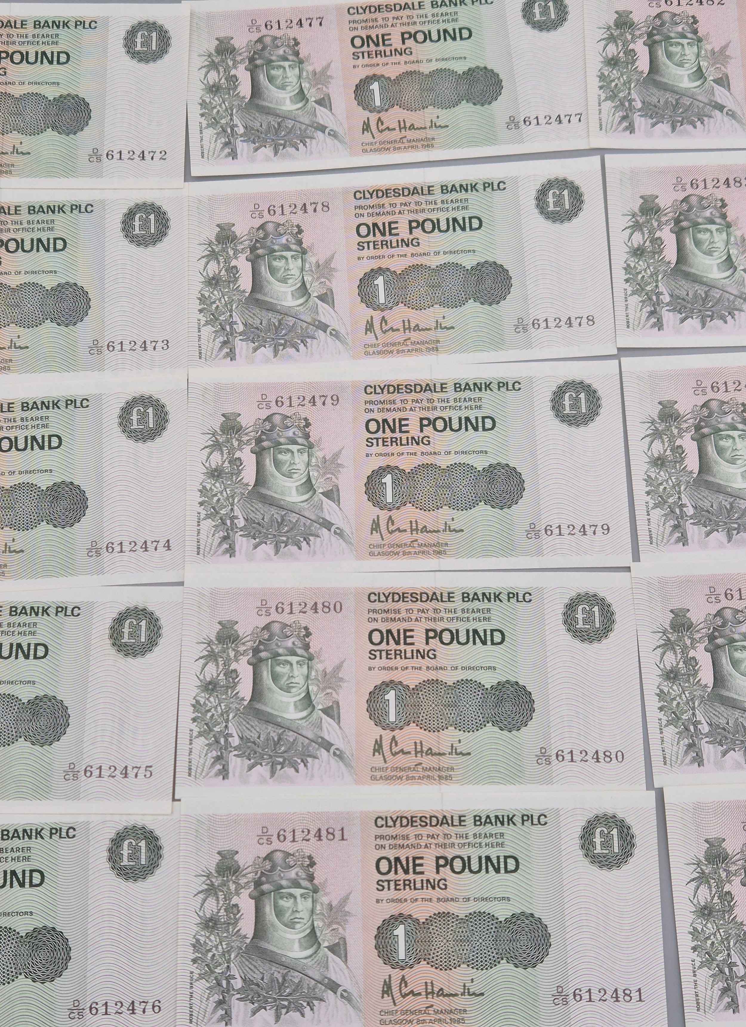 A Lot of twenty One Consecutive Clydesdale Bank Plc one pound bank notes. 1985. "Robert the Bruce". Together with 19th century RBS Envelope.
