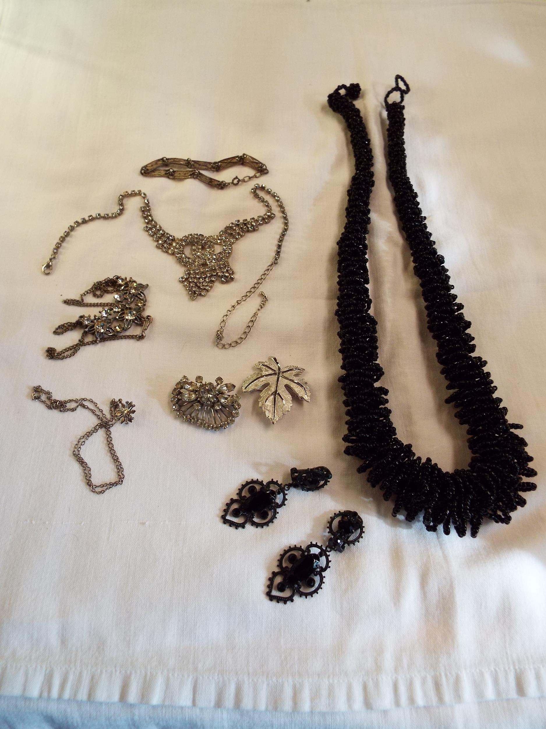 A mixed selection of vintage costume jewellery to include beaded necklace, paste necklaces, earrings, brooch etc