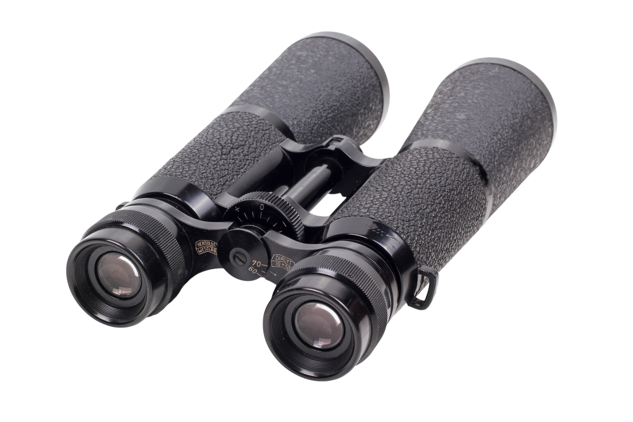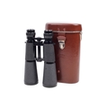 A pair of Hensoldt Dialyt 10 x 50 binoculars. Serial number 829410. Lenses G/VG, focuses well at near and far distances. Together with rear cap, strap, and brown leather makers case.