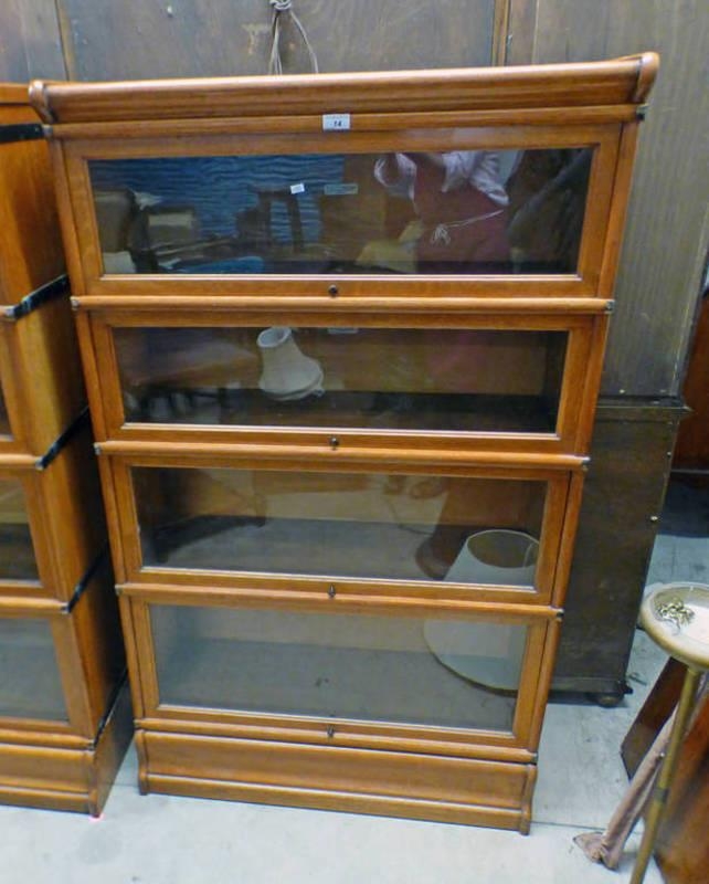 EARLY 20TH CENTURY OAK 4 TIER SECTIONAL BOOKCASE WITH 4 GLASS PANEL DOORS. MARKED 'THE GLOBE - WERNICKE CO, LONDON'. WIDTH 86CM X HEIGHT 147 CM