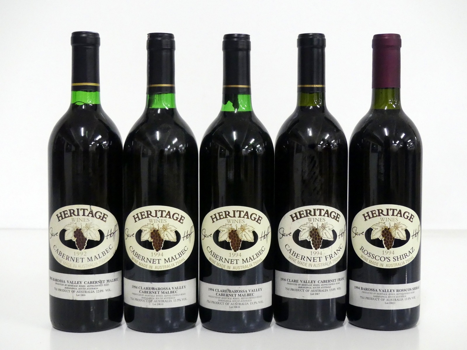 1 bt Heritage Wines Cabernet Malbec 1992 i.n 2 bts Heritage Wines Cabernet Malbec 1994 Clare/Barossa Valley i.n, sl bs 1 bt Heritage Wines cabernet Franc 1994 Clare Valley 1 bt Heritage Wines Rossco's Shiraz 1994 Barossa vts Above 5 bottles