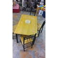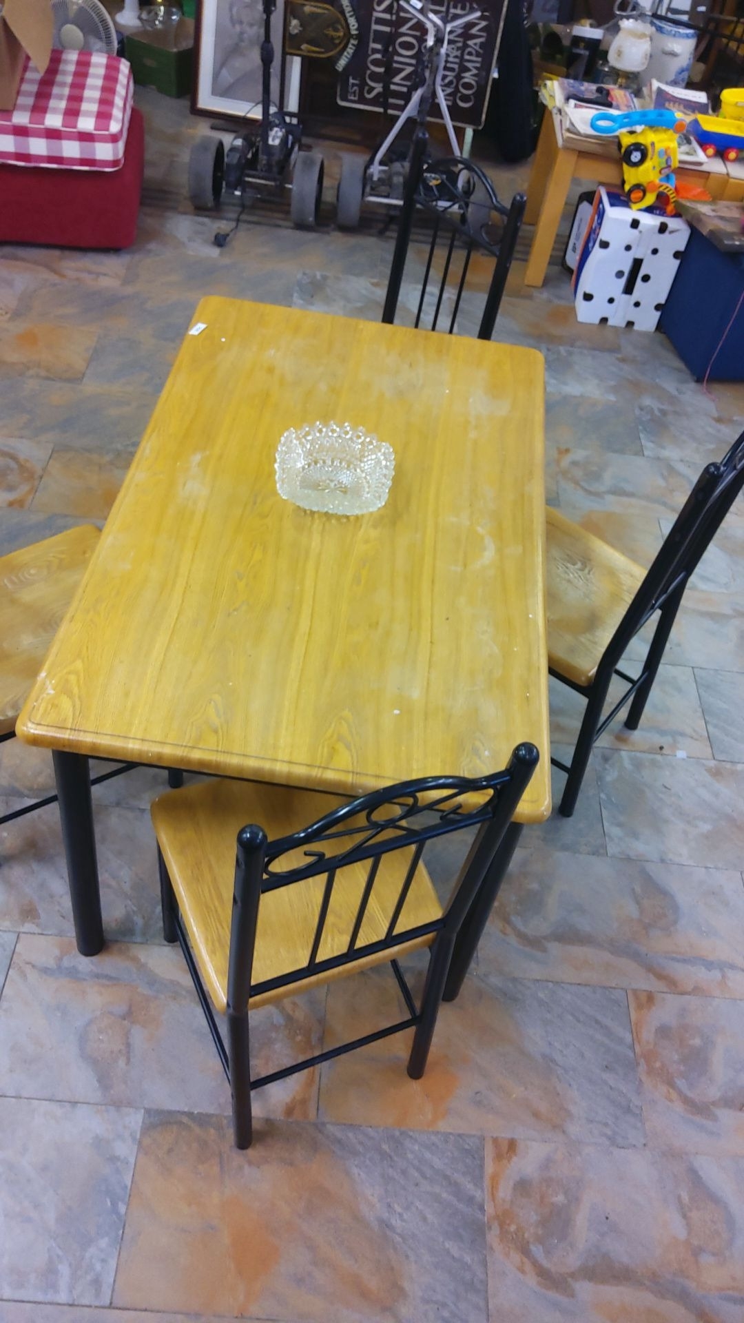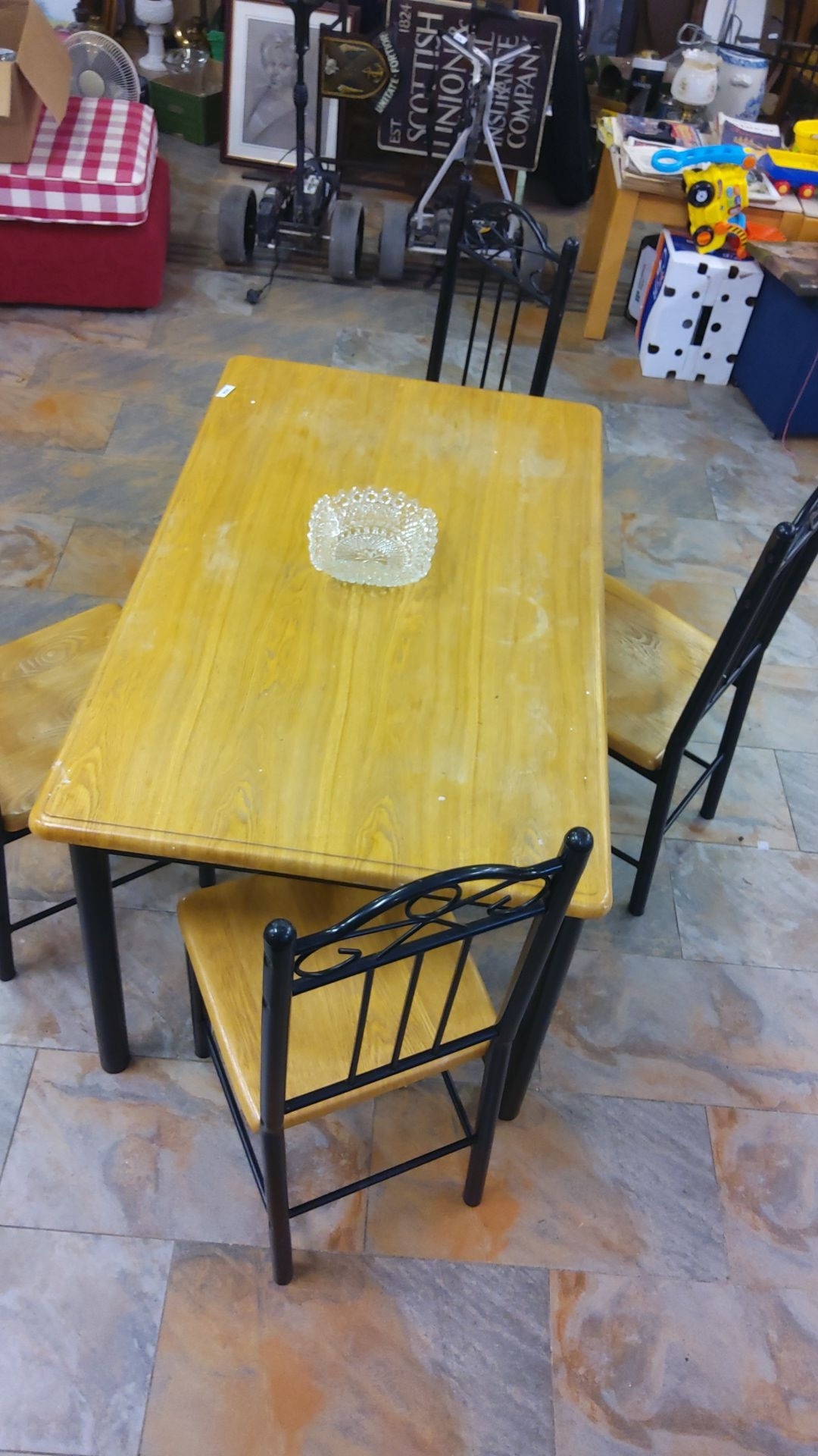 Wooden dining set includes a rectangular table and four chairs with metal accents.
