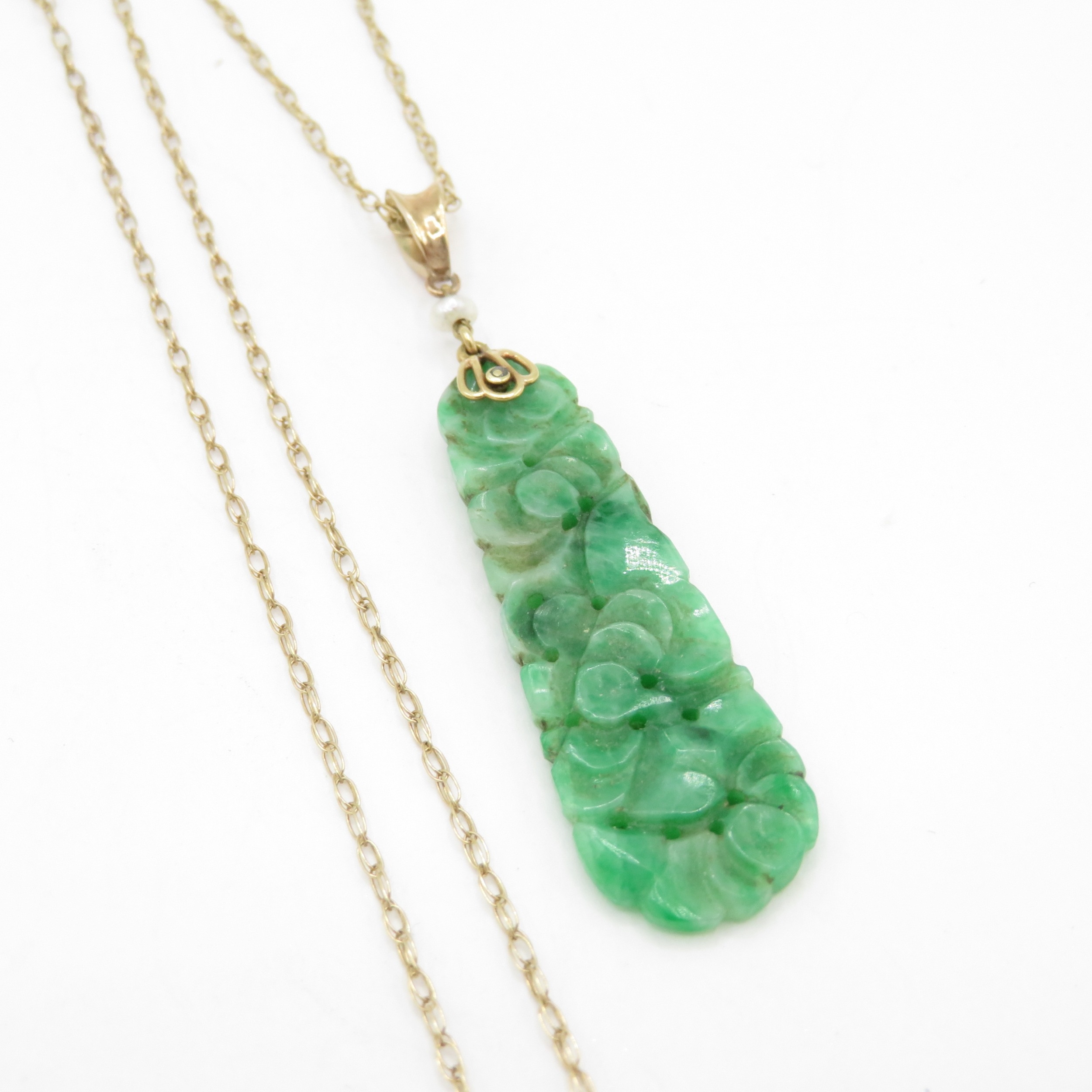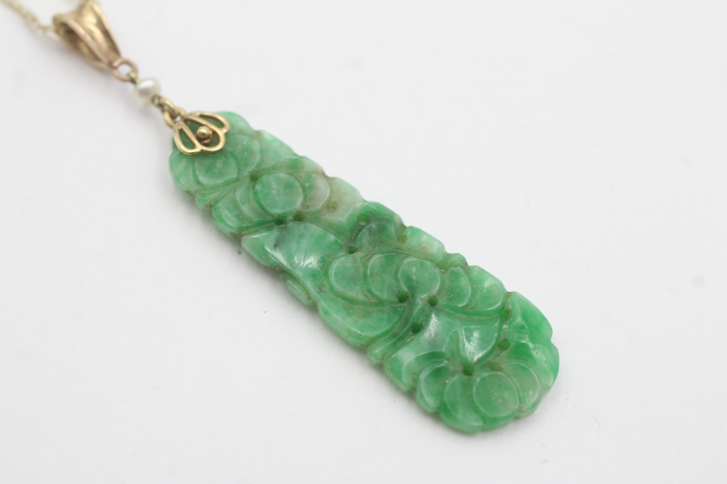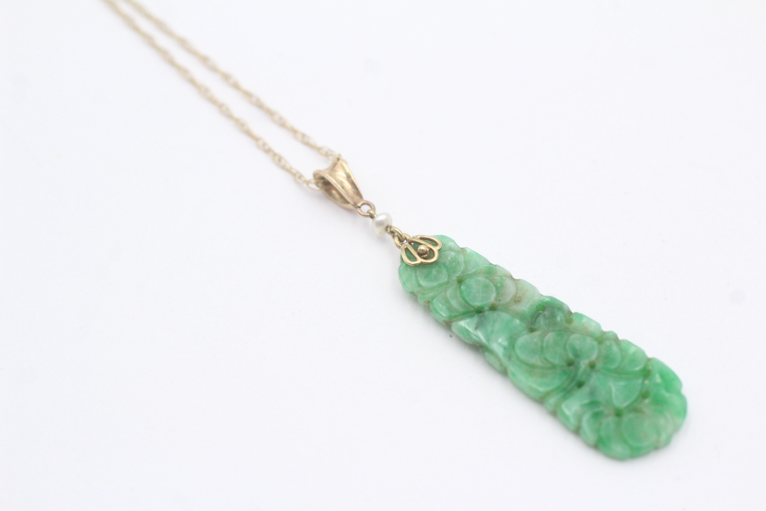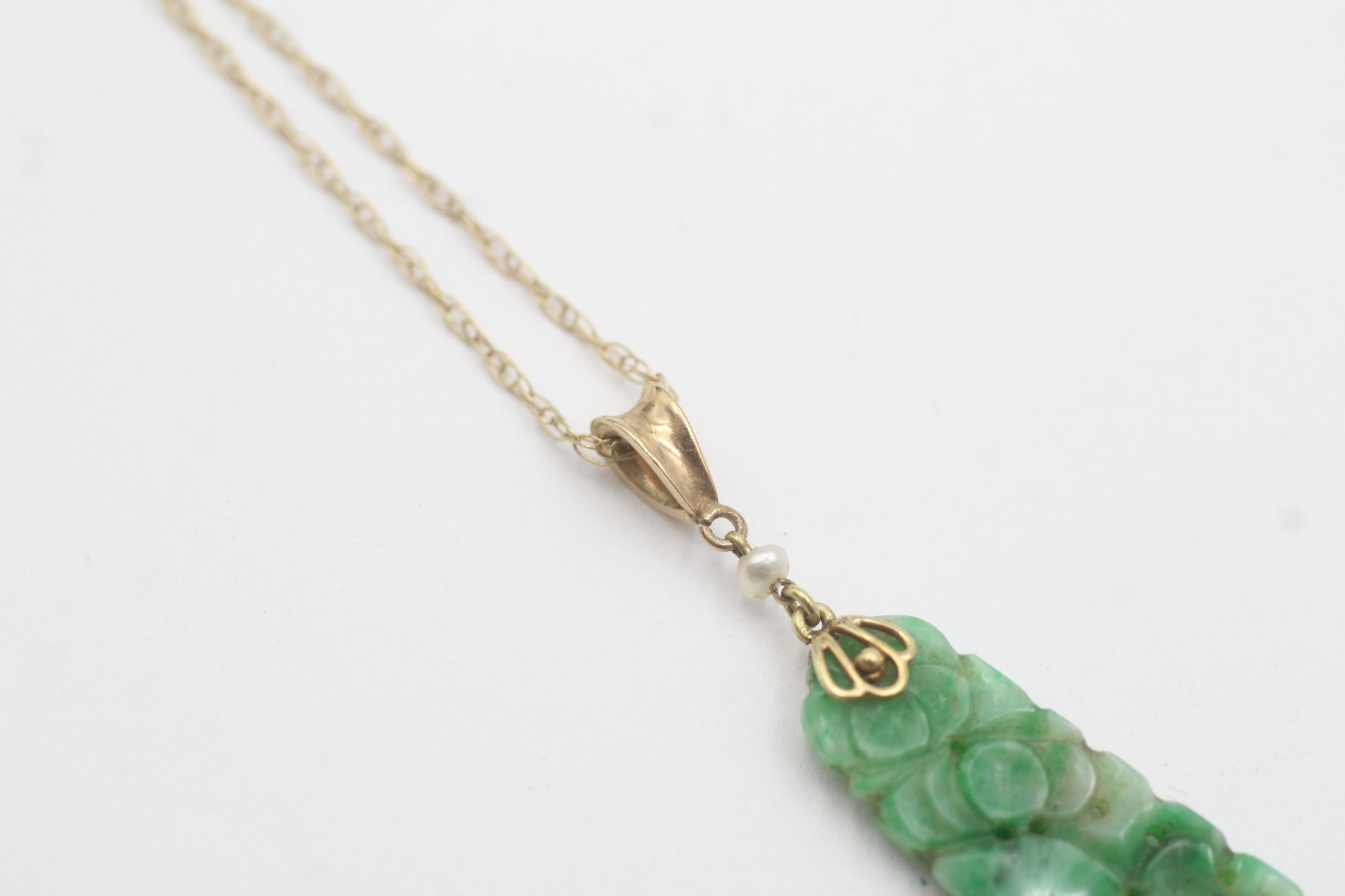 9ct gold carved jade seed pearl necklace (2.7g)