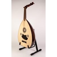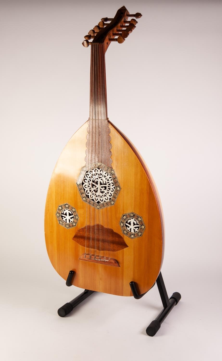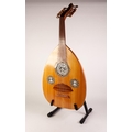 MIDDLE EASTERN OUD, with inlaid borders to the octagonal sound holes, kufic written label visible to interior, 35” (89cm) long, in semi rigid black case, not original, tight fit.