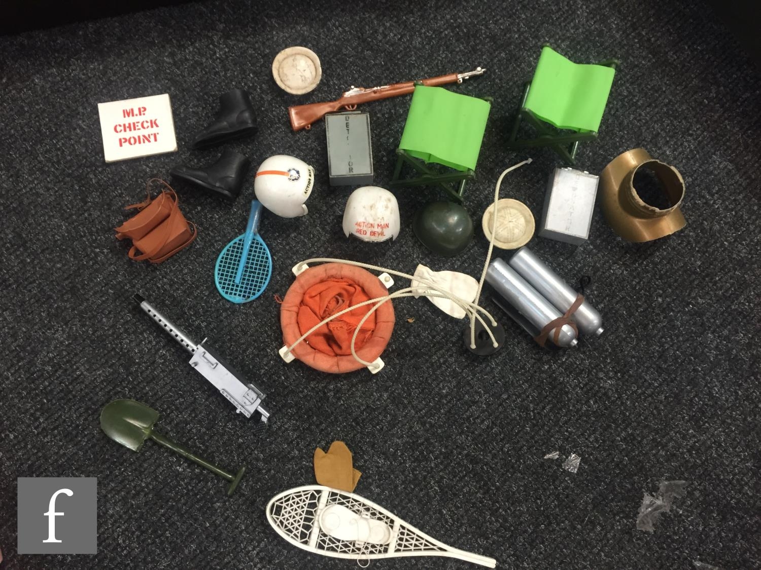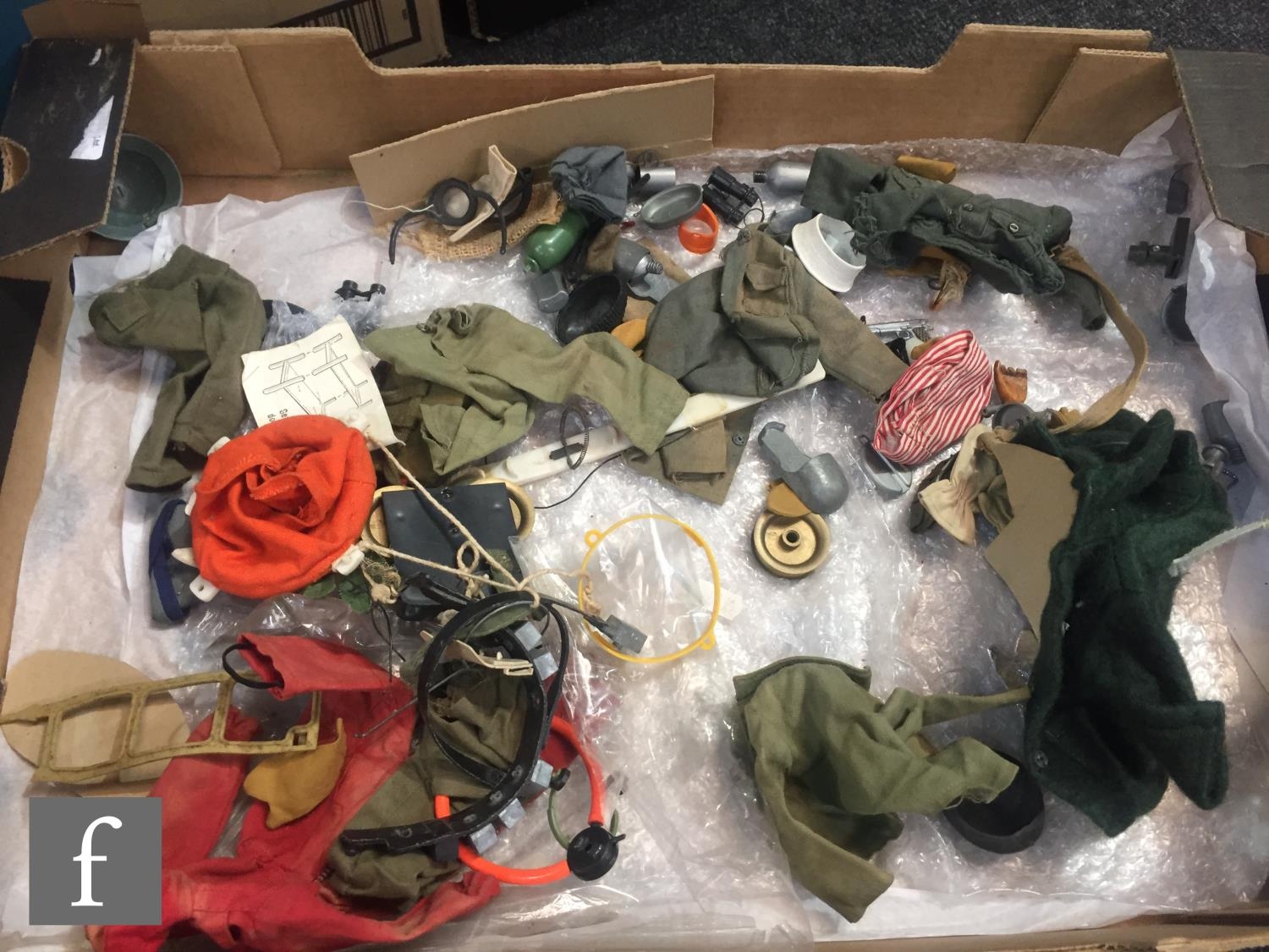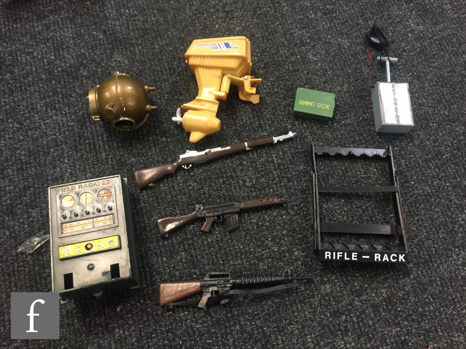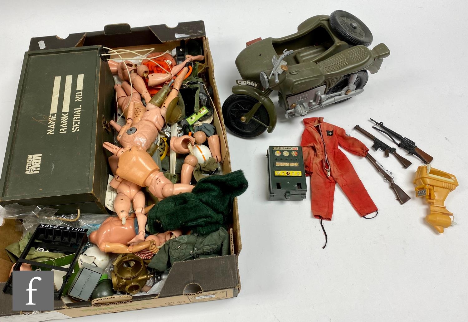A collection of assorted Palitoy Action Man items to include assorted bodies for spares or repair including an Atomic Man body, a first issue Foot Locker, a Cherilea German Motorcycle and Sidecar, and assorted clothing and accessories.