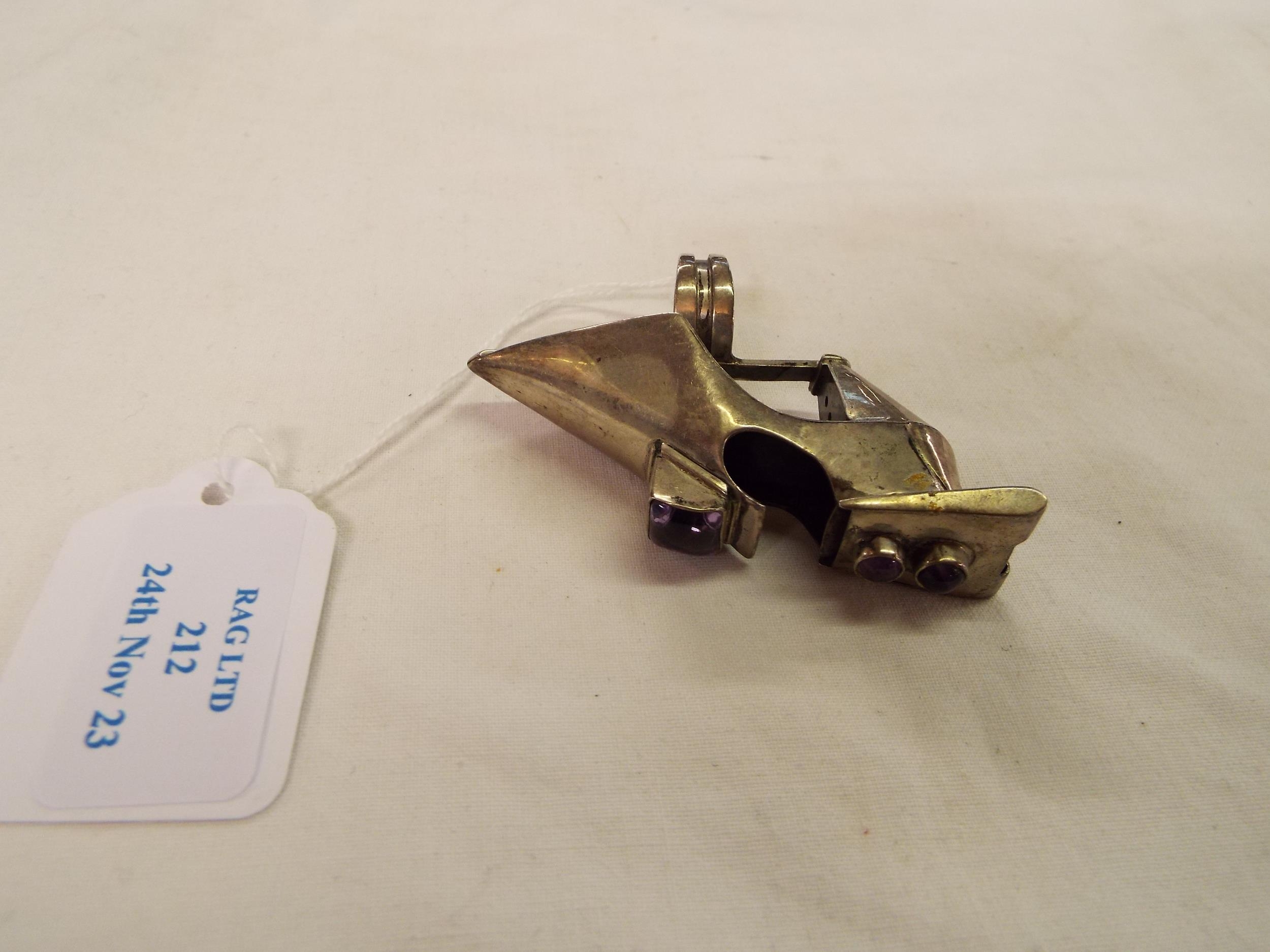 An unusual white metal ring with attached high heel shoe