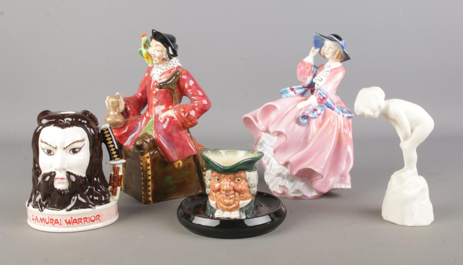 A small collection of Royal Doulton figures including Long John Silver, Top O The Hill, Parson Brown ash pot.