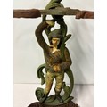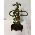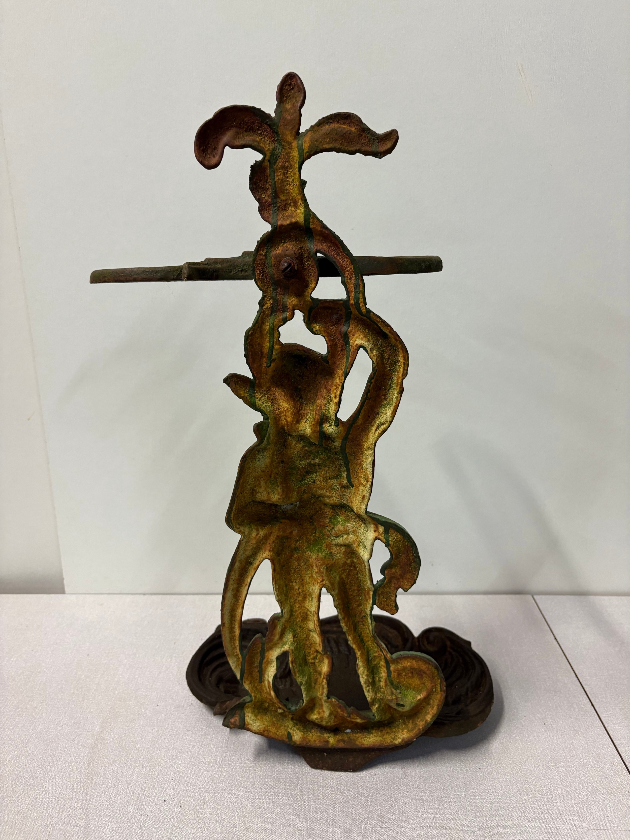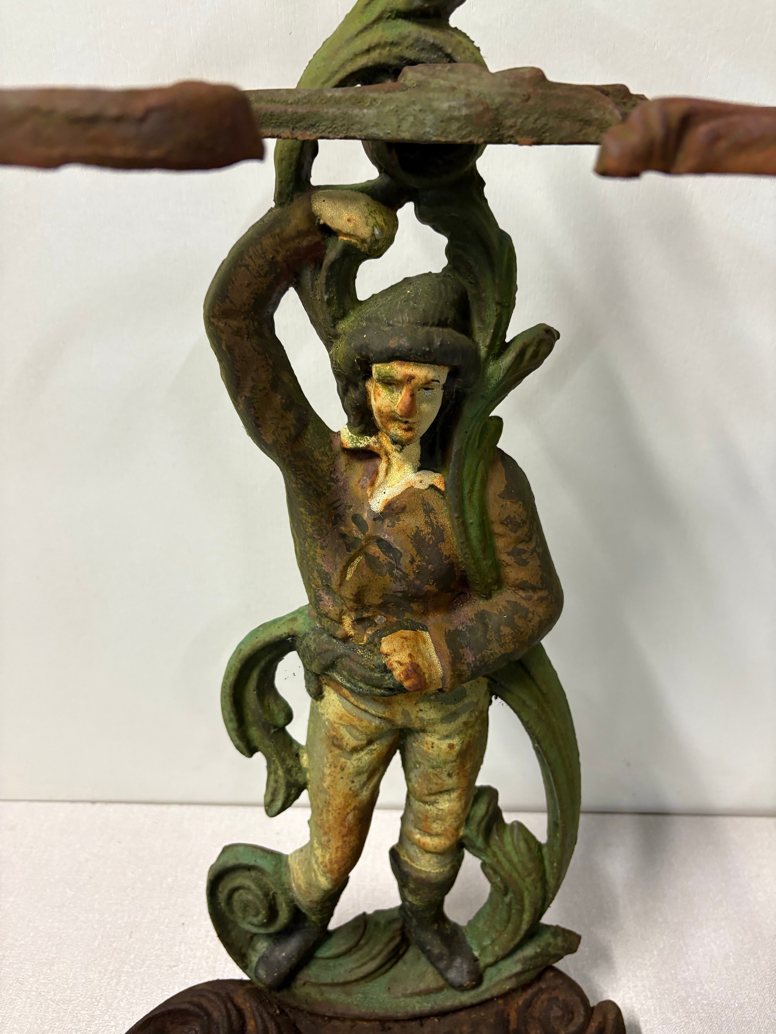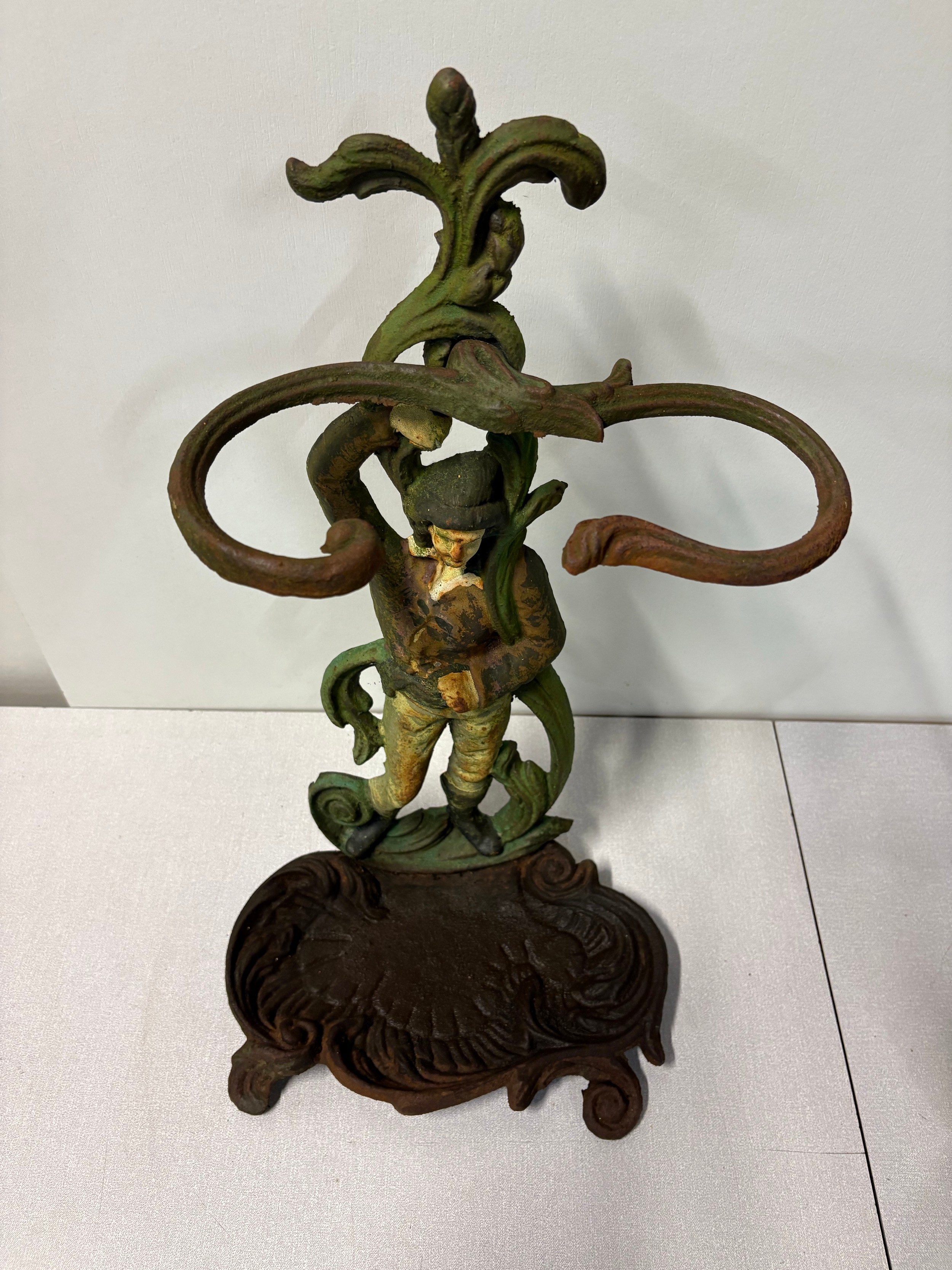 Vintage art nouveau painted cast iron figural umbrella/stick stand, 22" tall.