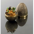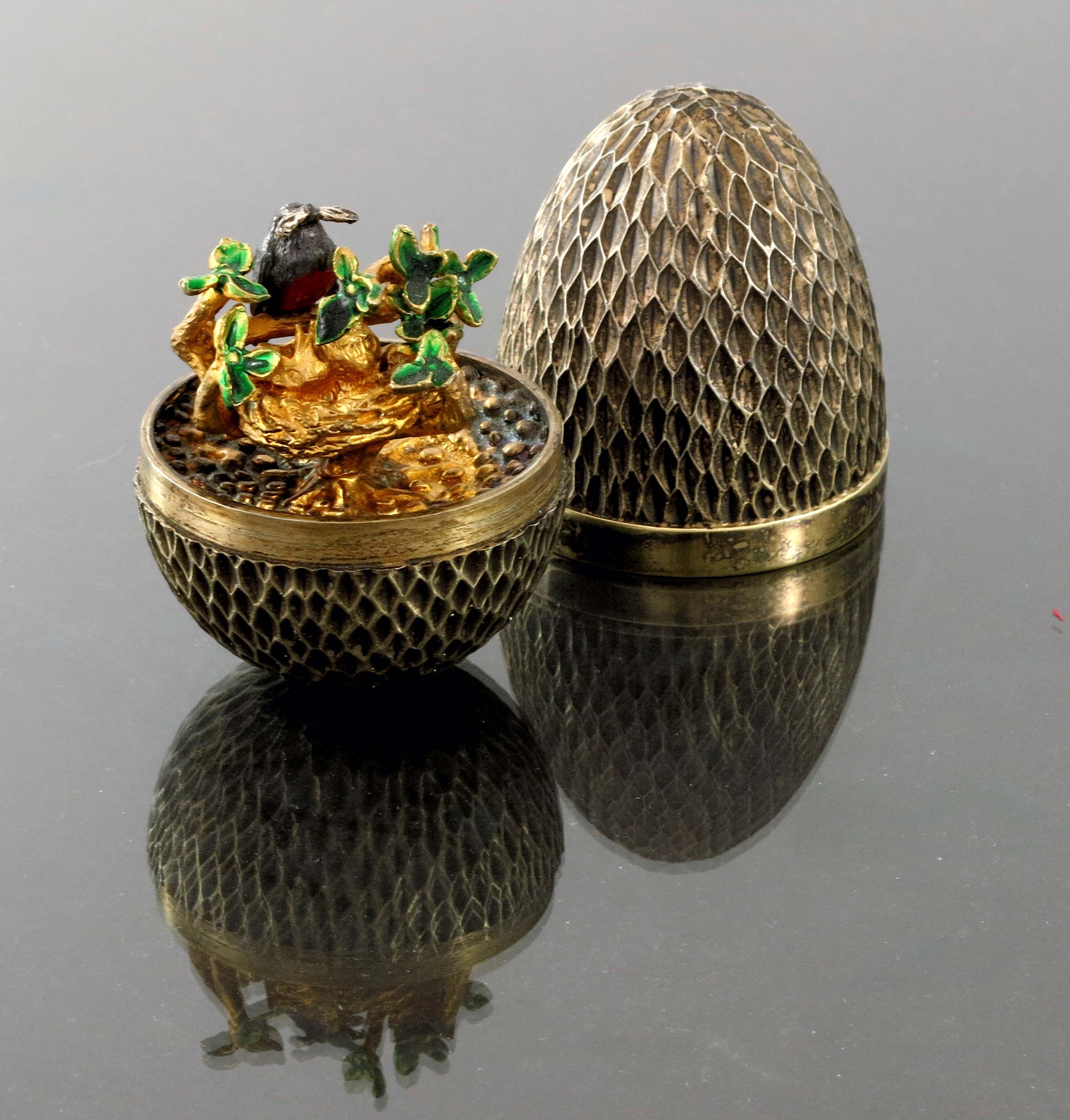 Stuart Devlin, a Modernist silver gilt and enamelled novelty surprise egg, London 1976, rusticated body with plain band, opening to reveal a robin with worm, feeding chicks in a leafy branch, with box, numbered 74, 7.5cm long, 5.91ozt