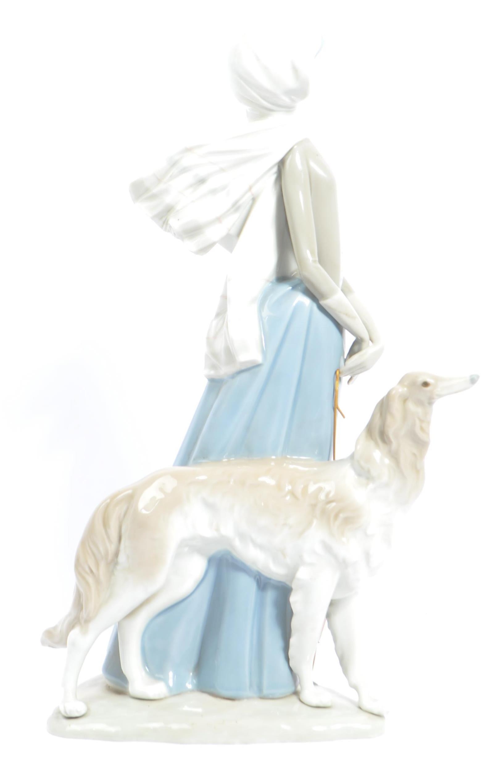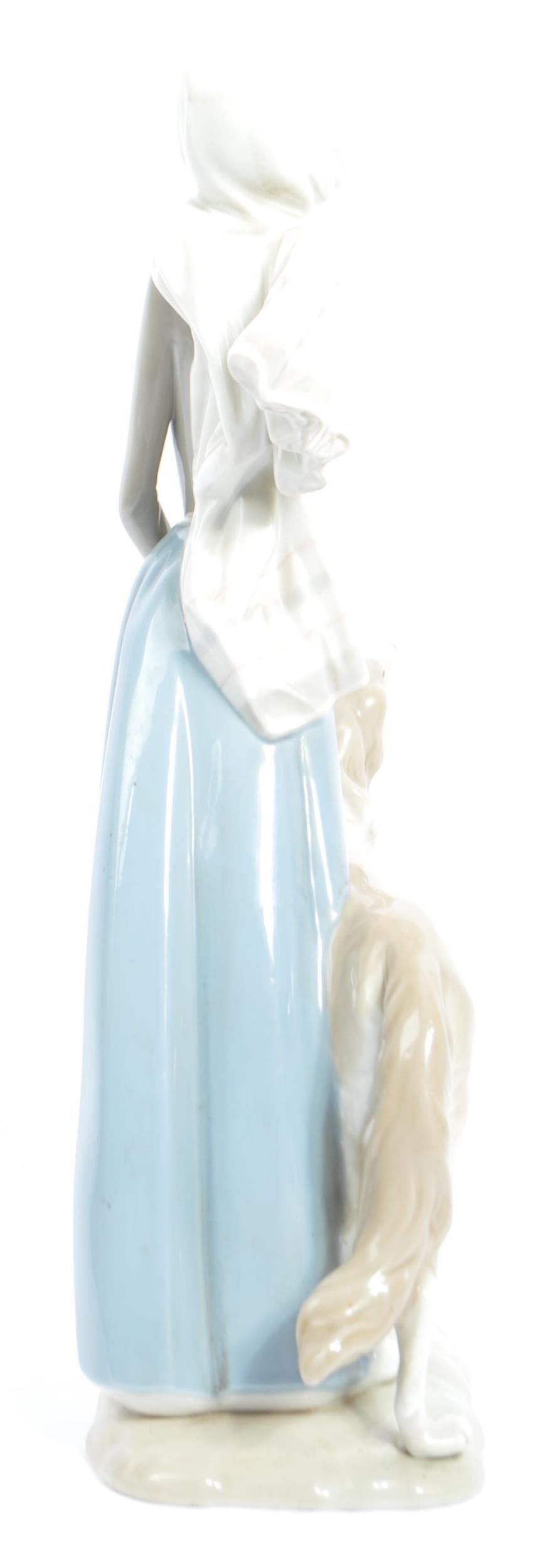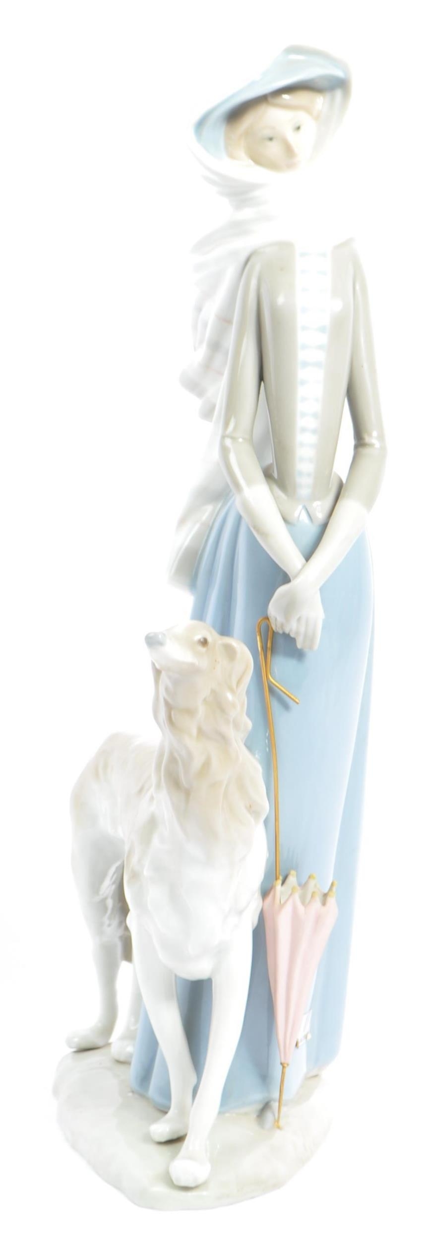 Lladro - A large vintage 20th century Spanish porcelain Lladro figurine in the form of a gentlewoman holding parasol with pet dog at her side. No. 4594. Measures 40cm tall.