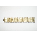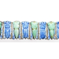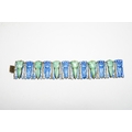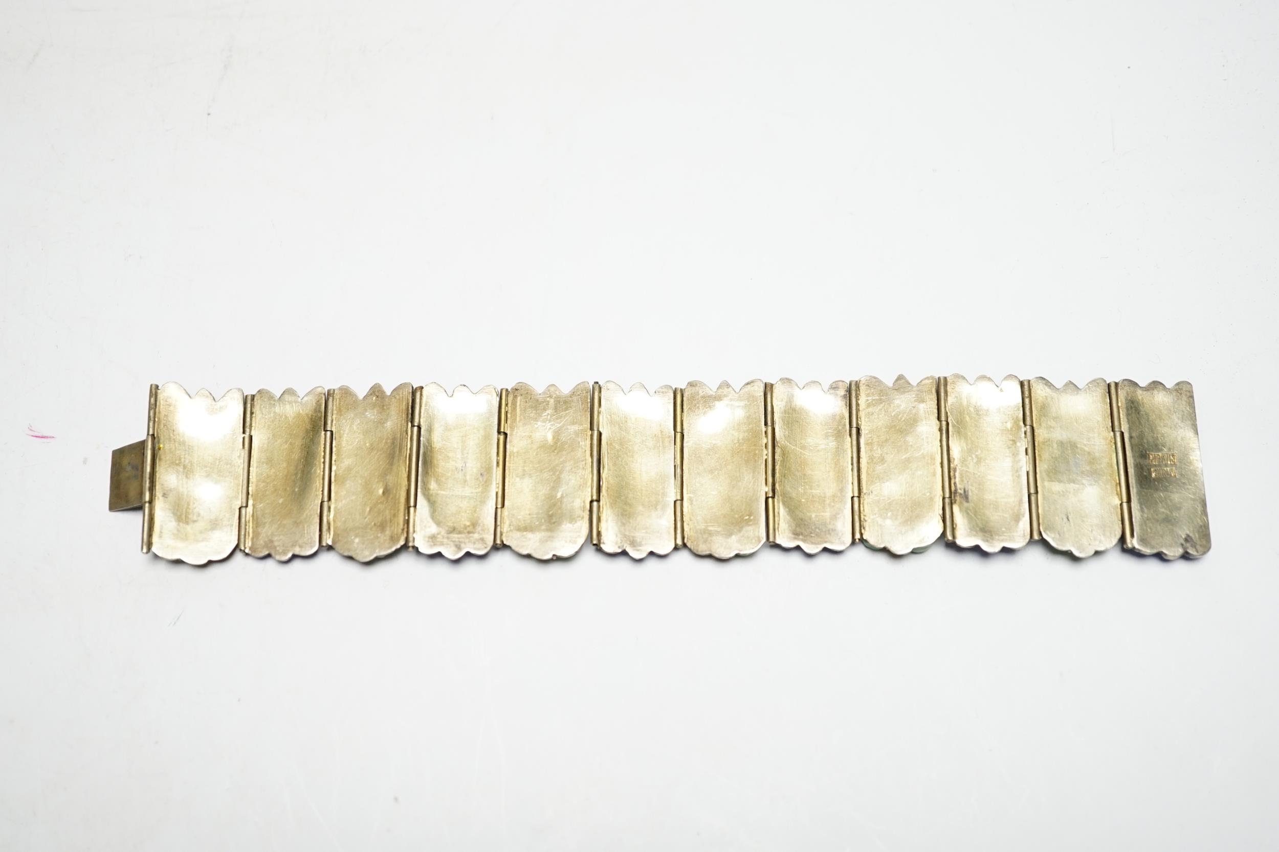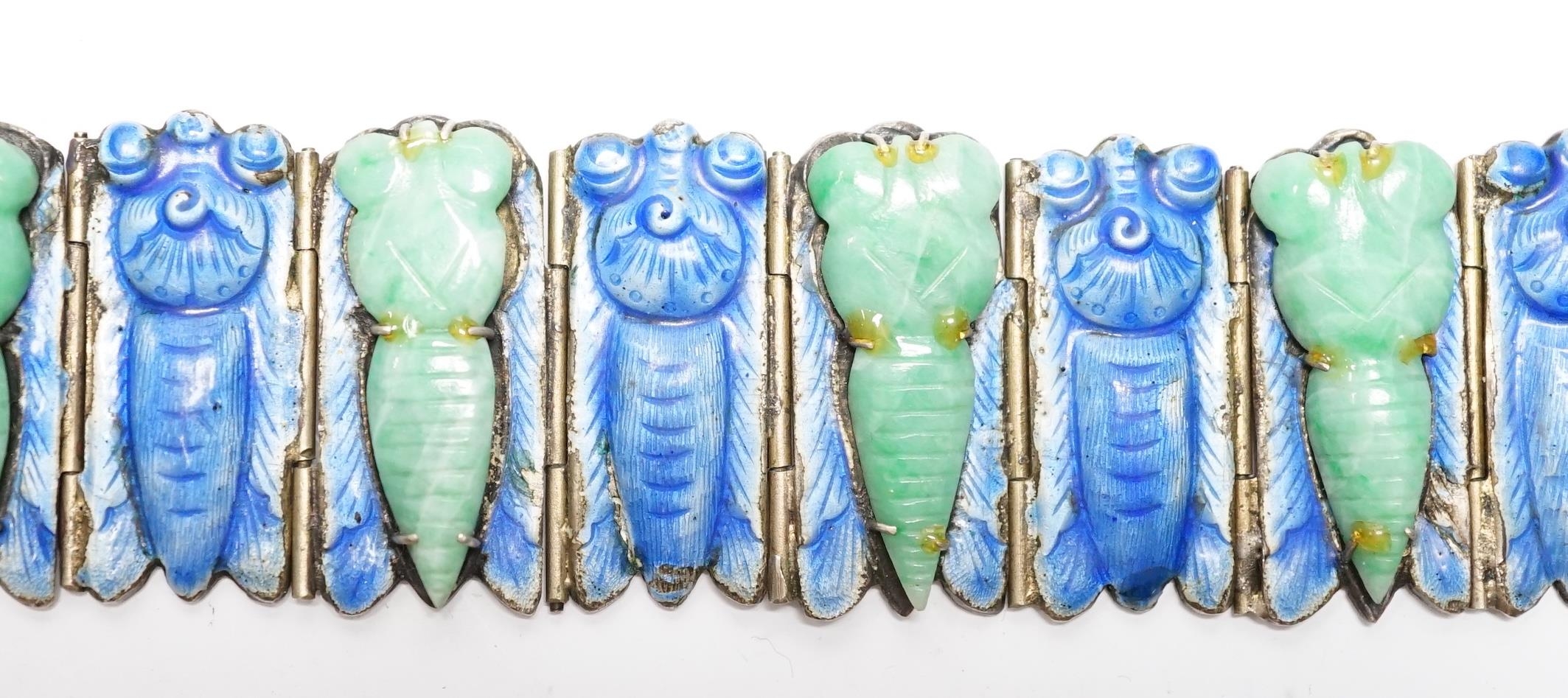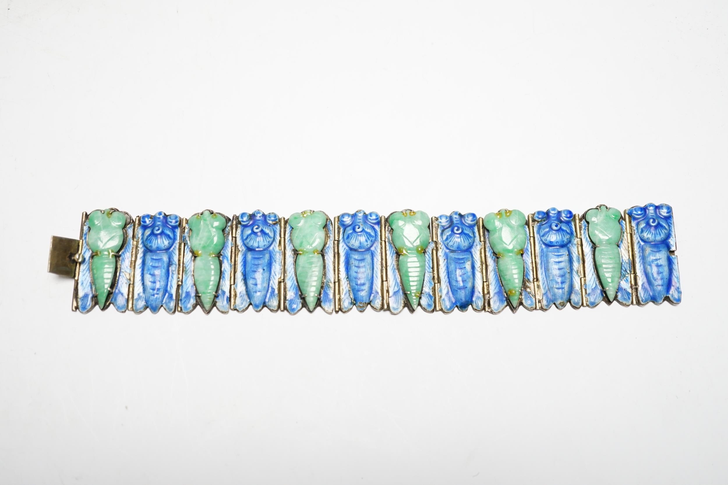A Chinese gilt white metal, blue enamel and green hardstone set 'cicada' bracelet, 18cm.