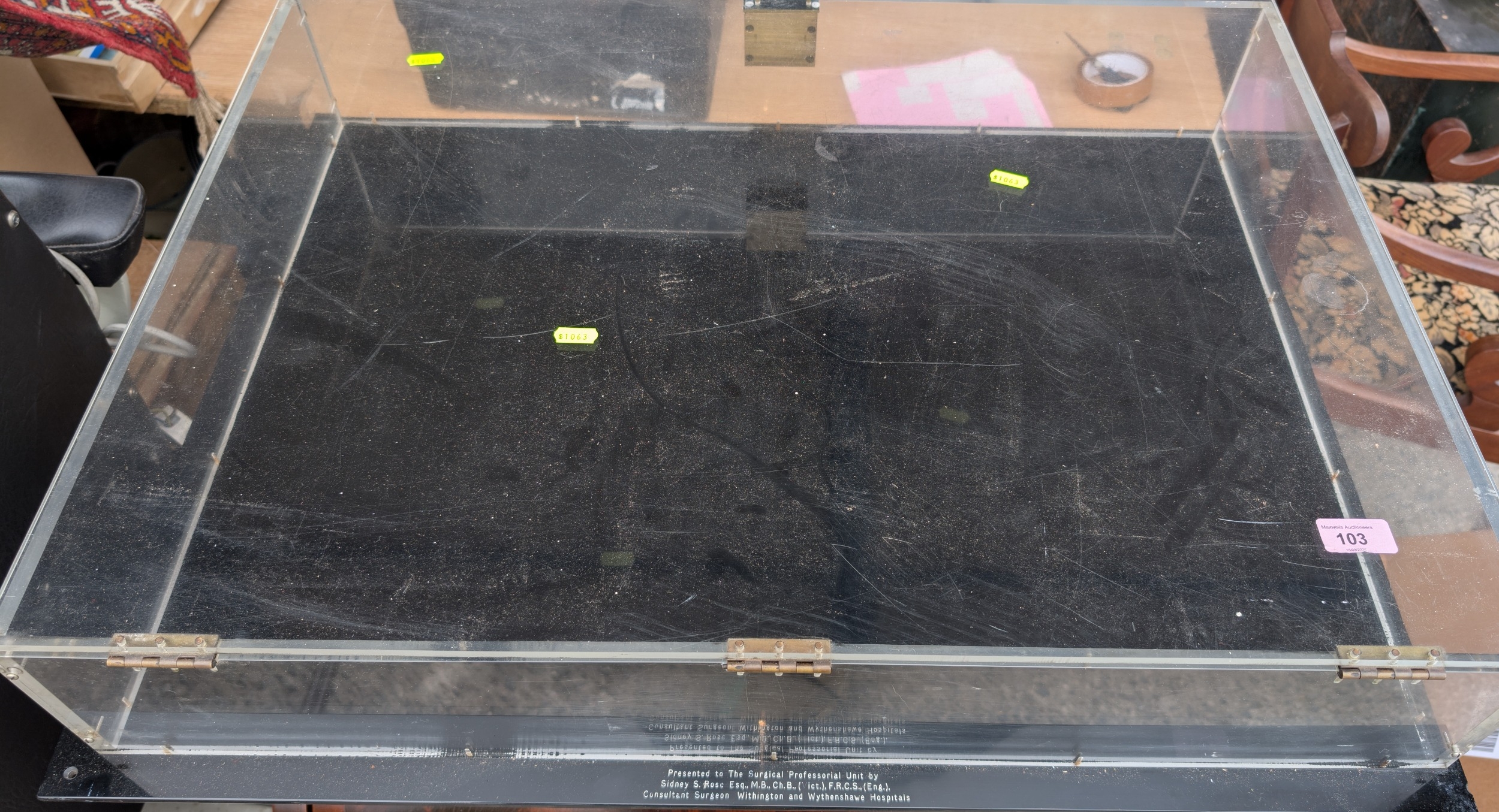 A display cabinet awarded to Wythenshawe Hospital, hinged lid, 58 x 78cm