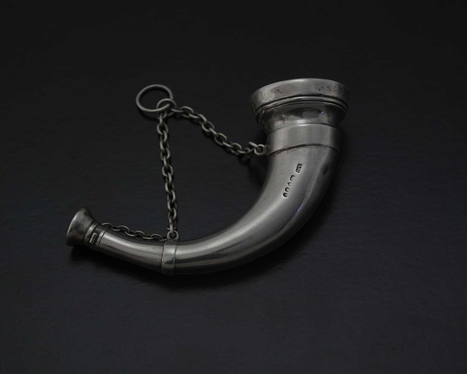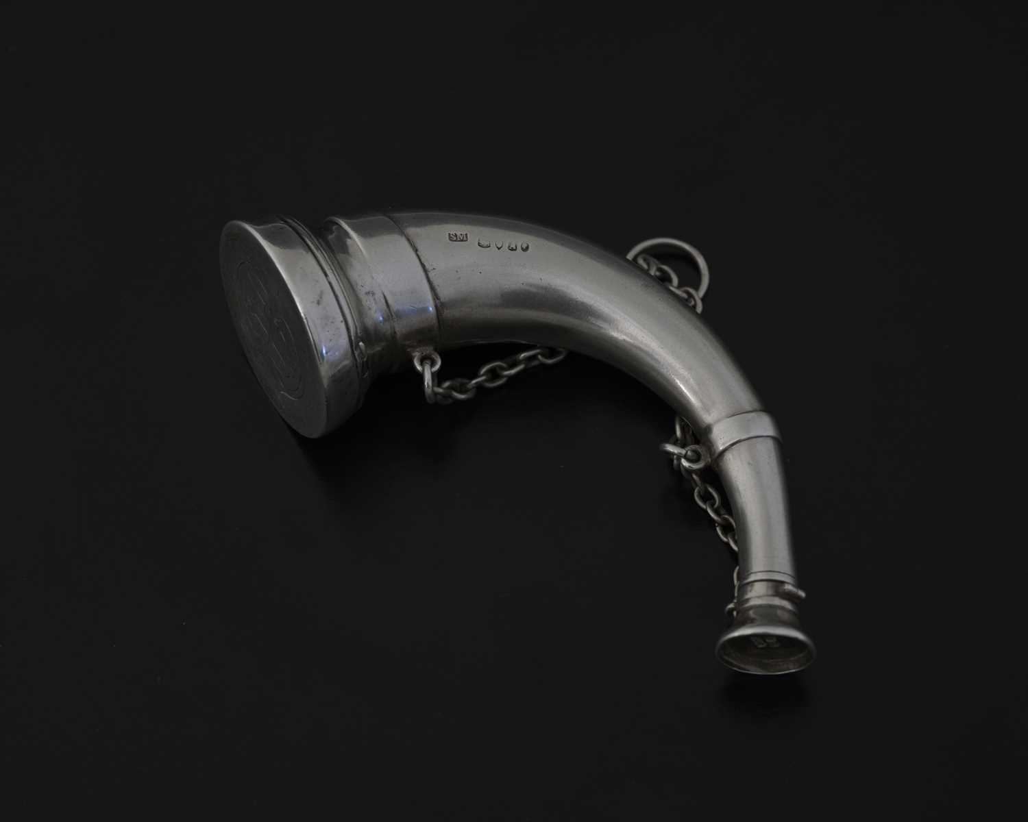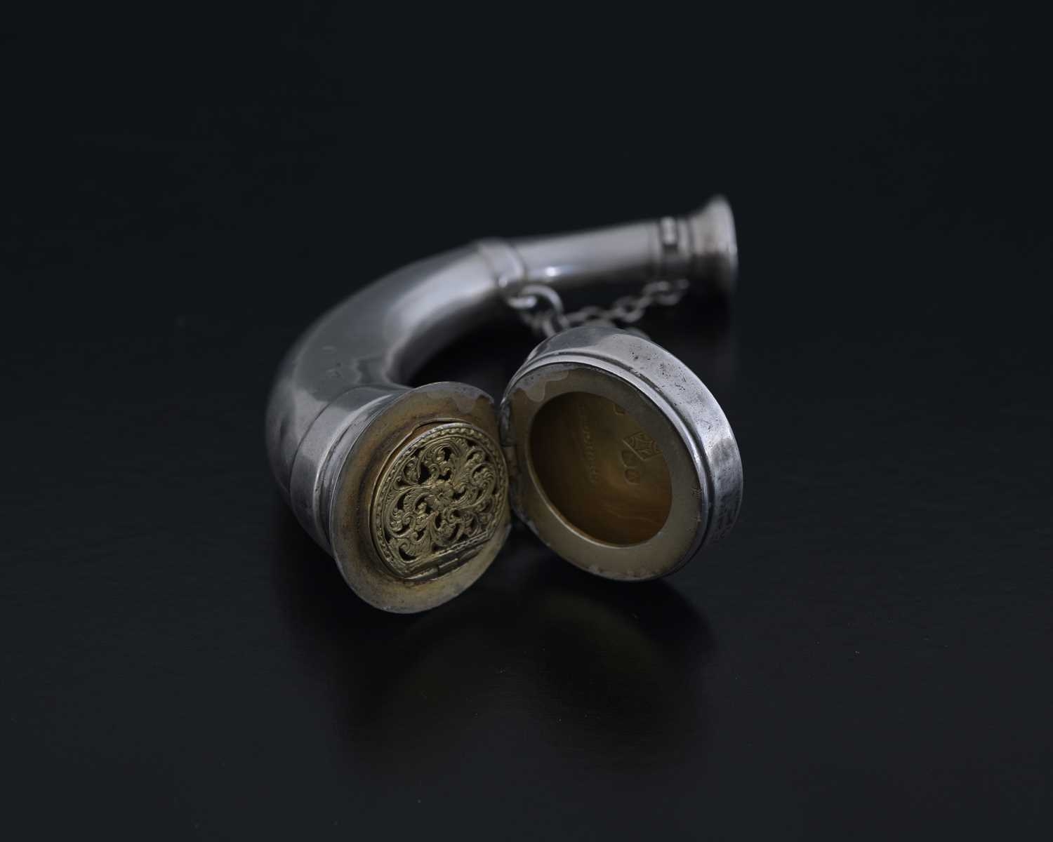 Sampson Mordan, a Victorian silver novelty combination scent bottle and vinaigrette, London 1876, in the form of a horn, the top hinged cover opens to reveal a gilt interior, with a gilt hinged pierced grille, retailed by Leuchars, length 10.5cm, weight 60g/1.92ozt approx