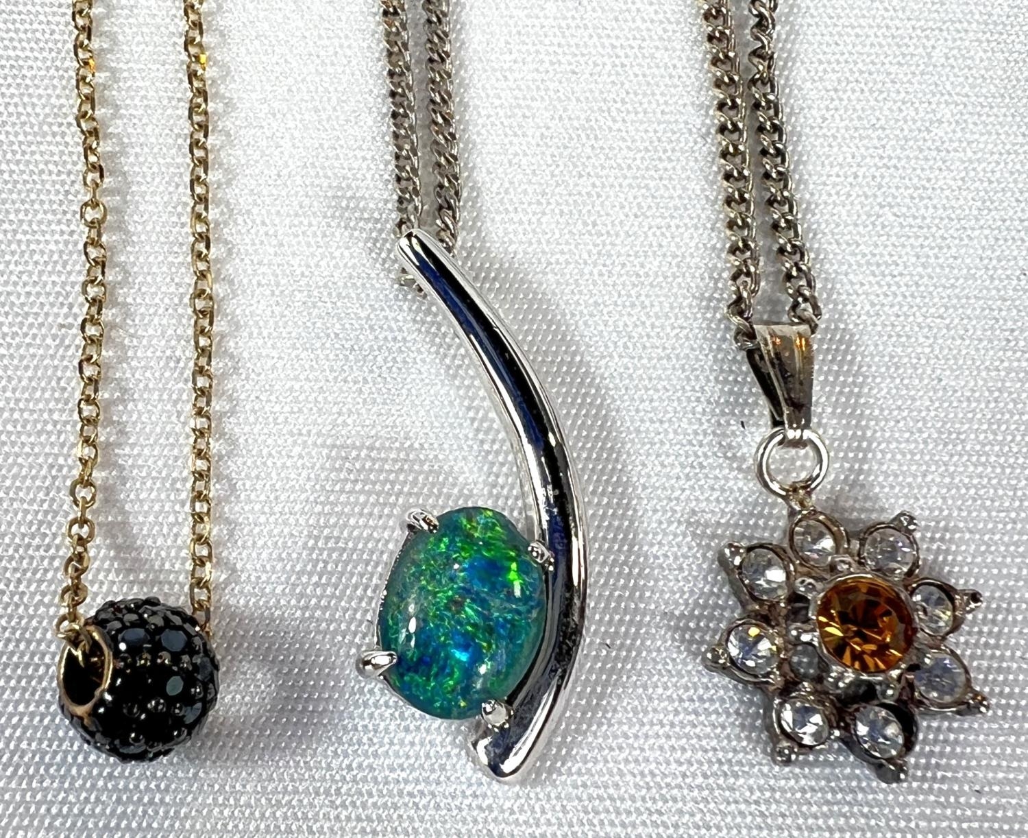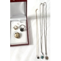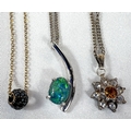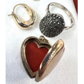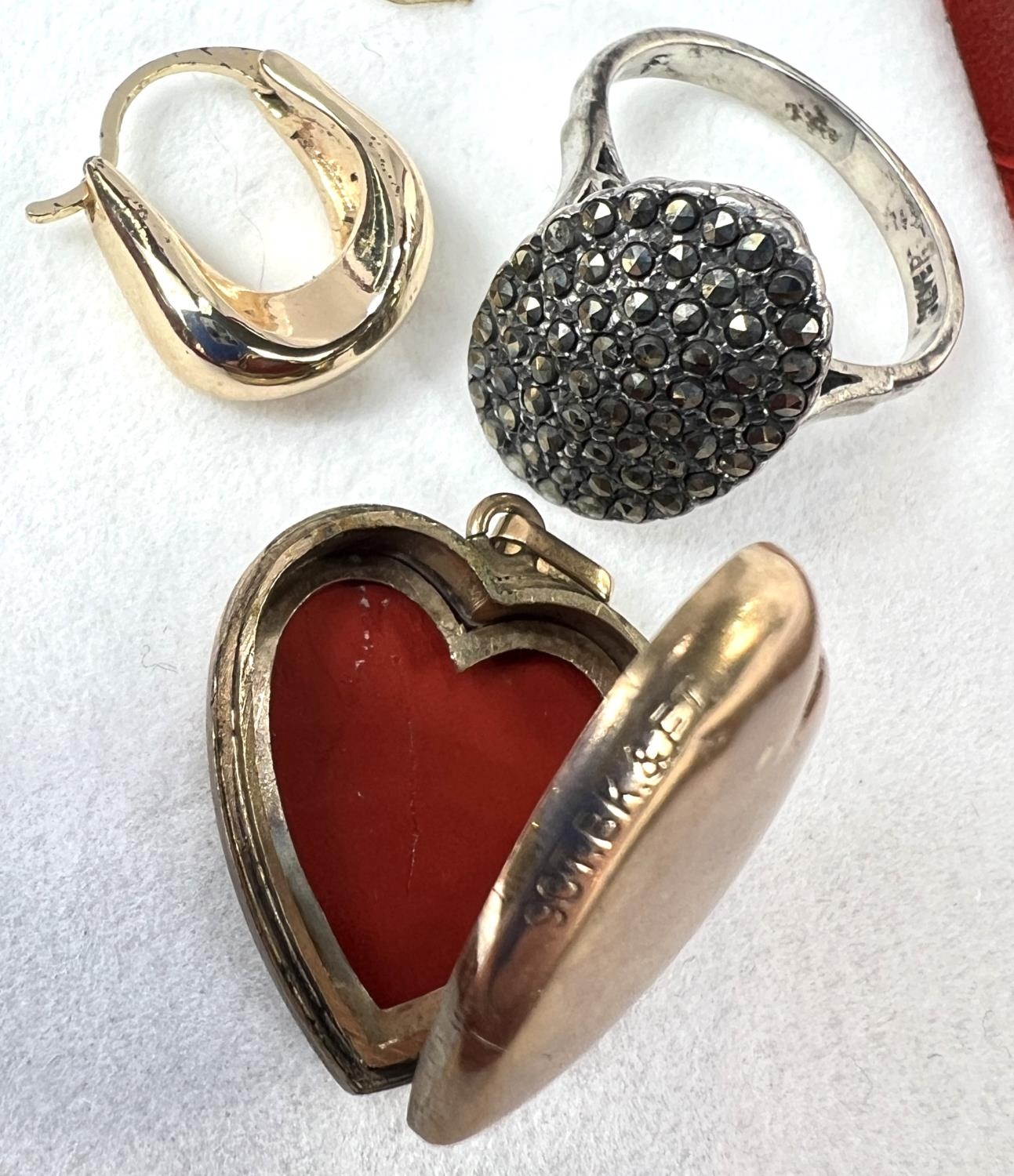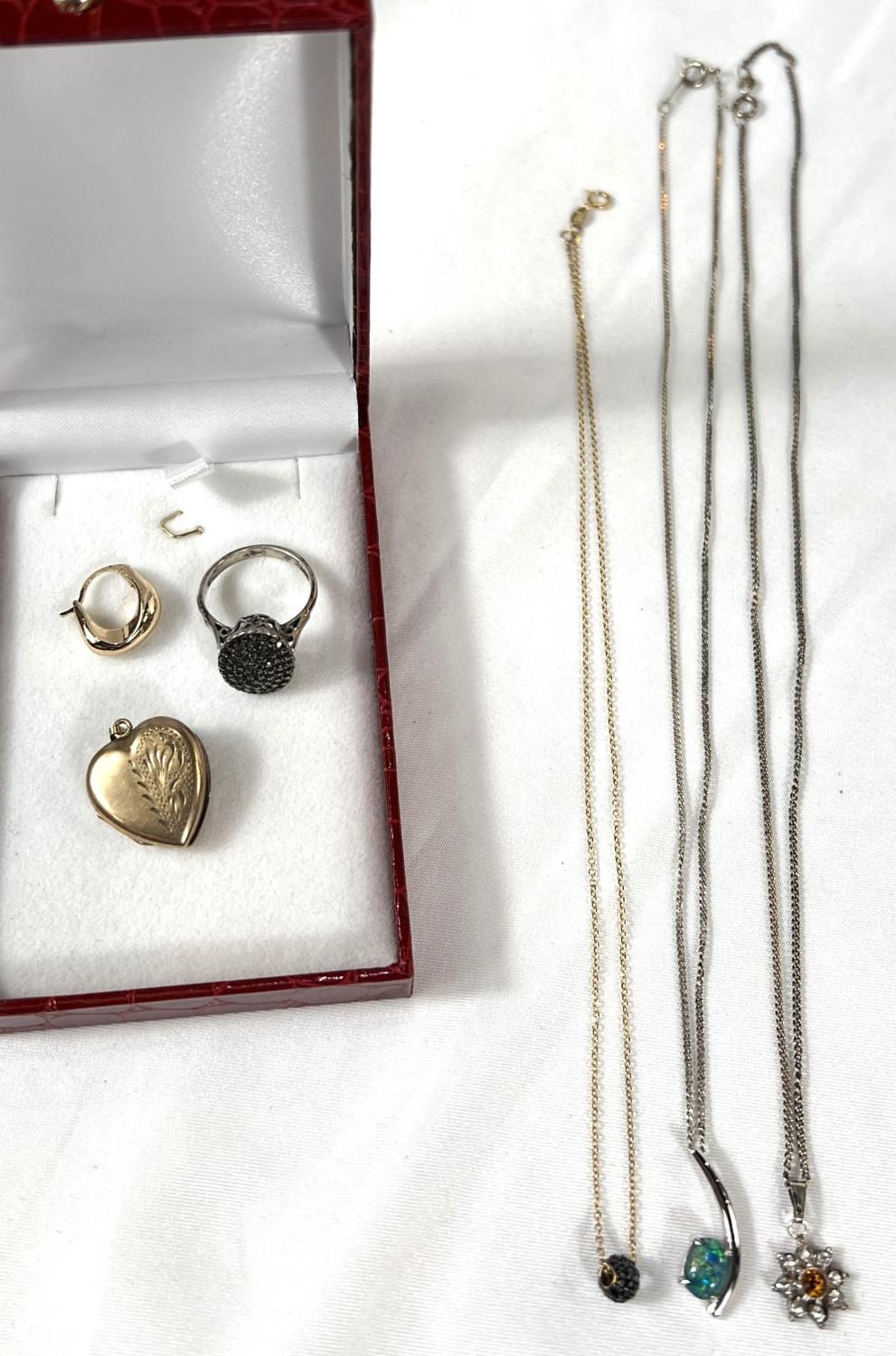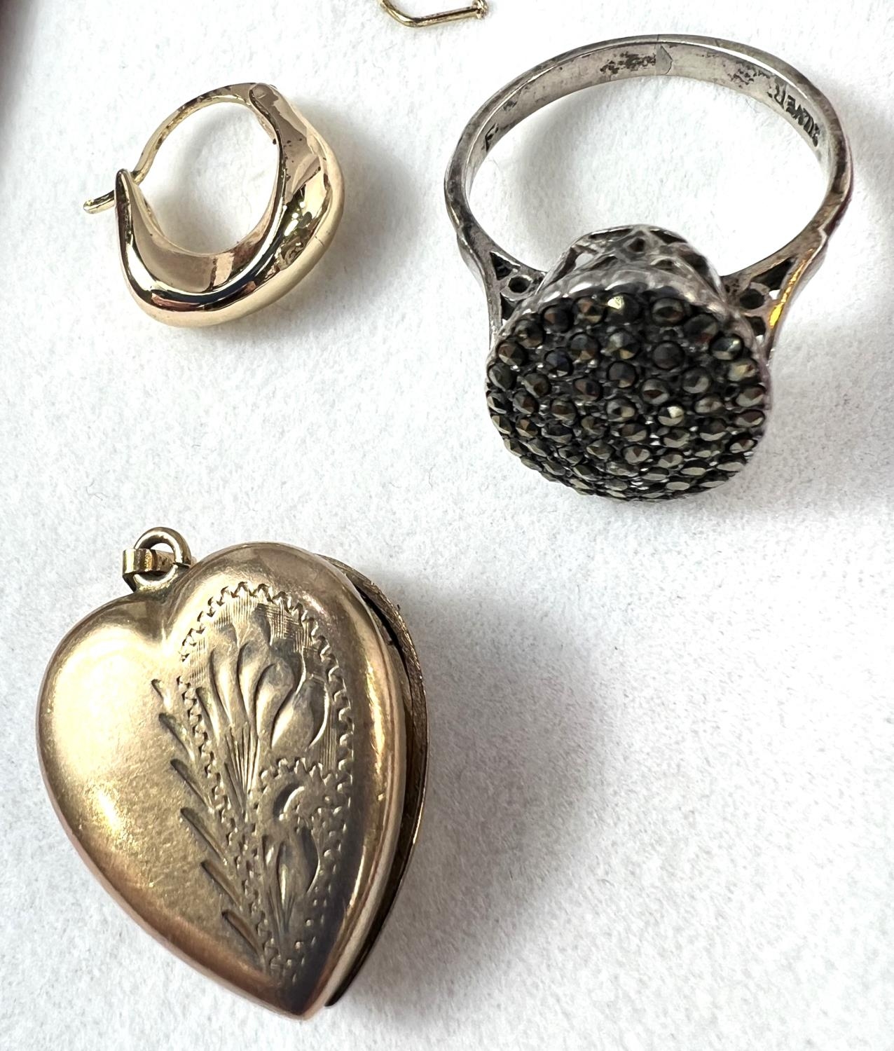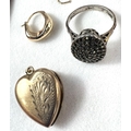 A gold plated heart shaped locket, a fine 9ct gold chain necklace with black micro stone charm; 2 necklaces with pendants and a marcasite ring.