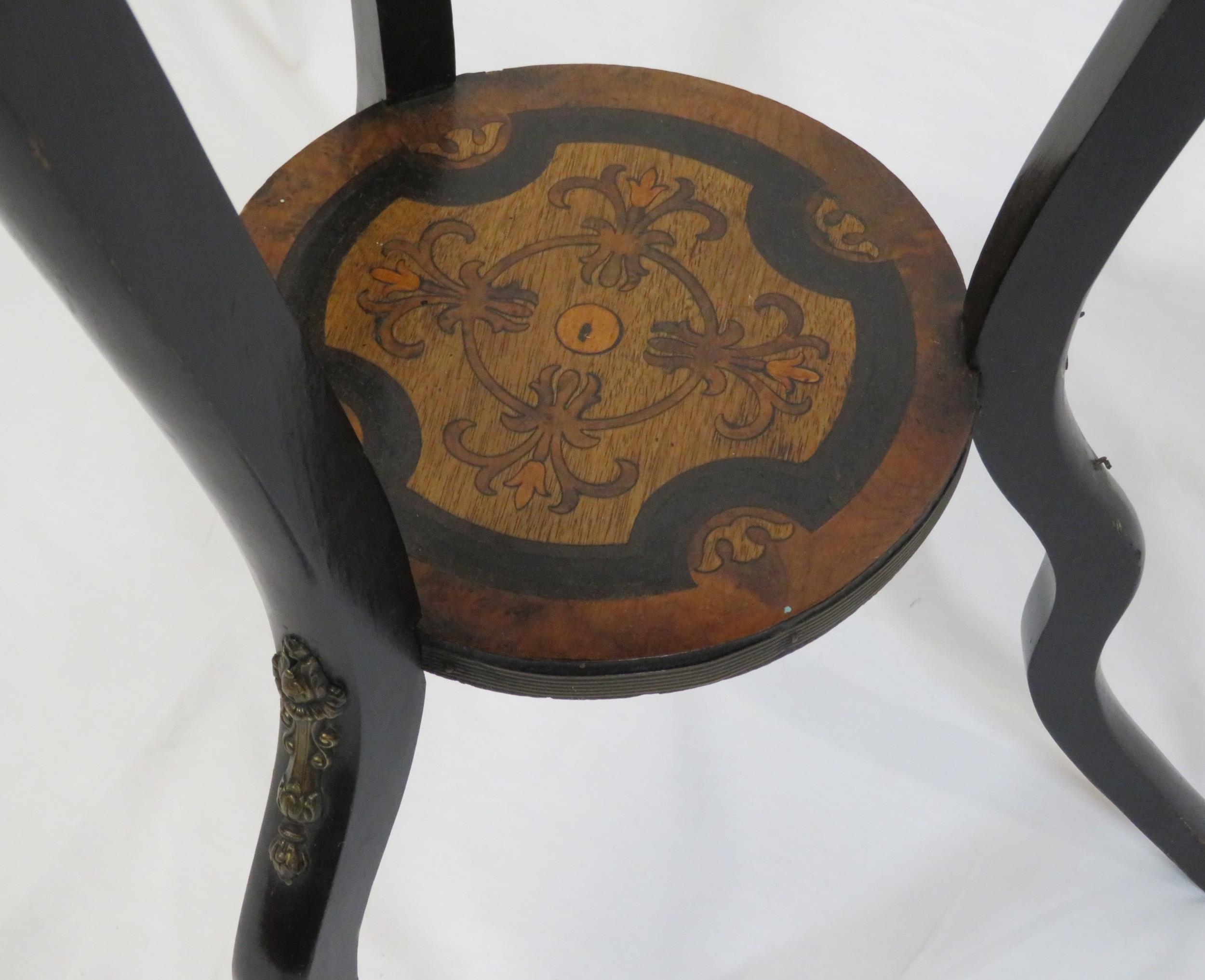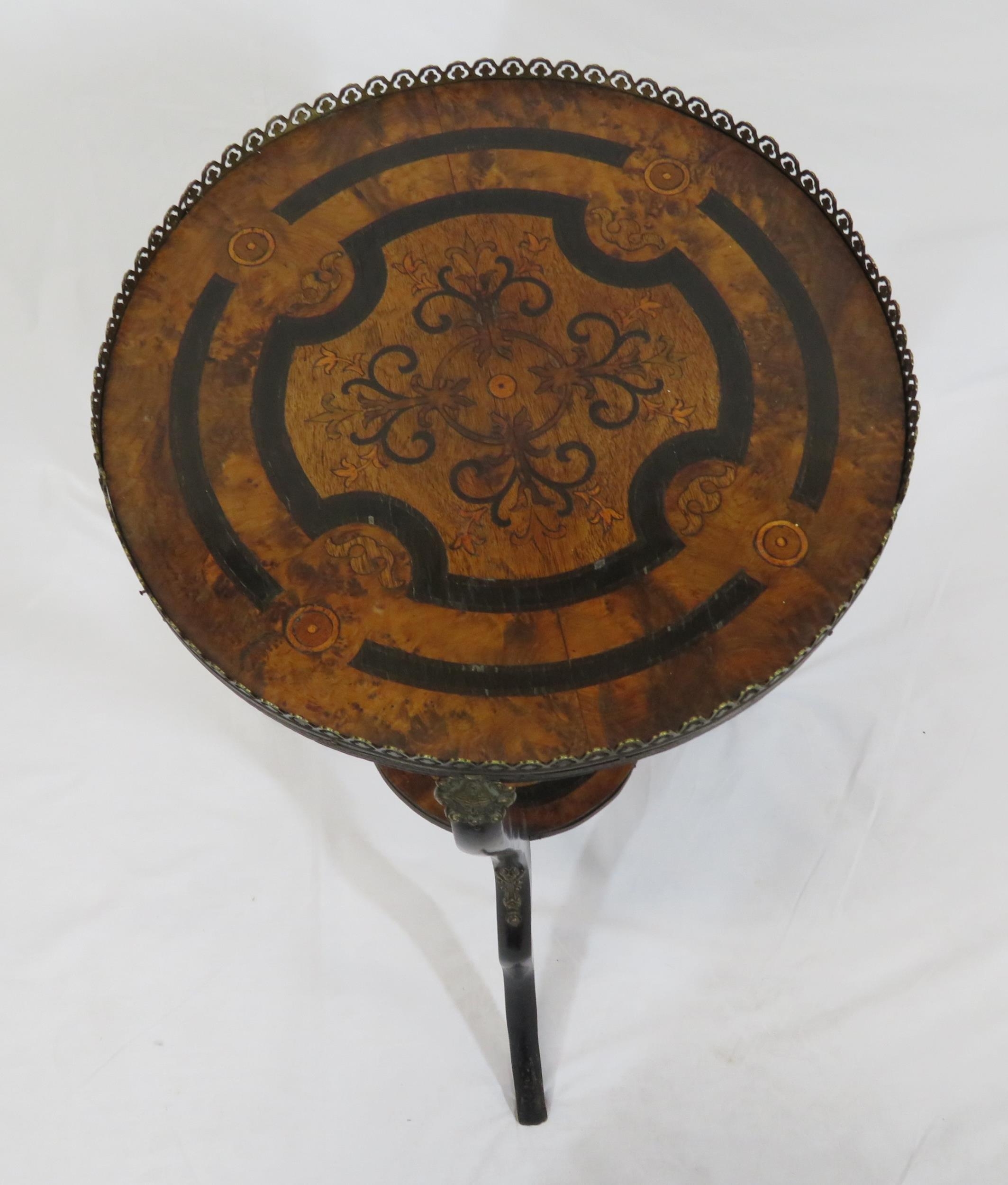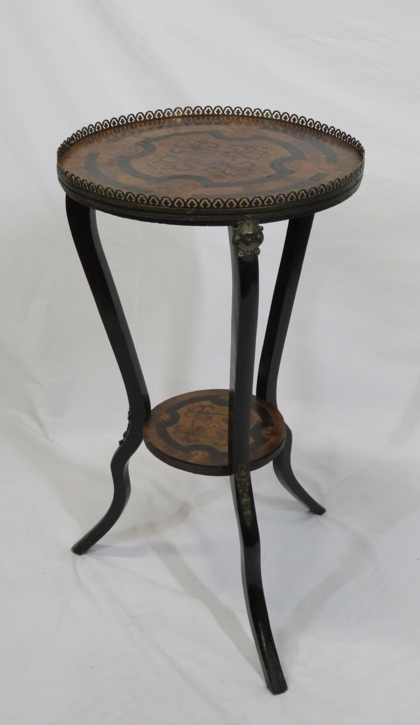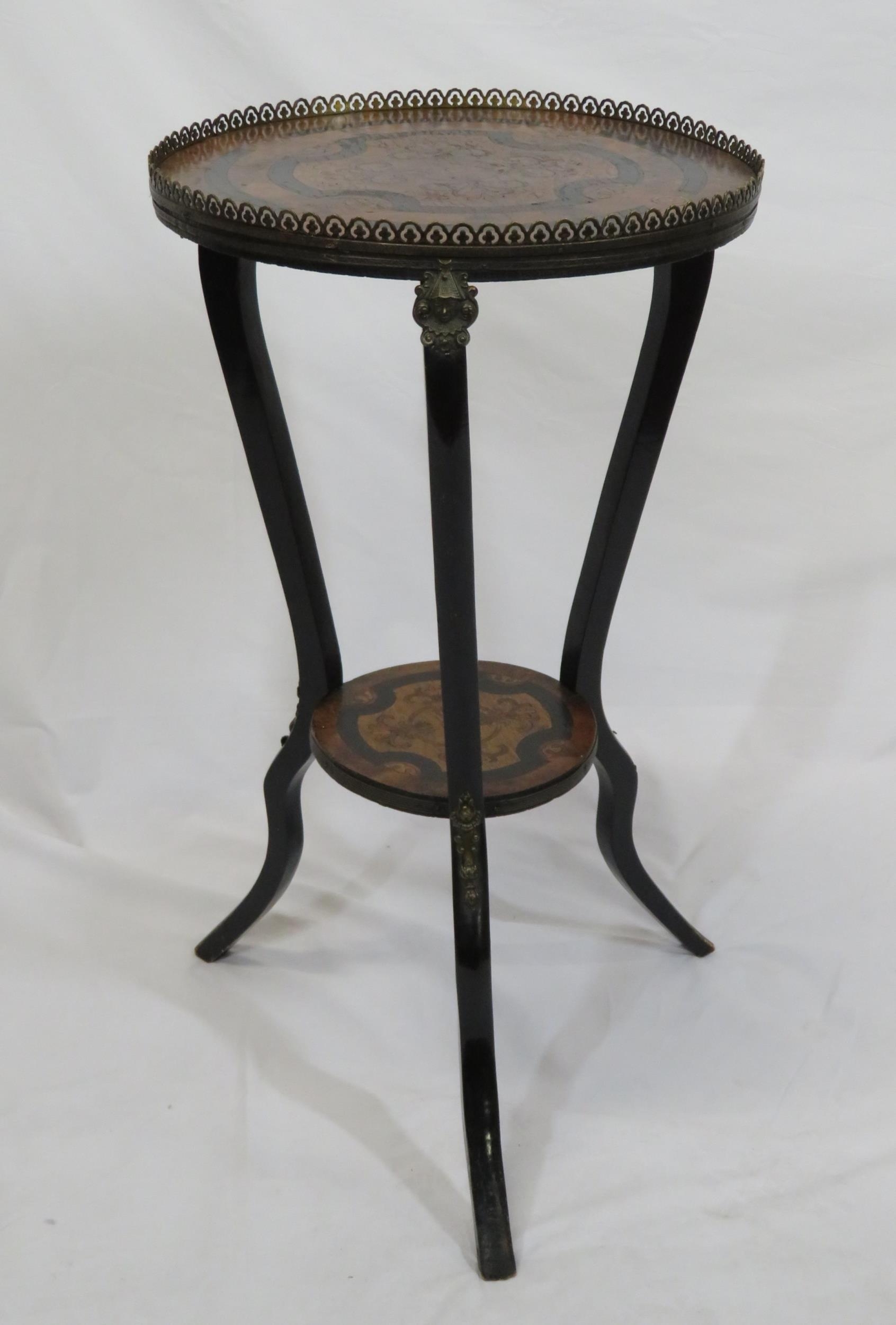 Louis XV style round two tier occasional table with pierced brass gallery, ornate foliate inlay, on shaped legs with ormolu mounts