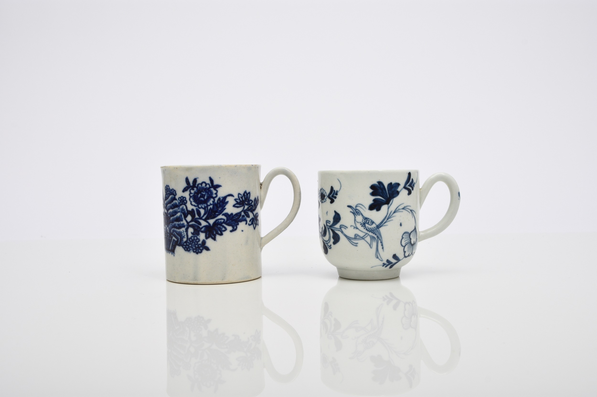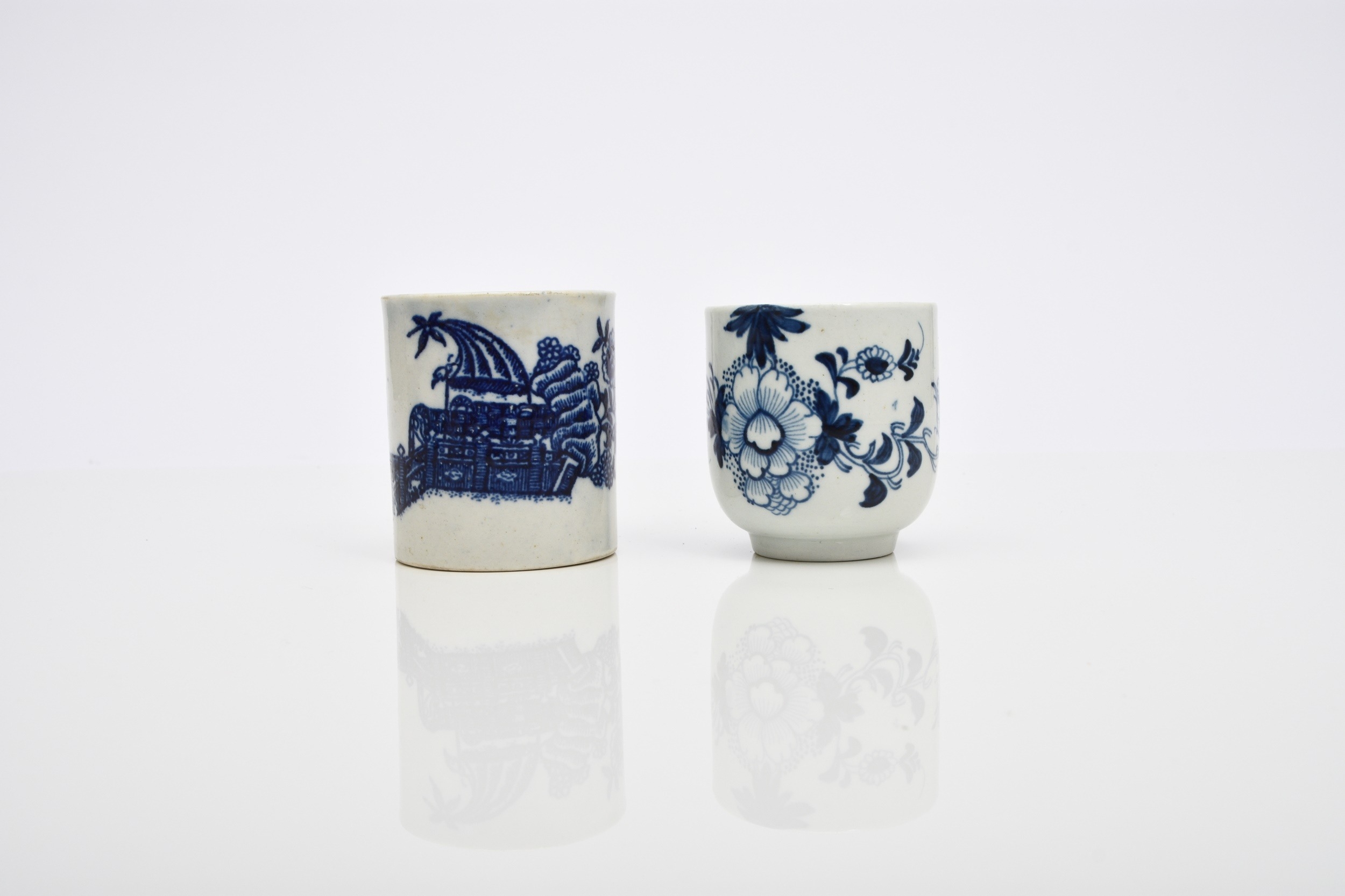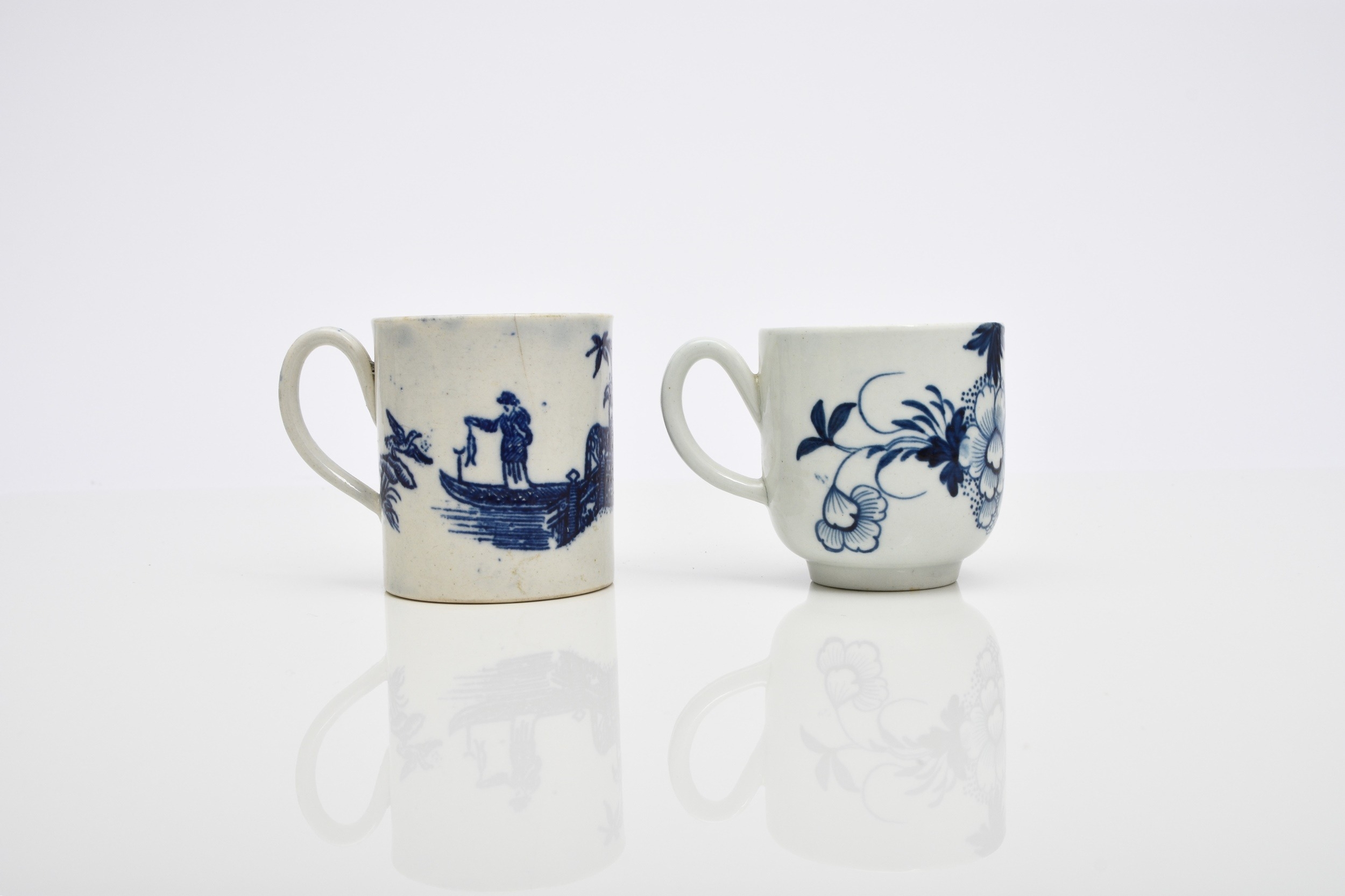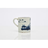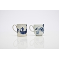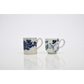 A Philip Christian (Liverpool) 'Bird on a Branch' coffee cup, circa 1766-70, painted in underglaze blue, 6cm high; sold together with a Seth Pennington and John Part 'Fisherman' coffee can, circa 1785-95, 7cm high (2) Condition:Hairline crack descending to rim of coffee can. No other damages or repairs.