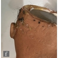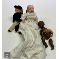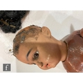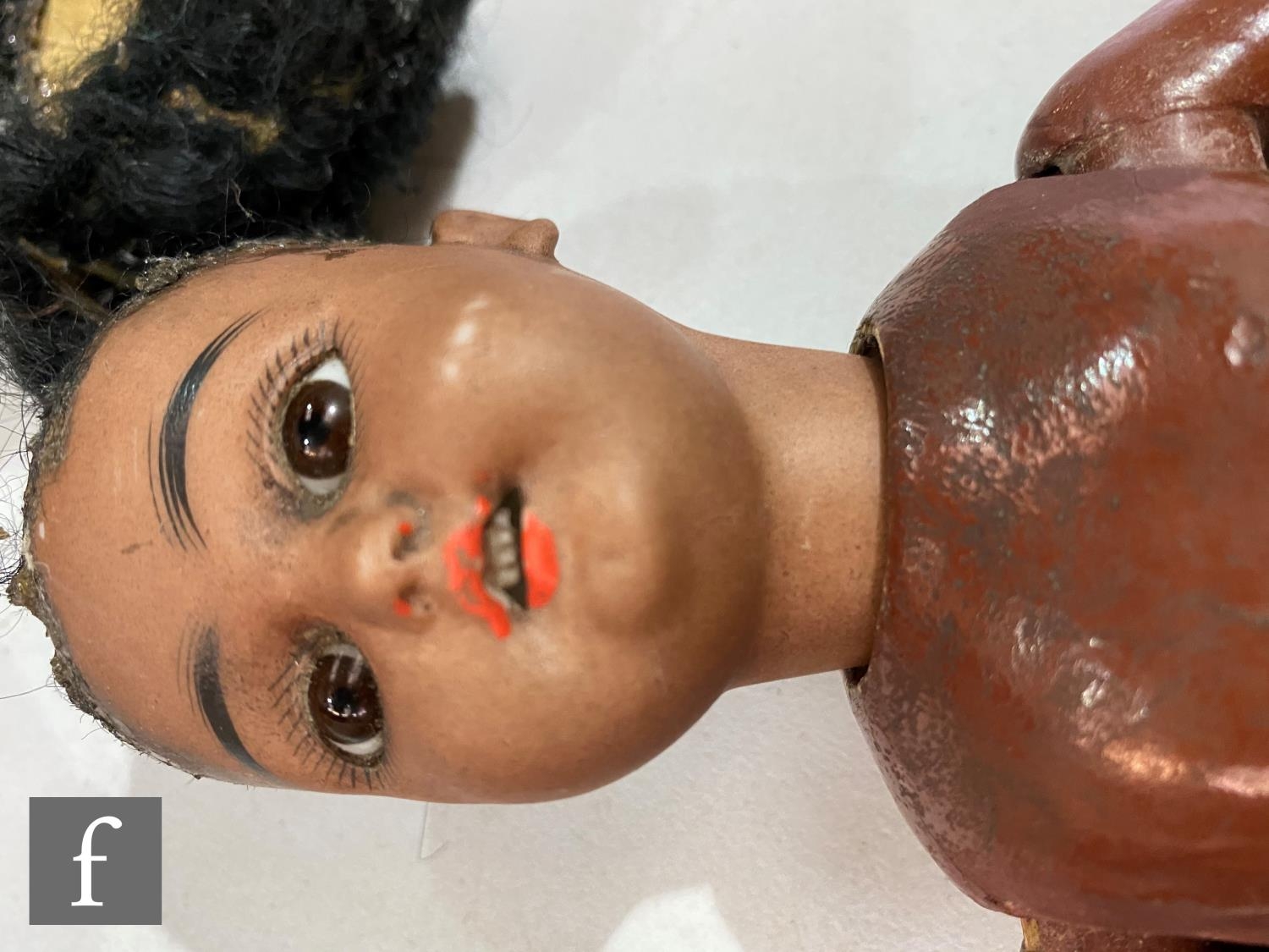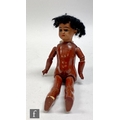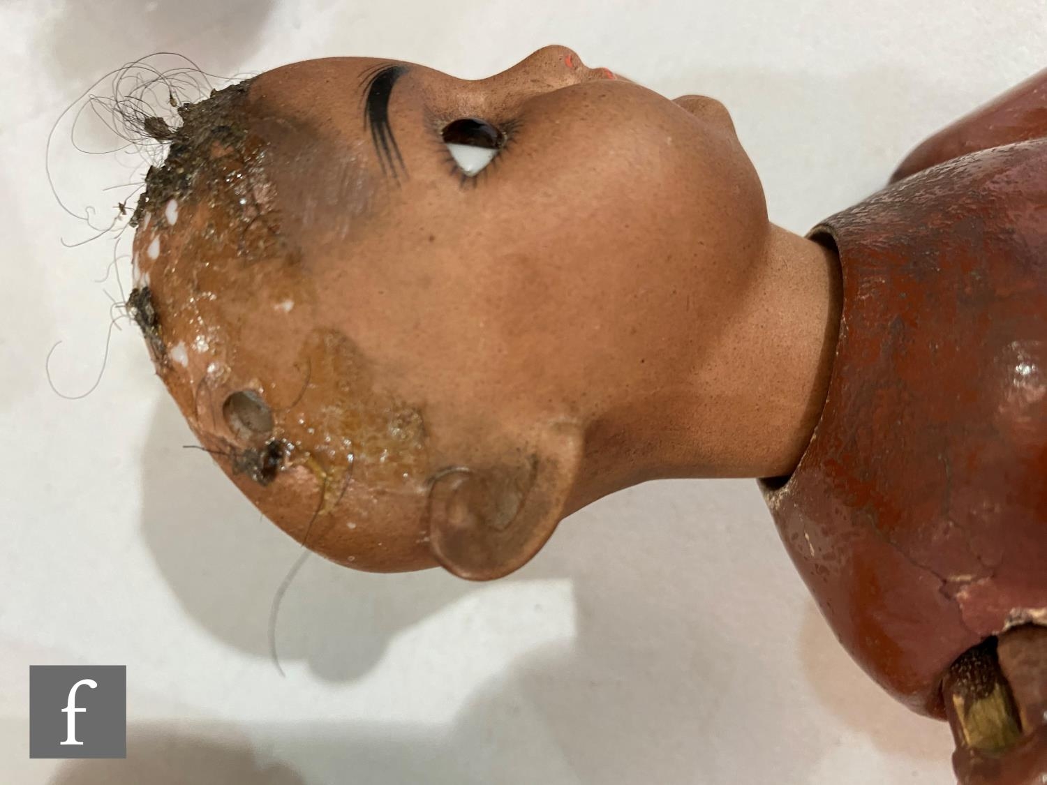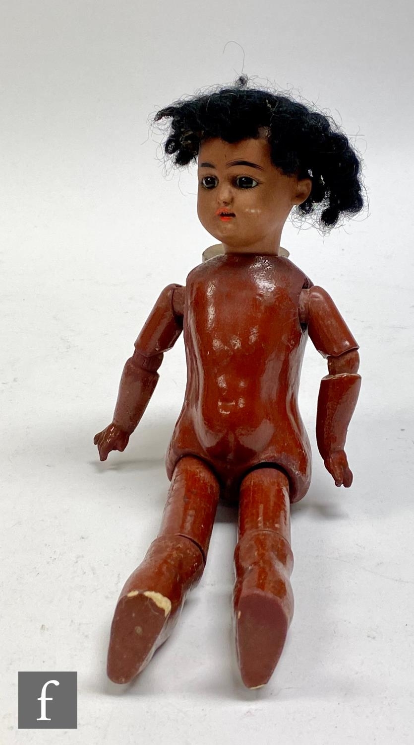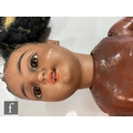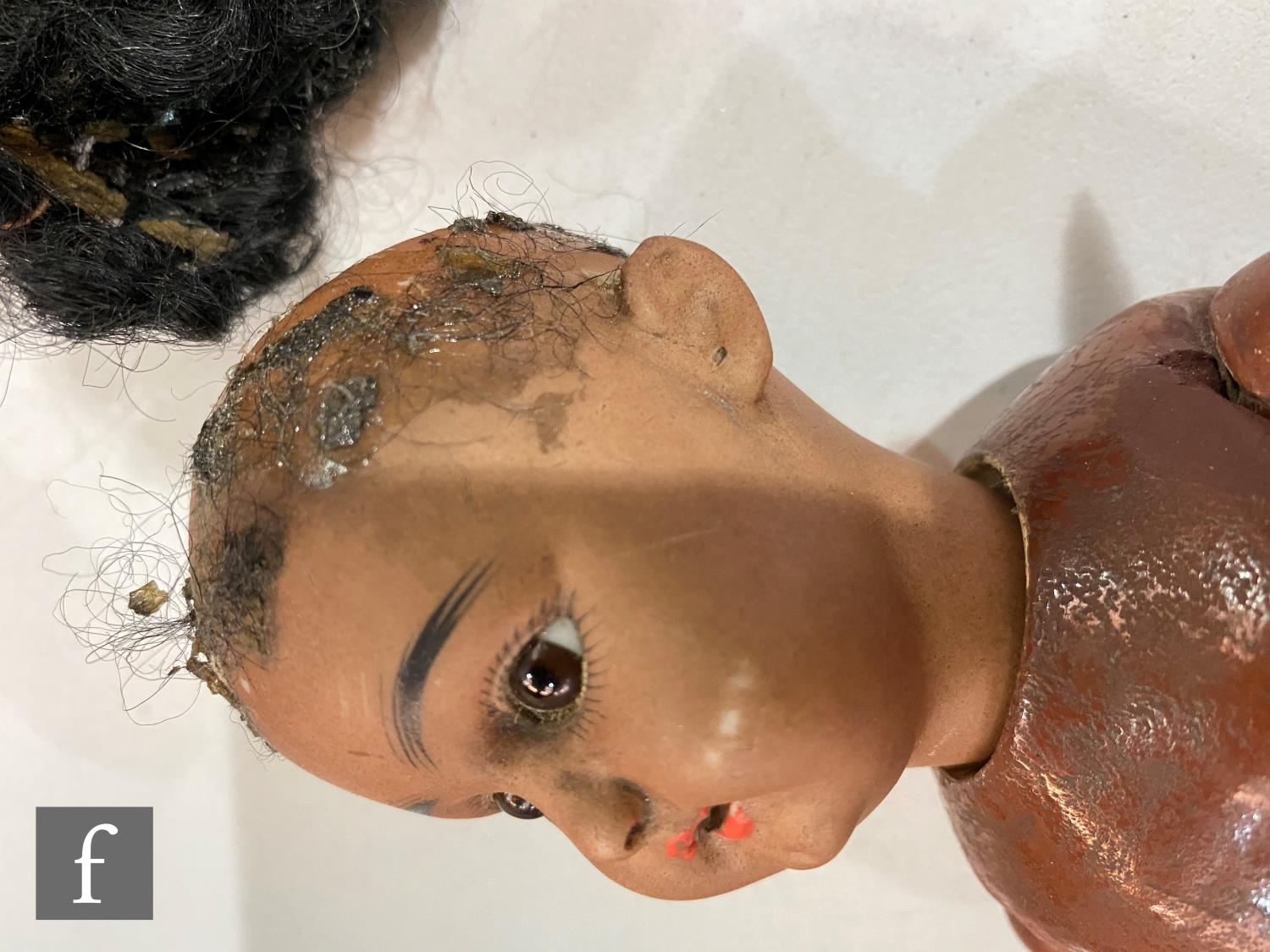 A Simon and Halbig bisque socket head black doll, with fixed brown eyes, open mouth with teeth, pierced ears, repainted features, with composition and wood jointed body, head impressed 1079 Germany S&H 2 1/2, height 28cm, S/D with some repairs.