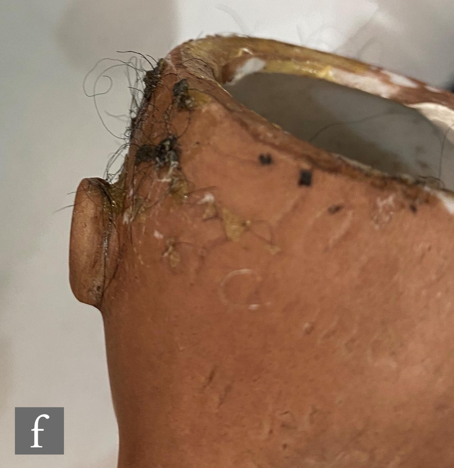 Some scratches and scuffs to face. Crack behind her left ear with glue repair. Paint flaking around top of head where wig detached. Putty or similar inside head fixing eyes in place. Evidence of new peg to attach head to body, legs appear restrung.