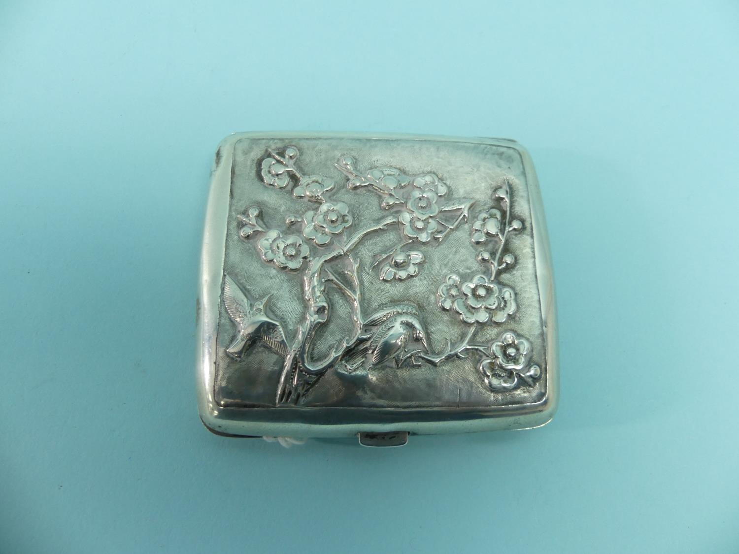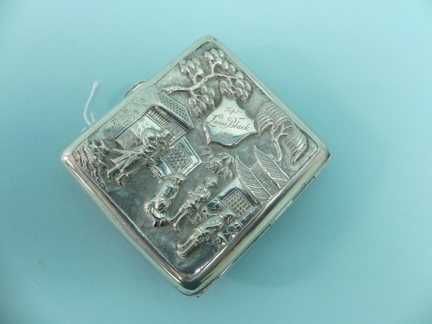 An early 20thC Chinese export silver Cigarette Case, by Taylor&Co., one side with storks amongst prunus decoration, the other with a decpiction of an execution, cartouche engraved and dated 1911, 3¼in (8.3cm) high, approx weight 3ozt.